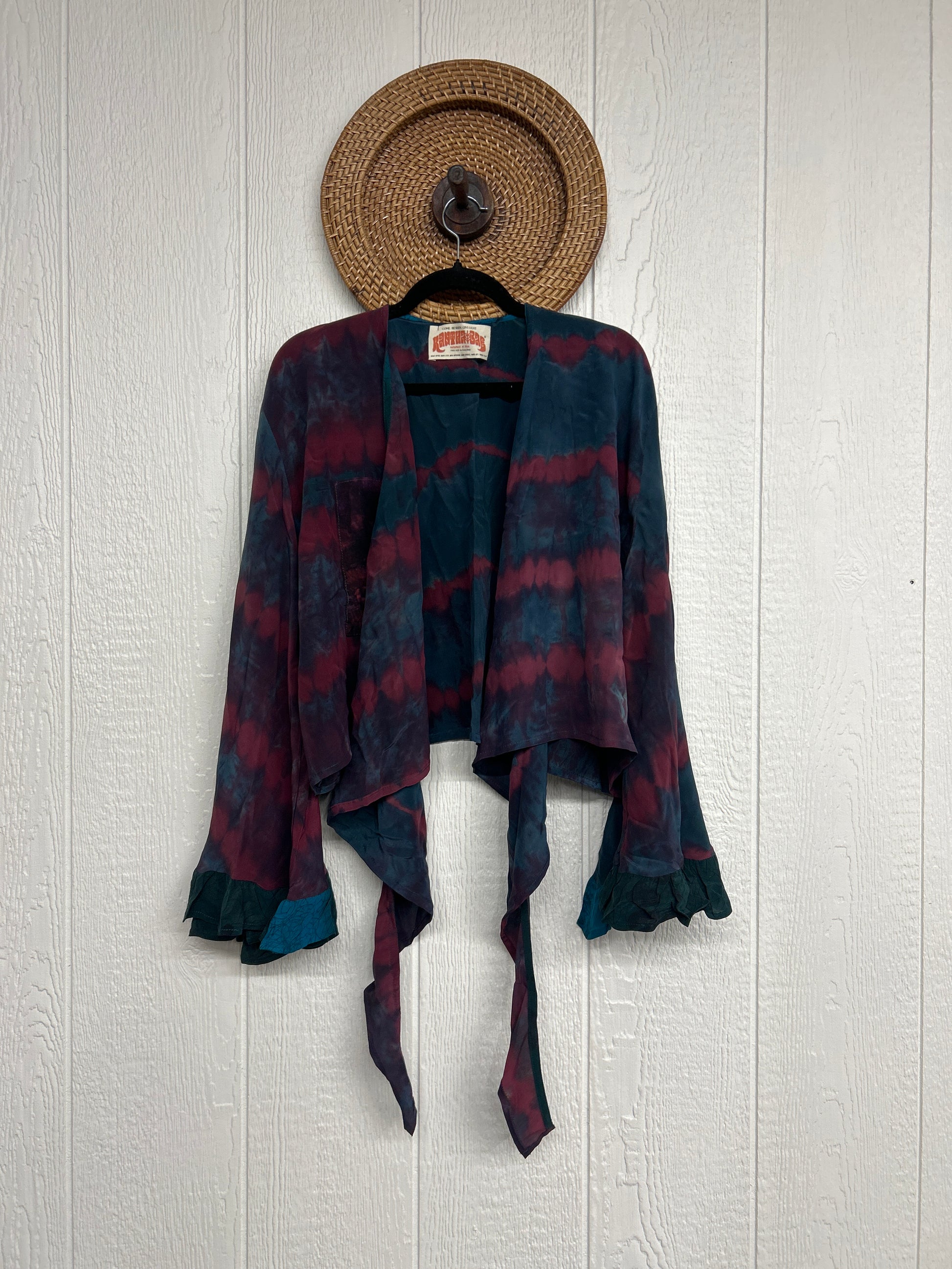 Crafted from vintage crepe sari this floaty layer features bounce bell sleeves and a tie closure long enough to wrap around your body. We know this will be one of your new favorites.