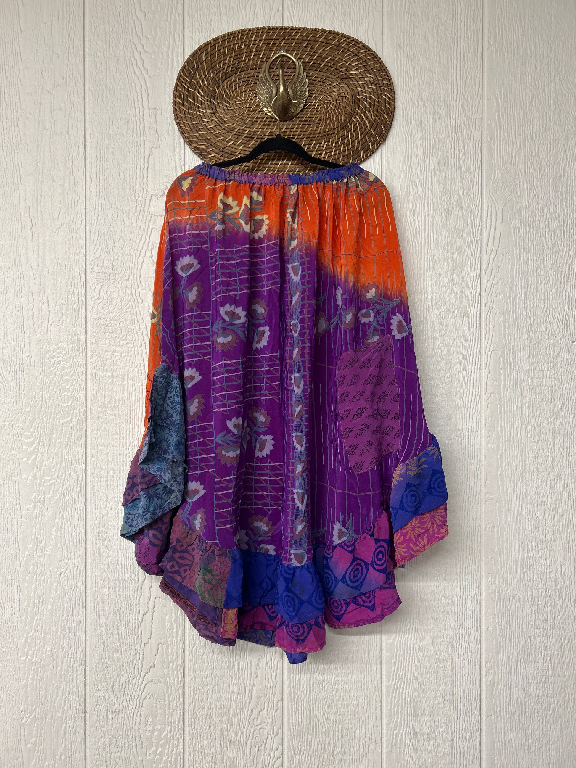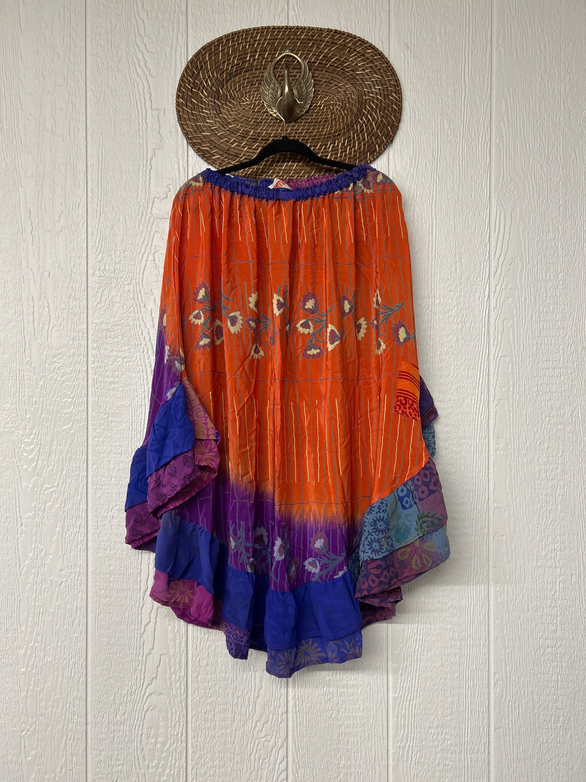 Crafted from vintage crepe sari this twirly skirt features a stretchy elastic waist and curved ruffle hem for extra dimension.