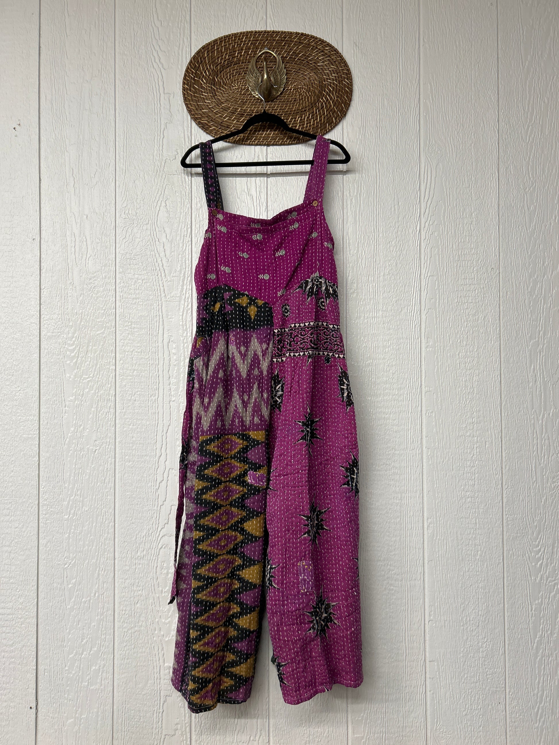 Features adjustable button straps, deep interior pockets, front bib pocket and wide flowy legs