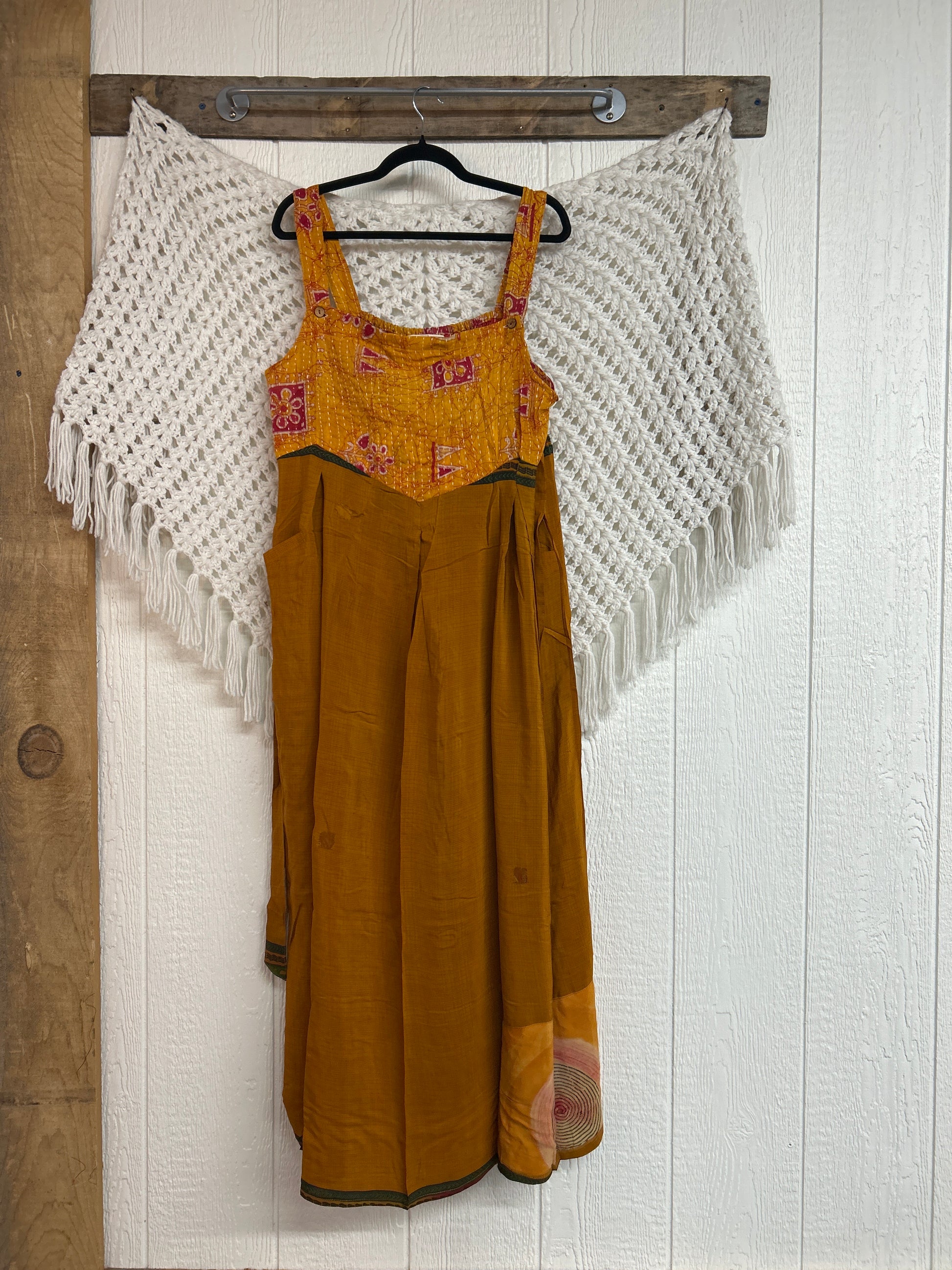 Perfect for EVERY season this overall dress features a kantha bib front with center pocket, adjustable button straps, tie back, crepe skirt and interior pockets on the skirt.
