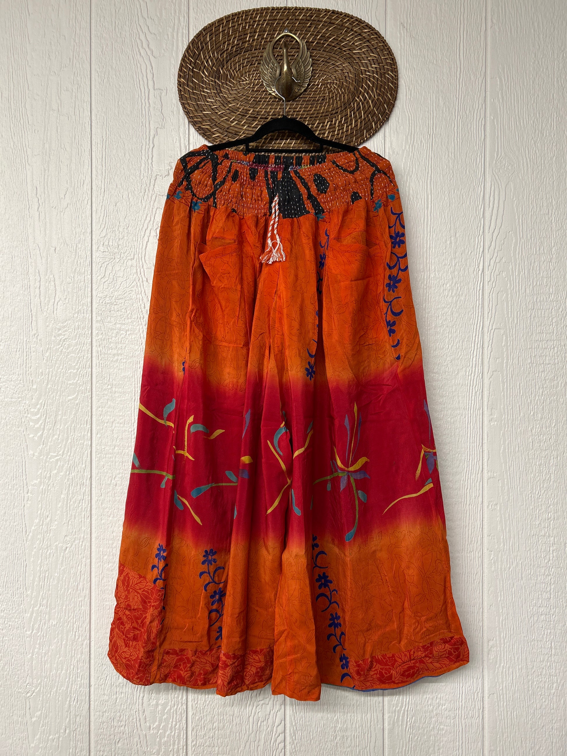 Crafted from vintage double crepe sari these pants feature wide legs, pleating, exterior and interior pockets making them fully reversible, and a stretchy waistband with a drawstring.