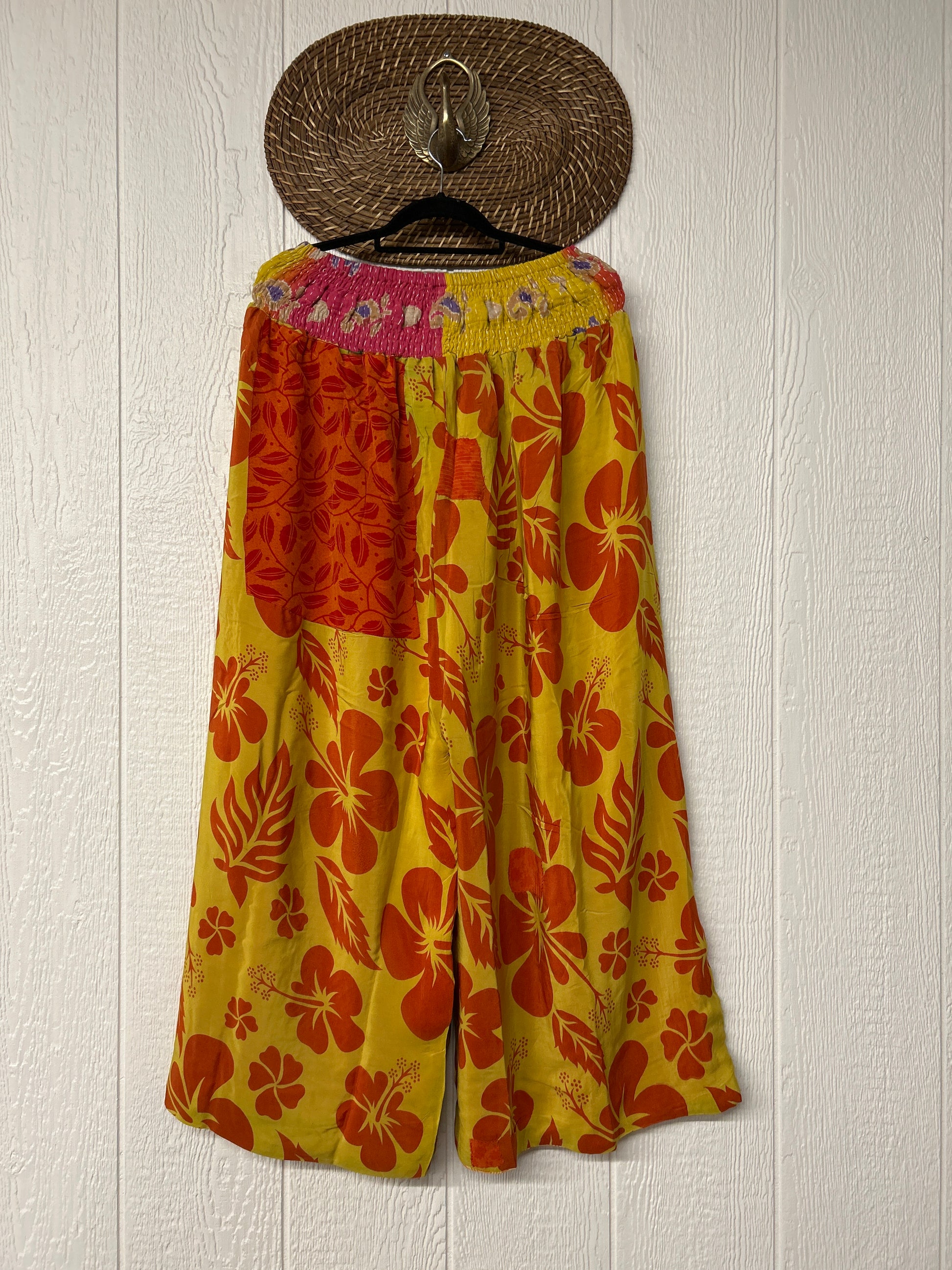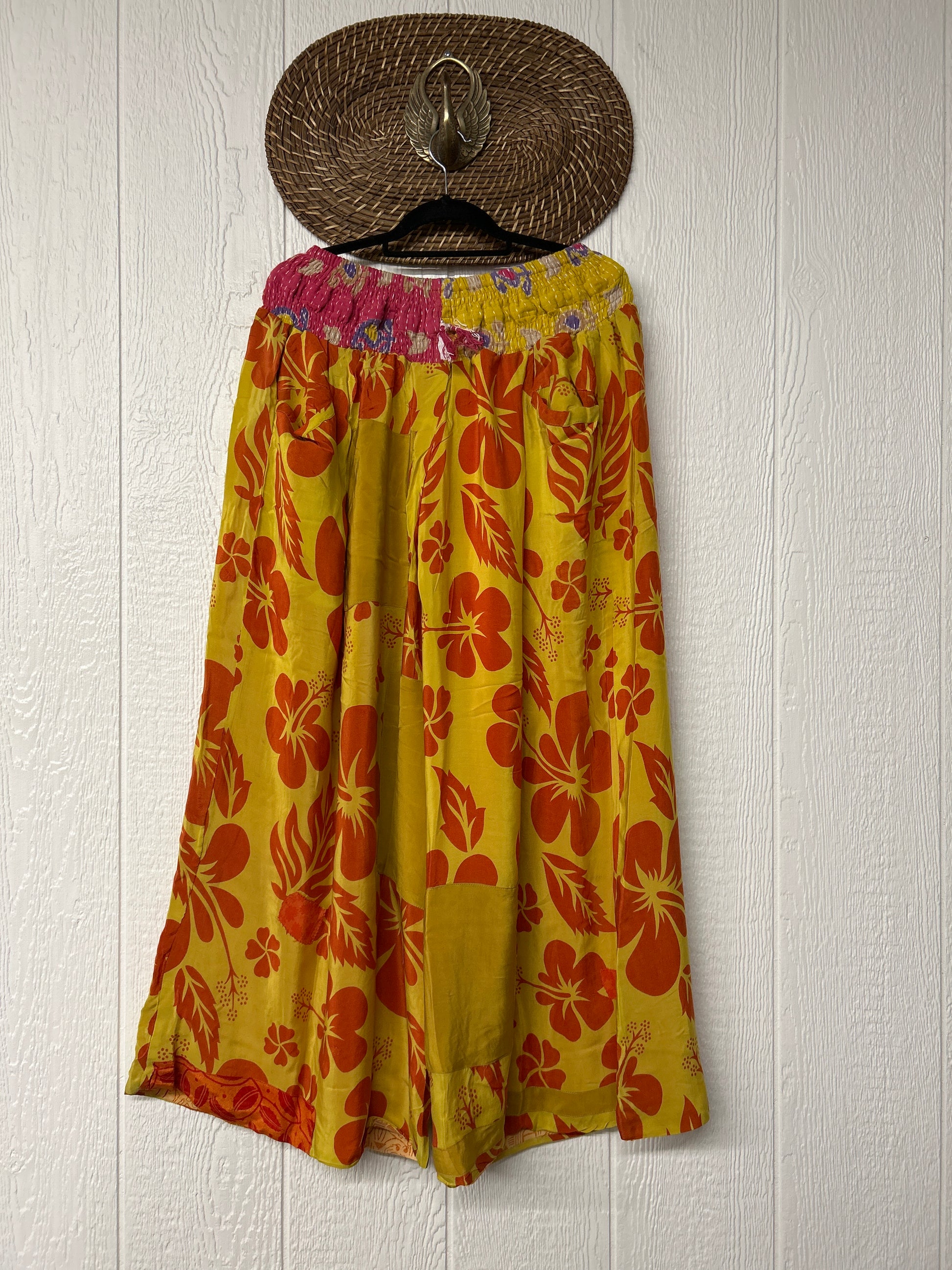Crafted from vintage double crepe sari these pants feature wide legs, pleating, exterior and interior pockets making them fully reversible, and a stretchy waistband with a drawstring.