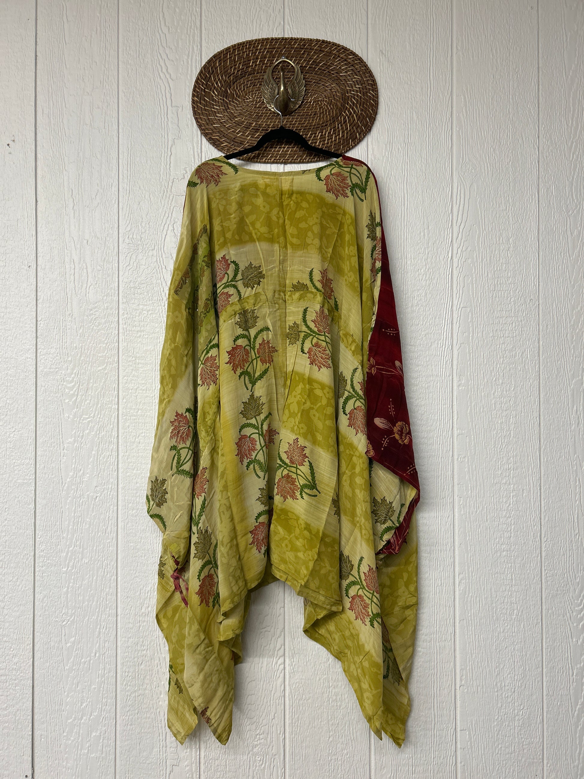 Fabrics may have small threads or holes in the layers. Color inconsistency or small stains may be present. The saris are sewn together and extend the life of each design.