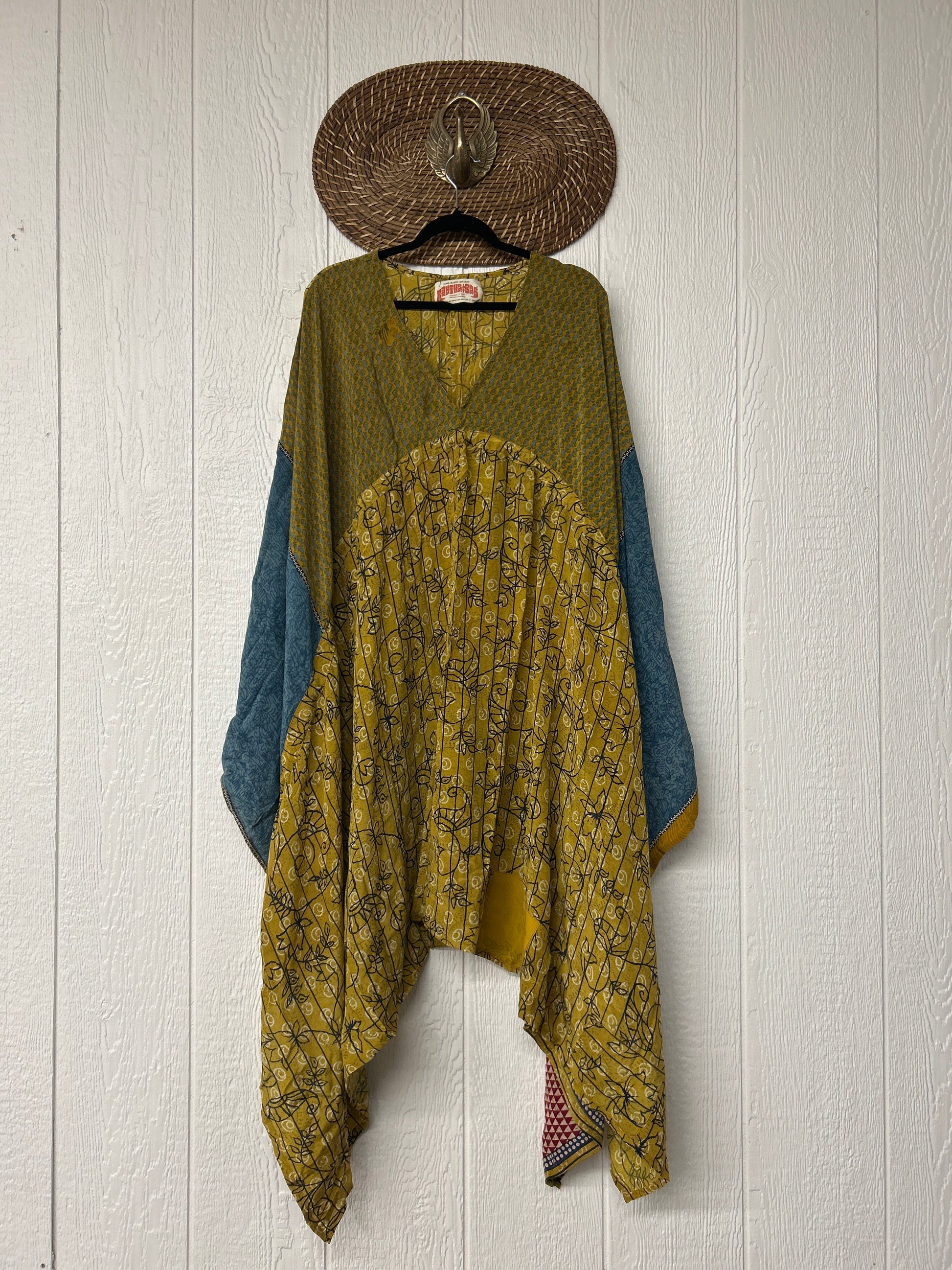 Fabrics may have small threads or holes in the layers. Color inconsistency or small stains may be present. The saris are sewn together and extend the life of each design.