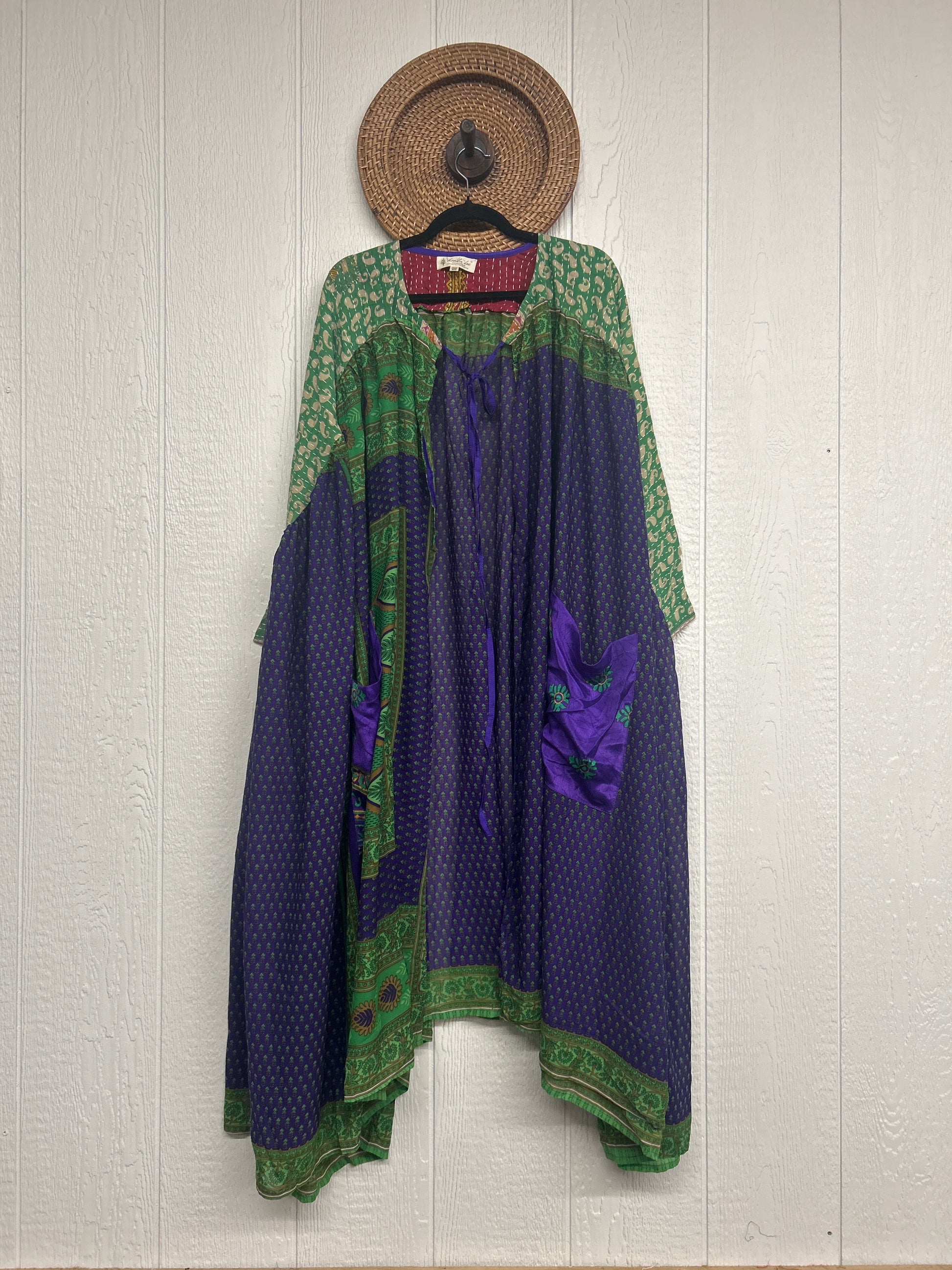 Twirl around to your heart's delight in our new Fleetwood Kimono. This floaty dream is a divine mix of our ultra lux Kantha embroidered vintage cotton and rasgulla sari. Features a tie neck closure and slouchy exterior pockets.