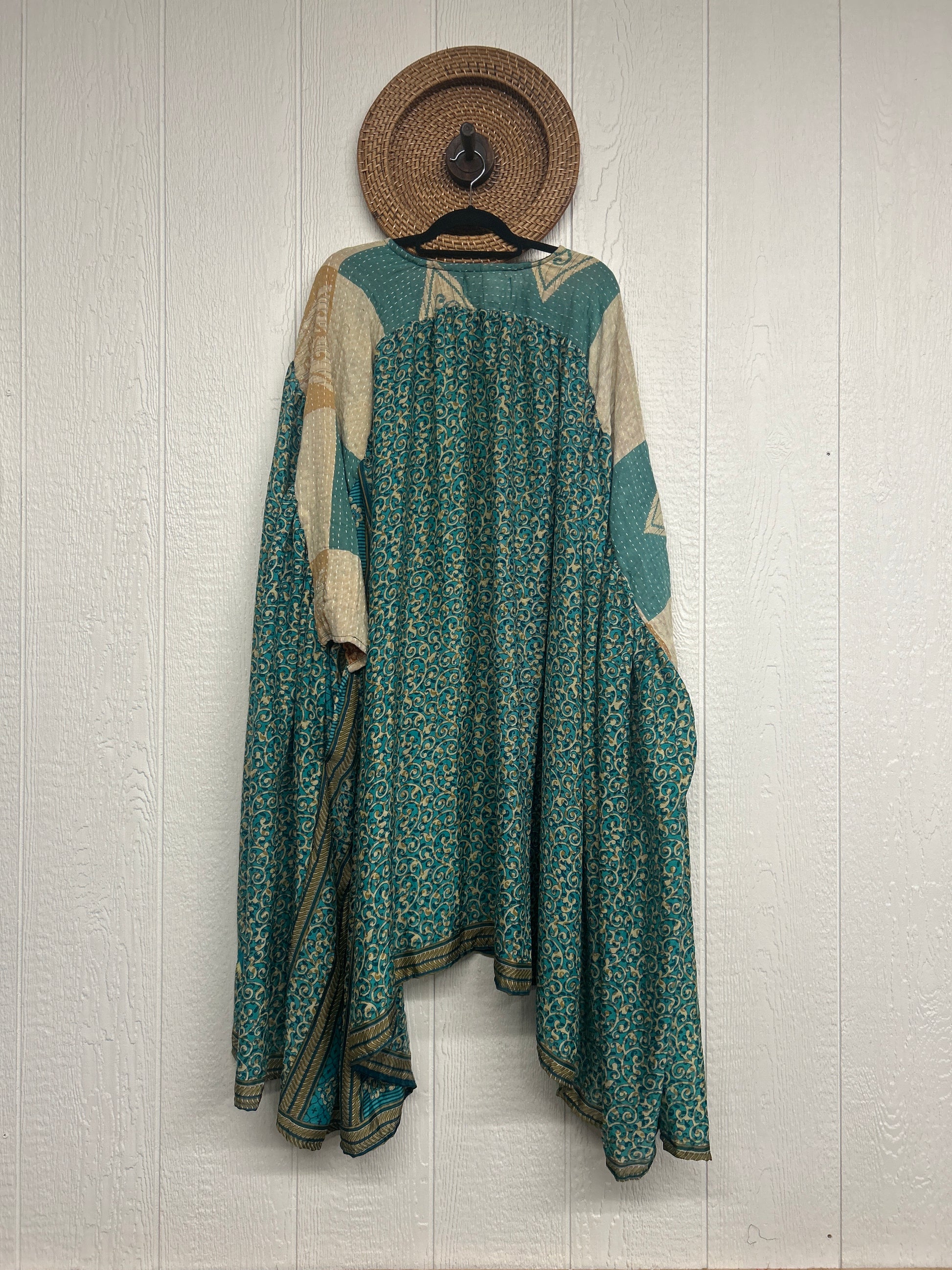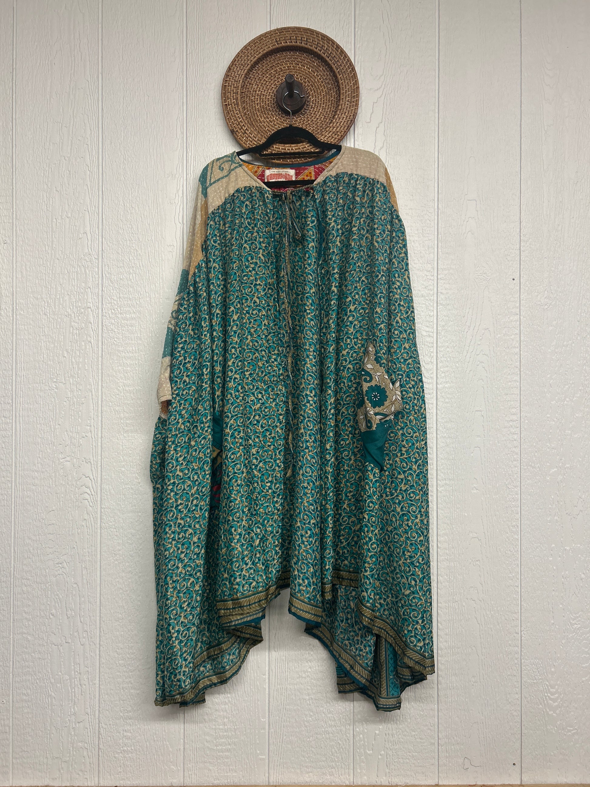 Twirl around to your heart's delight in our new Fleetwood Kimono. This floaty dream is a divine mix of our ultra lux Kantha embroidered vintage cotton and rasgulla sari. Features a tie neck closure and slouchy exterior pockets.