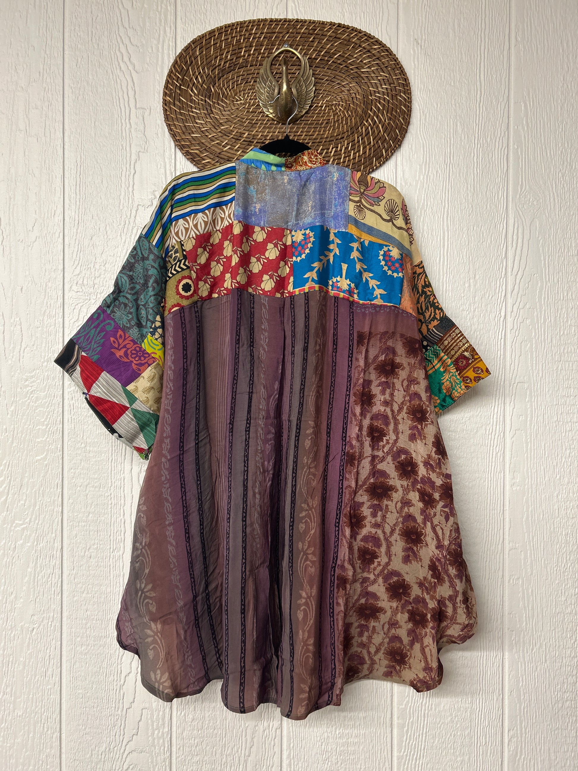 Made from hand-stitched patchwork vintage crepe sari, this billowy dream is fully lined in the front with cotton sari. Features a crepe panel in the back, functional buttons, two slouchy pockets in the front, and a curved bottom.