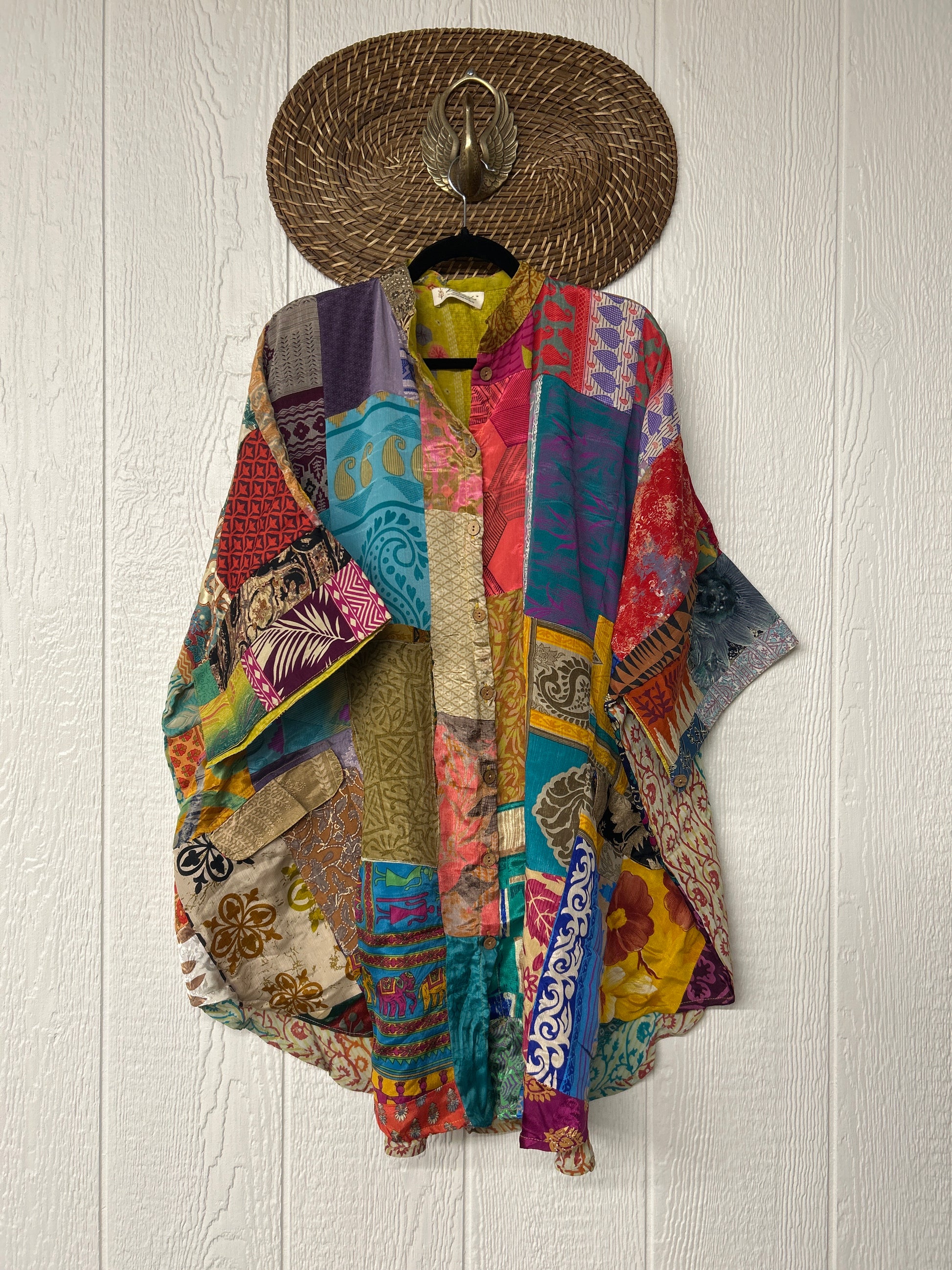 Made from hand-stitched patchwork vintage crepe sari, this billowy dream is fully lined in the front with cotton sari. Features a crepe panel in the back, functional buttons, two slouchy pockets in the front, and a curved bottom.