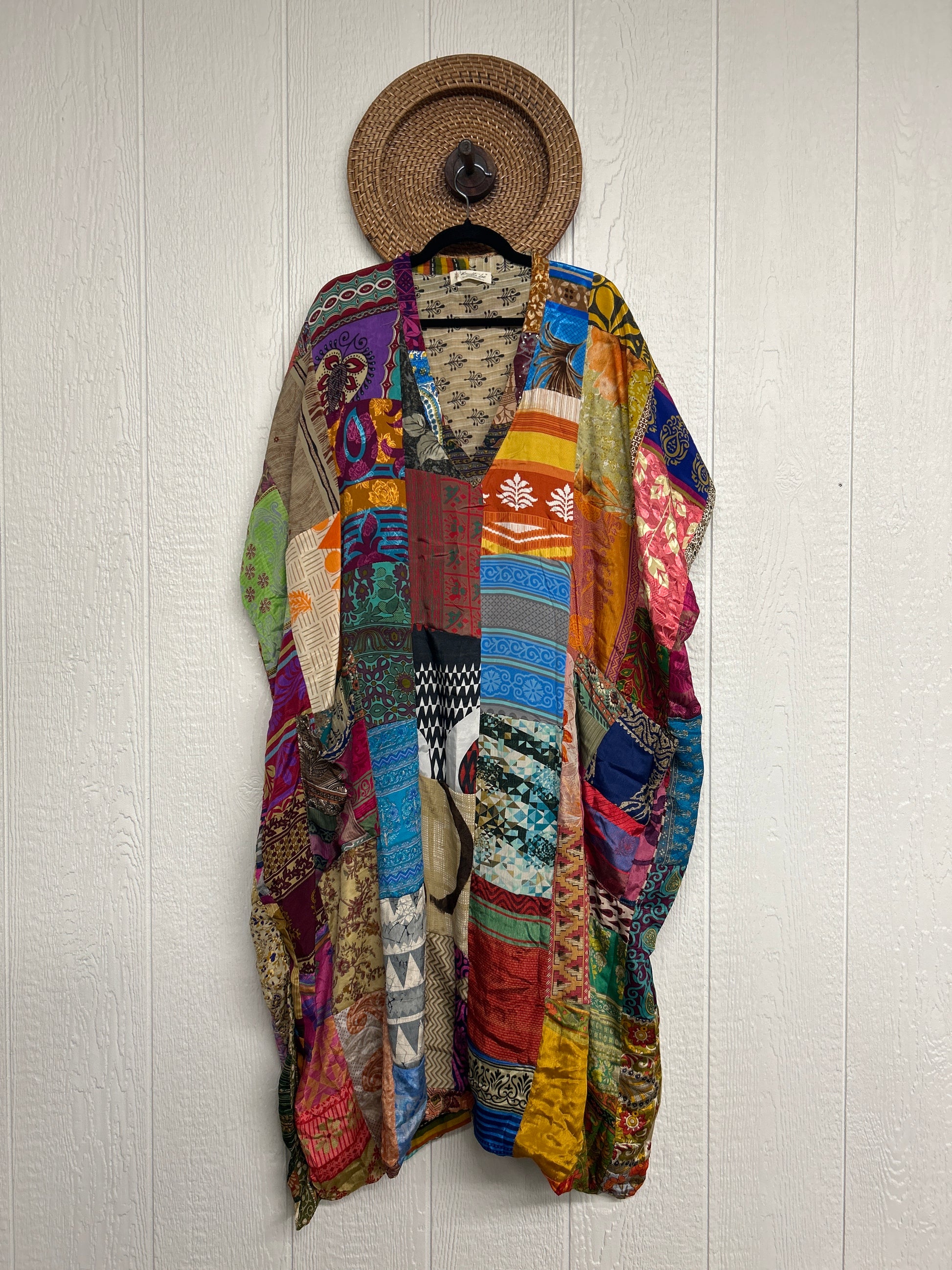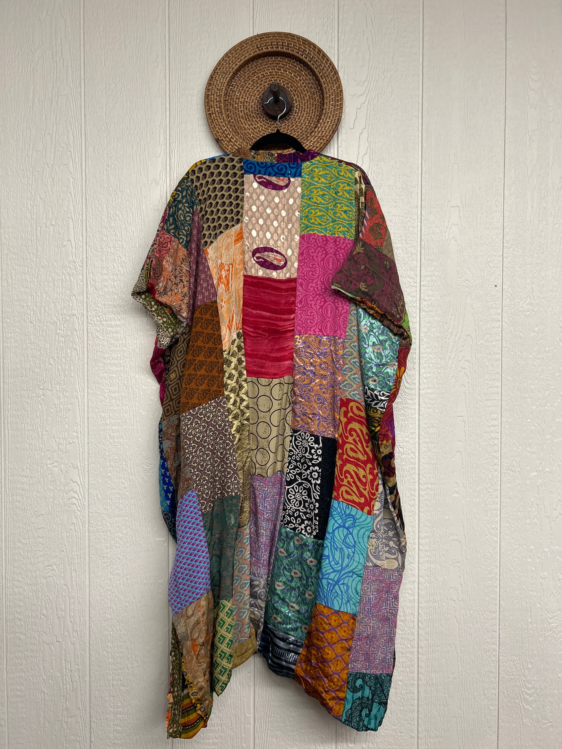 Patchwork outer garment is made from upcycled vintage rasgulla and crepe and fully lined in printed cotton sari. Features slouchy outer pockets, a v neckline and side slits for extra dimension.
