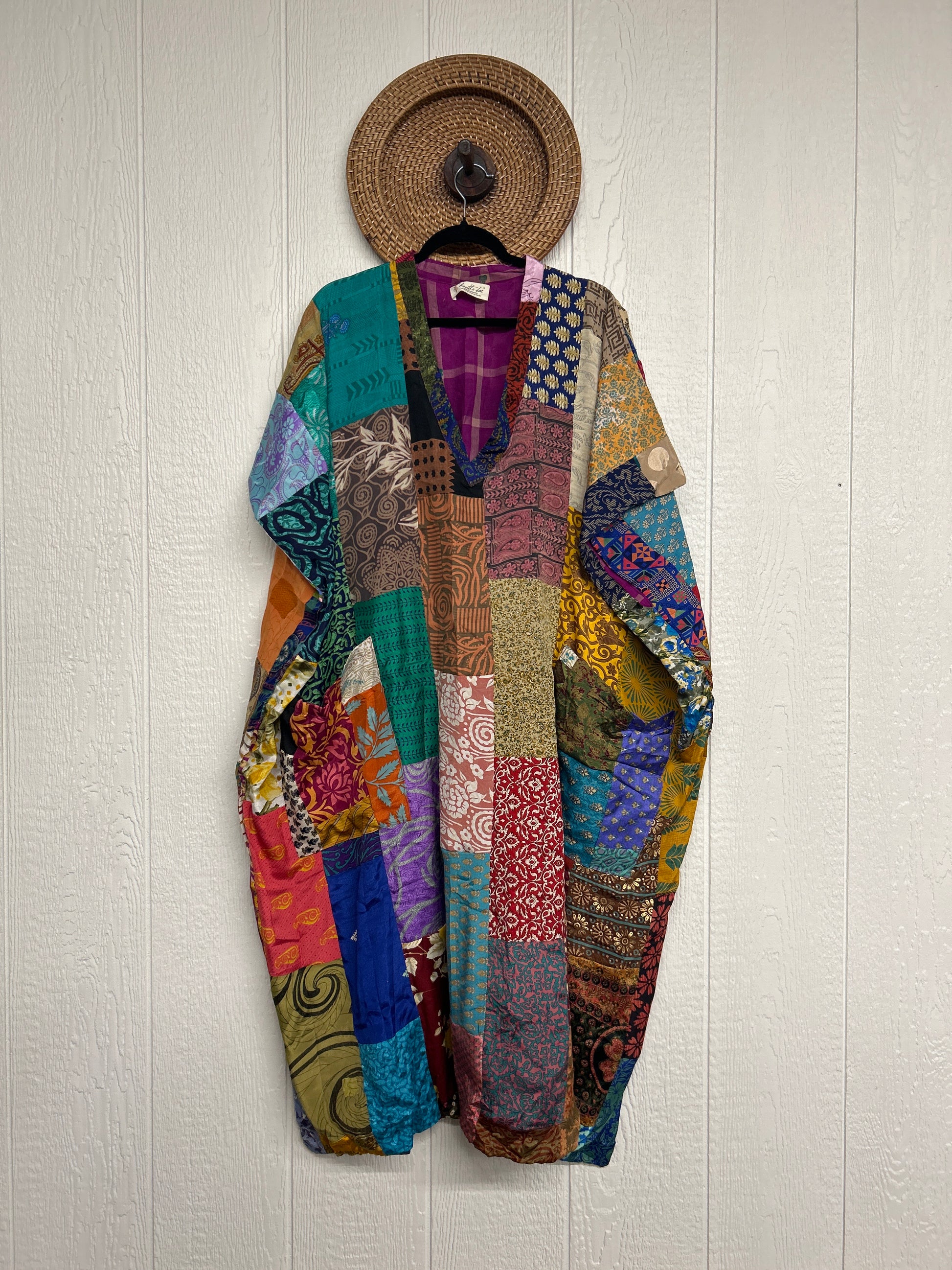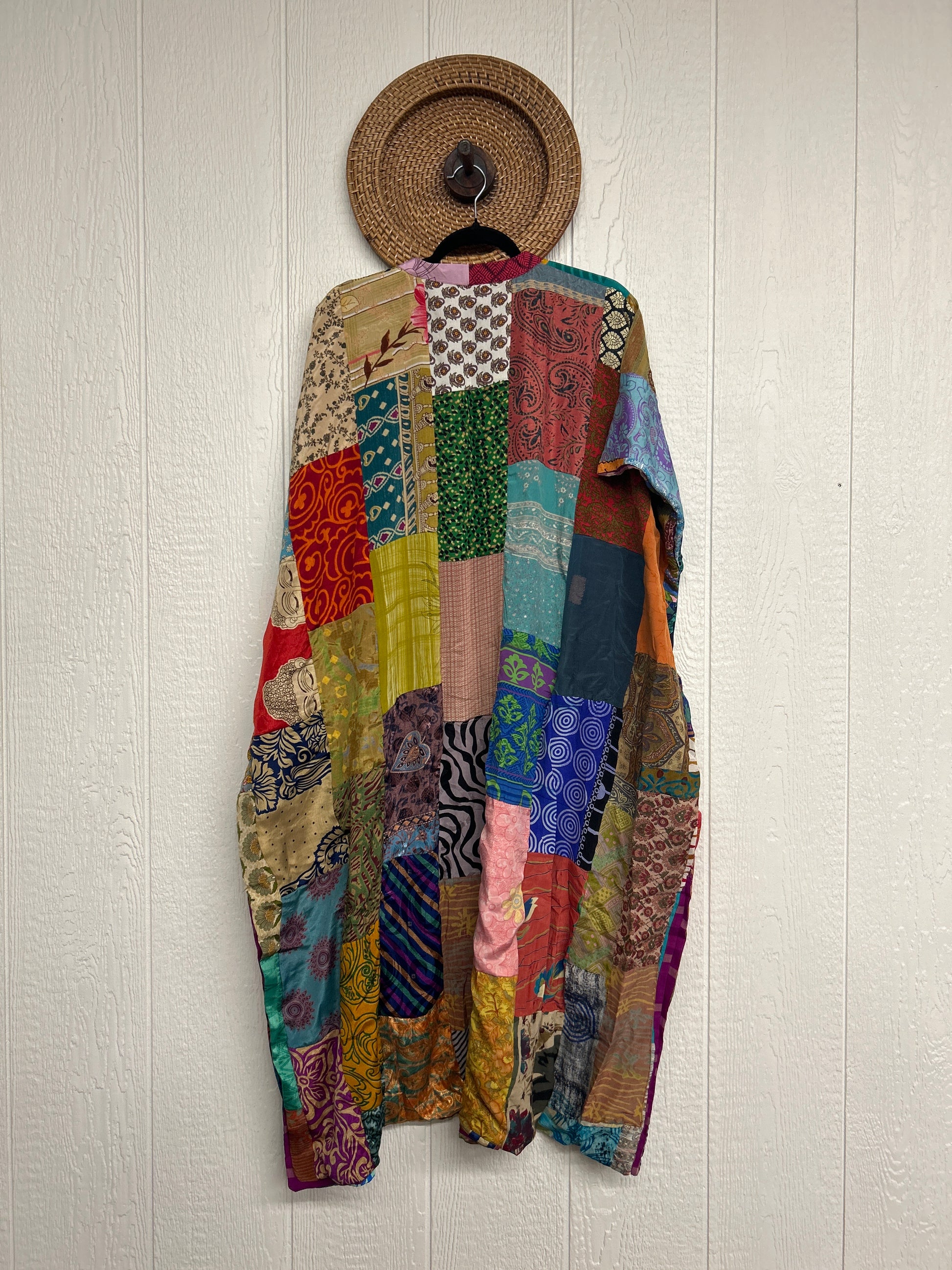 Patchwork outer garment is made from upcycled vintage rasgulla and crepe and fully lined in printed cotton sari. Features slouchy outer pockets, a v neckline and side slits for extra dimension.