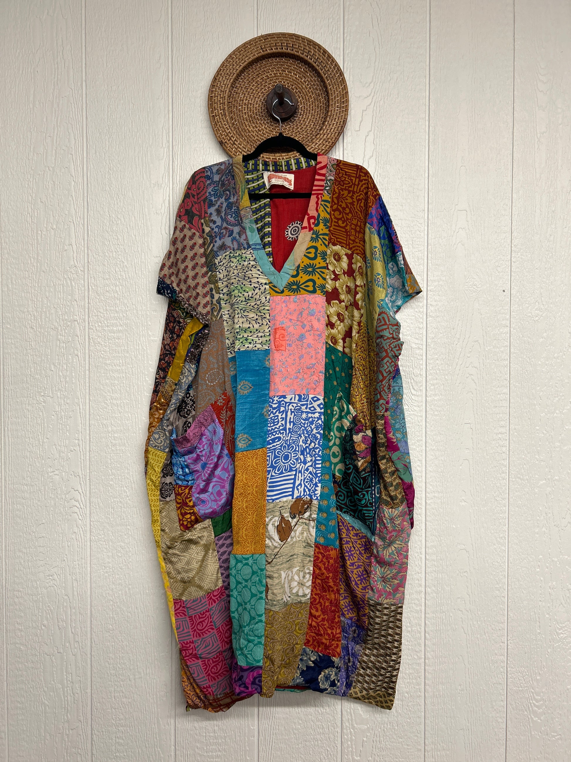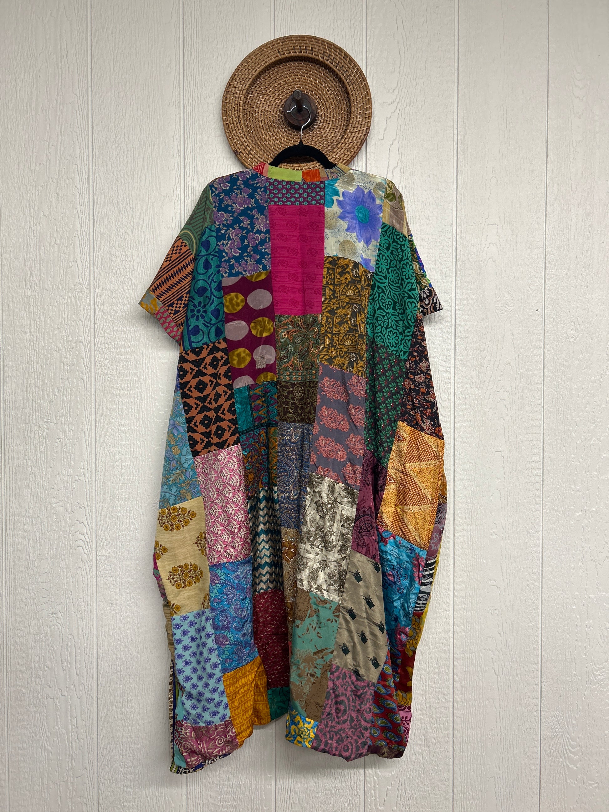 Patchwork outer garment is made from upcycled vintage rasgulla and crepe and fully lined in printed cotton sari. Features slouchy outer pockets, a v neckline and side slits for extra dimension.