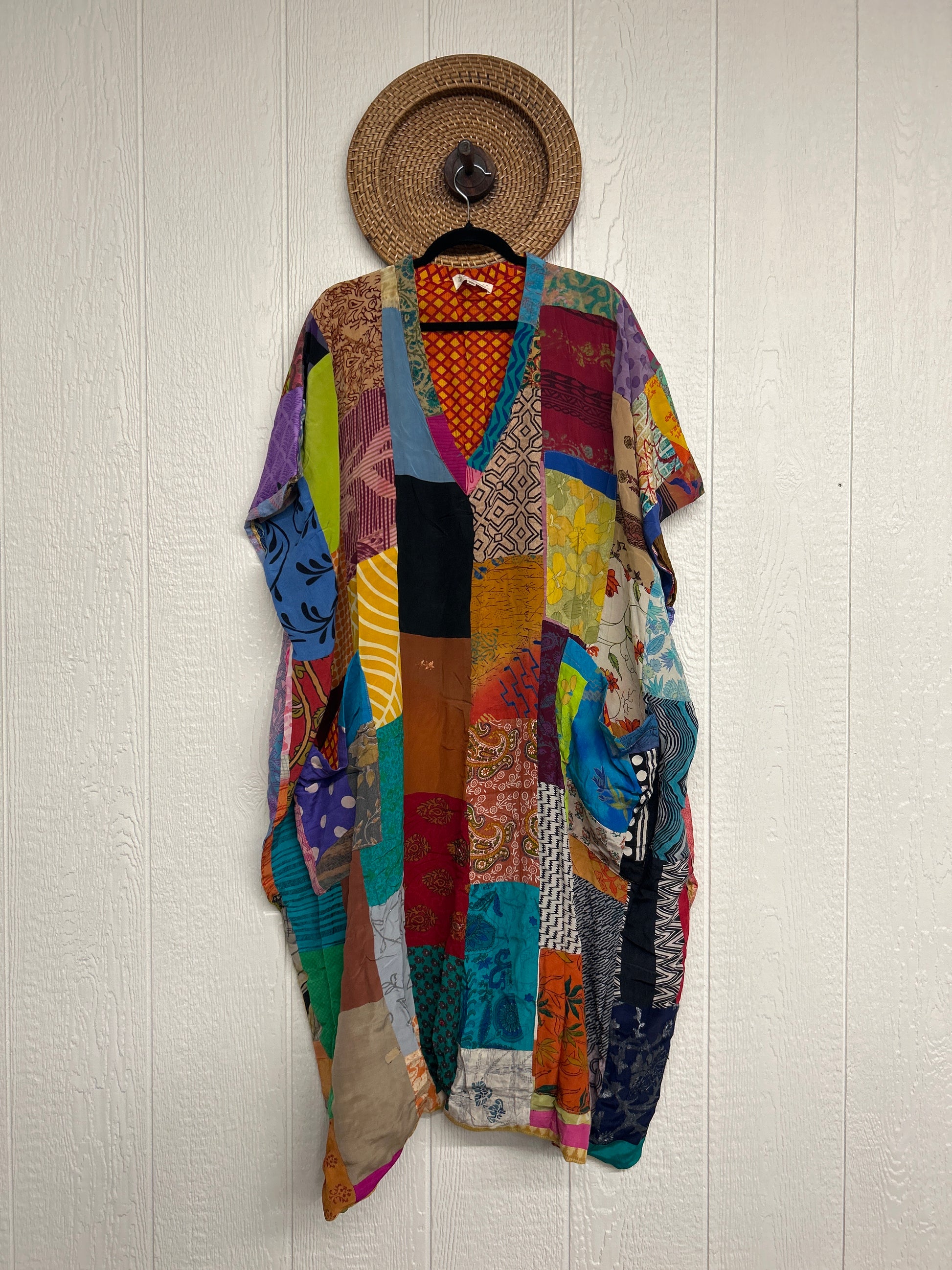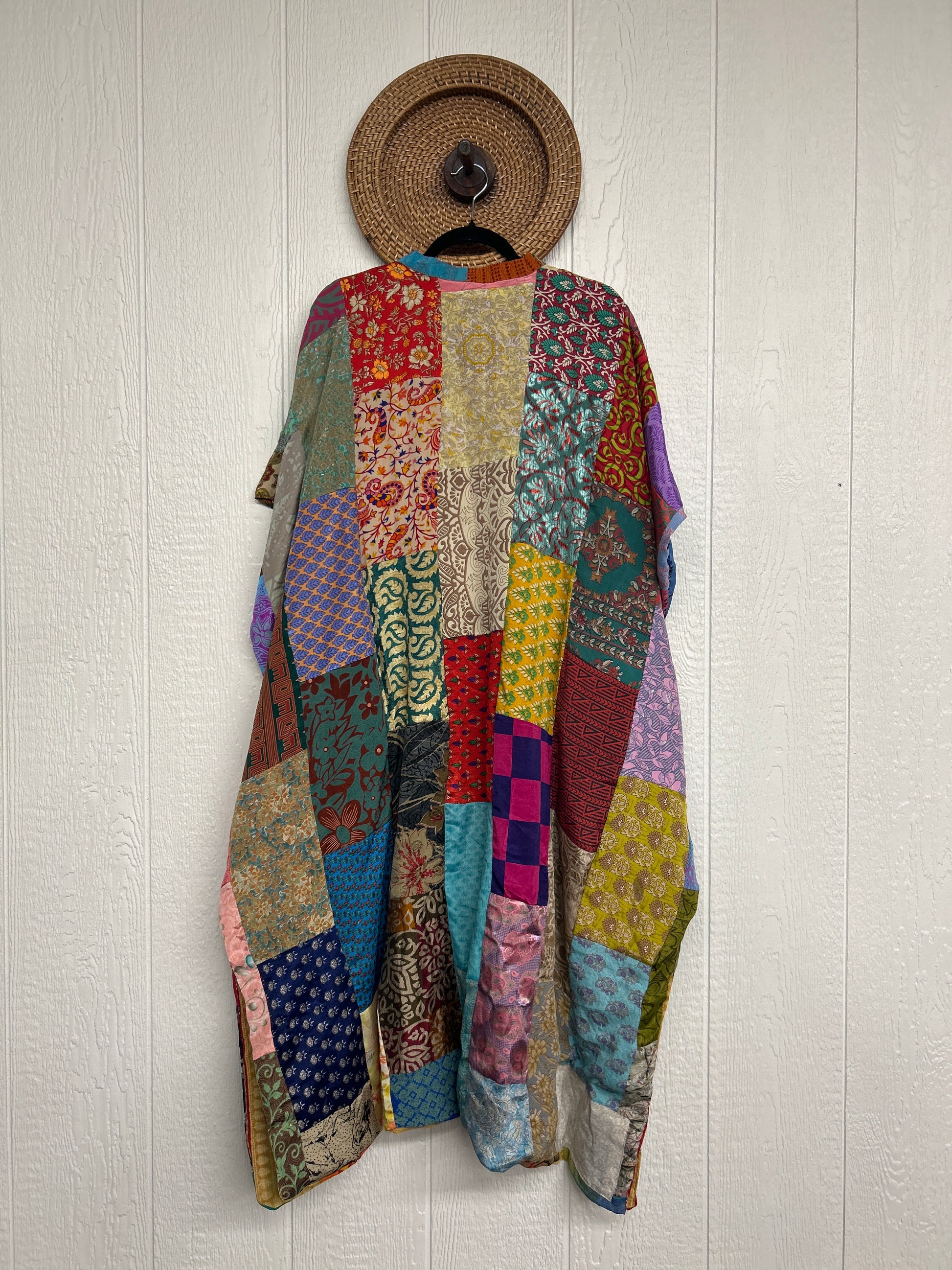 Patchwork outer garment is made from upcycled vintage rasgulla and crepe and fully lined in printed cotton sari. Features slouchy outer pockets, a v neckline and side slits for extra dimension.