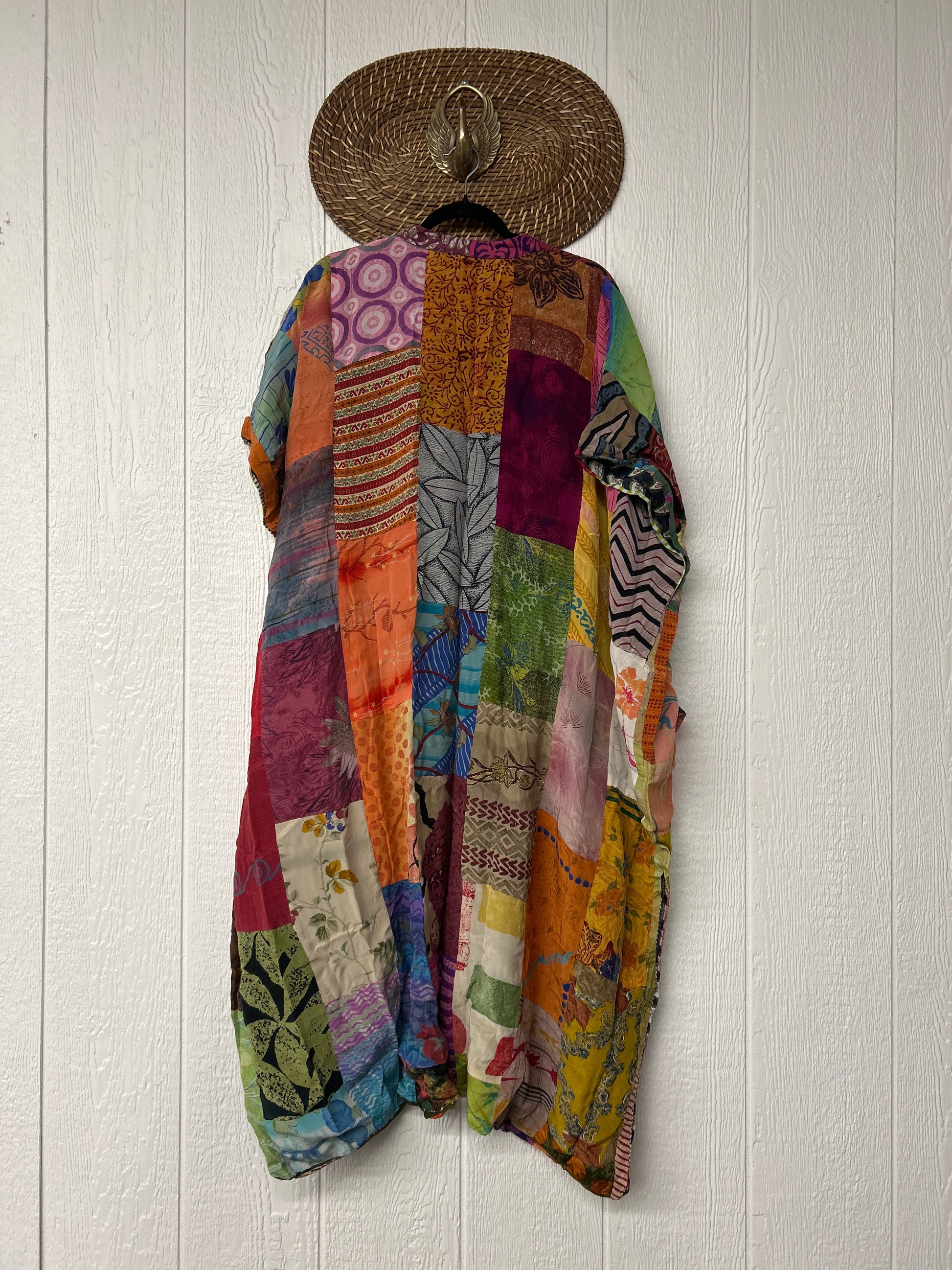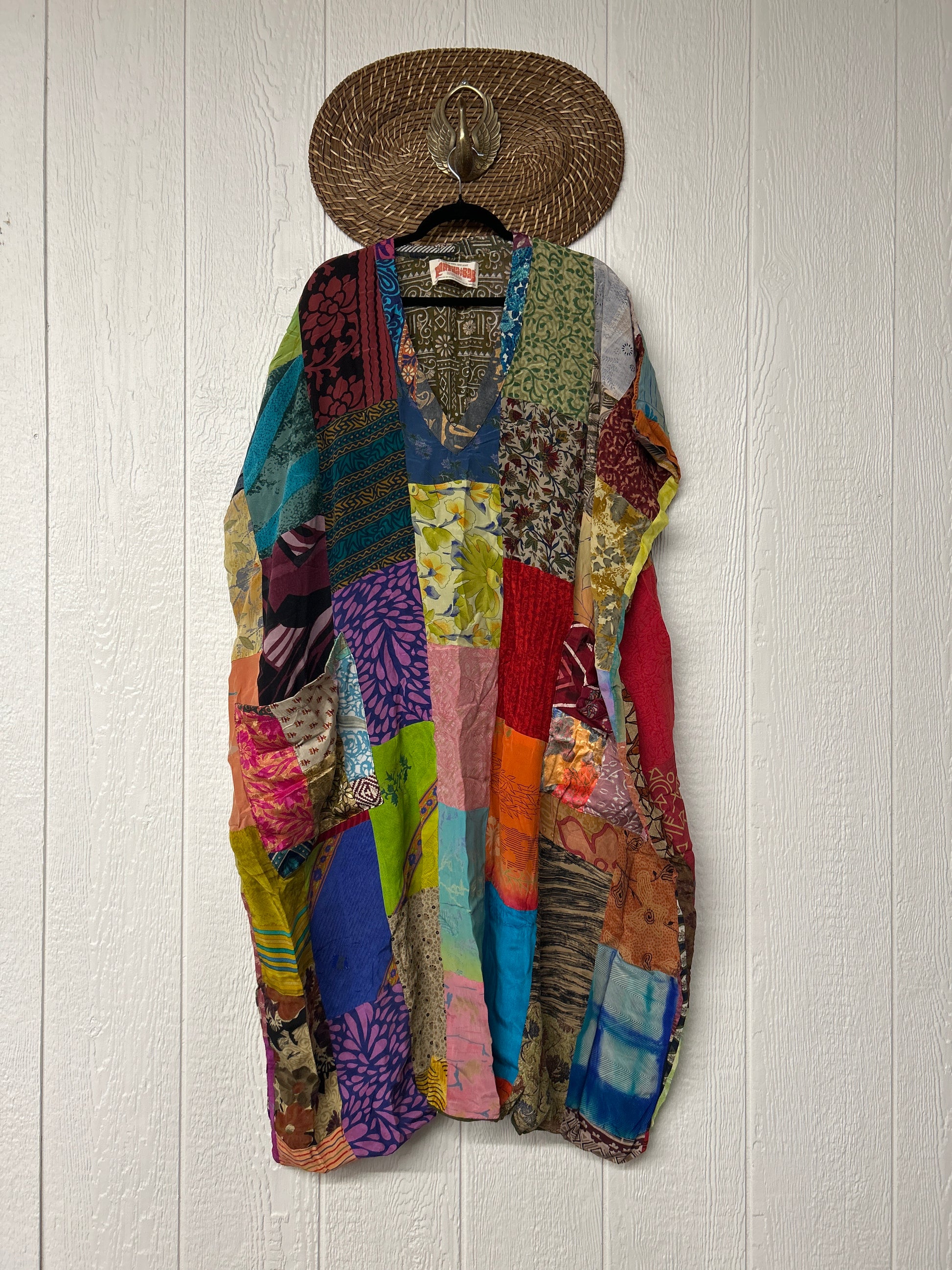 Patchwork outer garment is made from upcycled vintage rasgulla and crepe and fully lined in printed cotton sari. Features slouchy outer pockets, a v neckline and side slits for extra dimension.