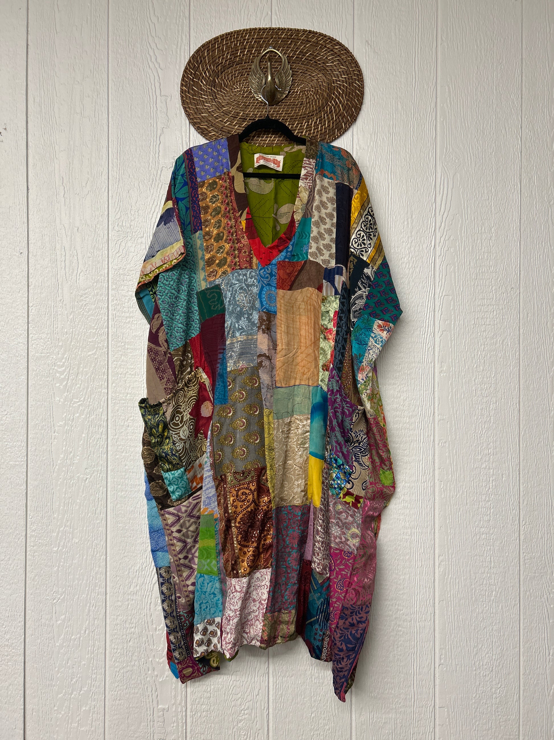Patchwork outer garment is made from upcycled vintage rasgulla and crepe and fully lined in printed cotton sari. Features slouchy outer pockets, a v neckline and side slits for extra dimension.