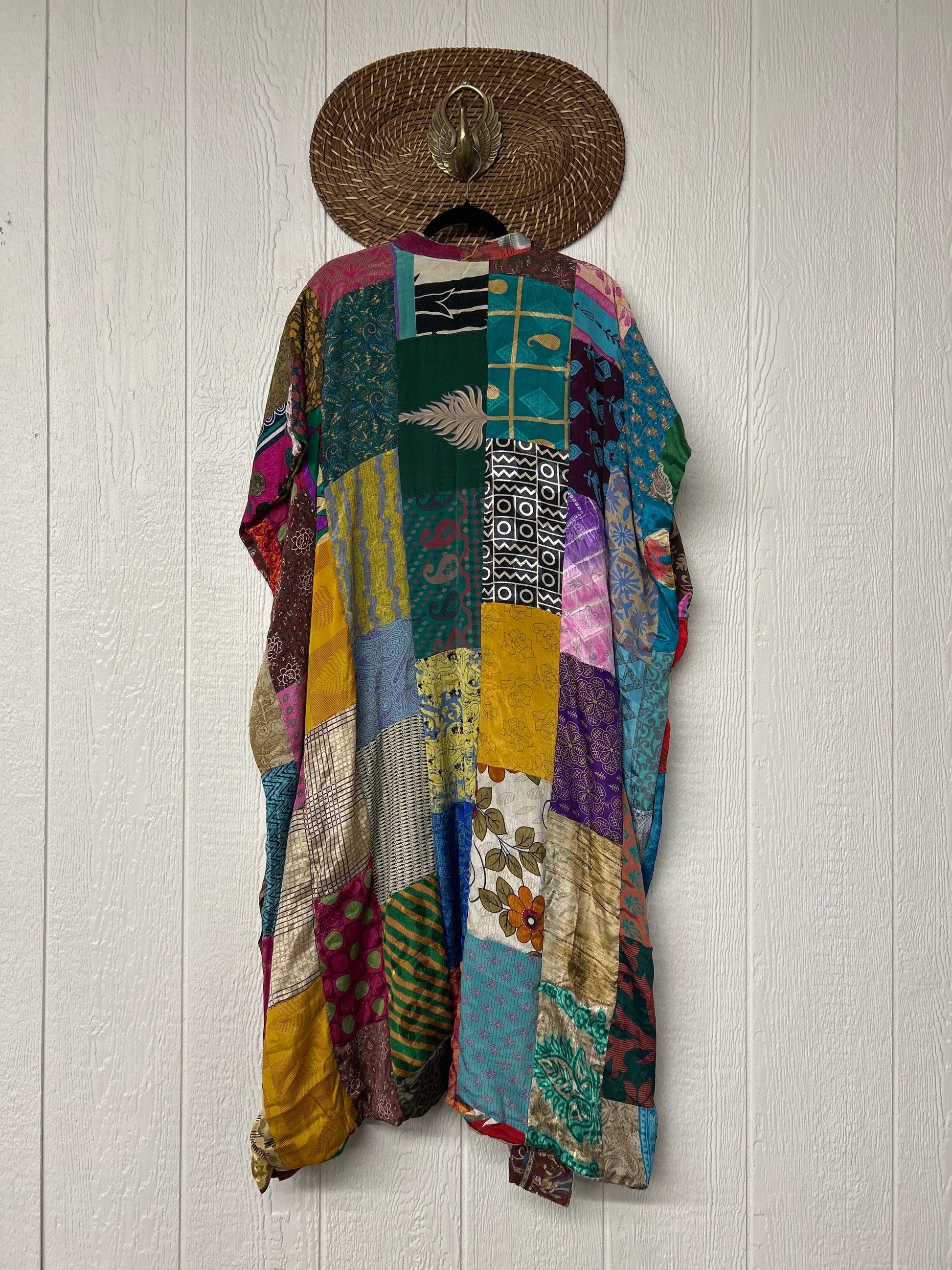 Patchwork outer garment is made from upcycled vintage rasgulla and crepe and fully lined in printed cotton sari. Features slouchy outer pockets, a v neckline and side slits for extra dimension.