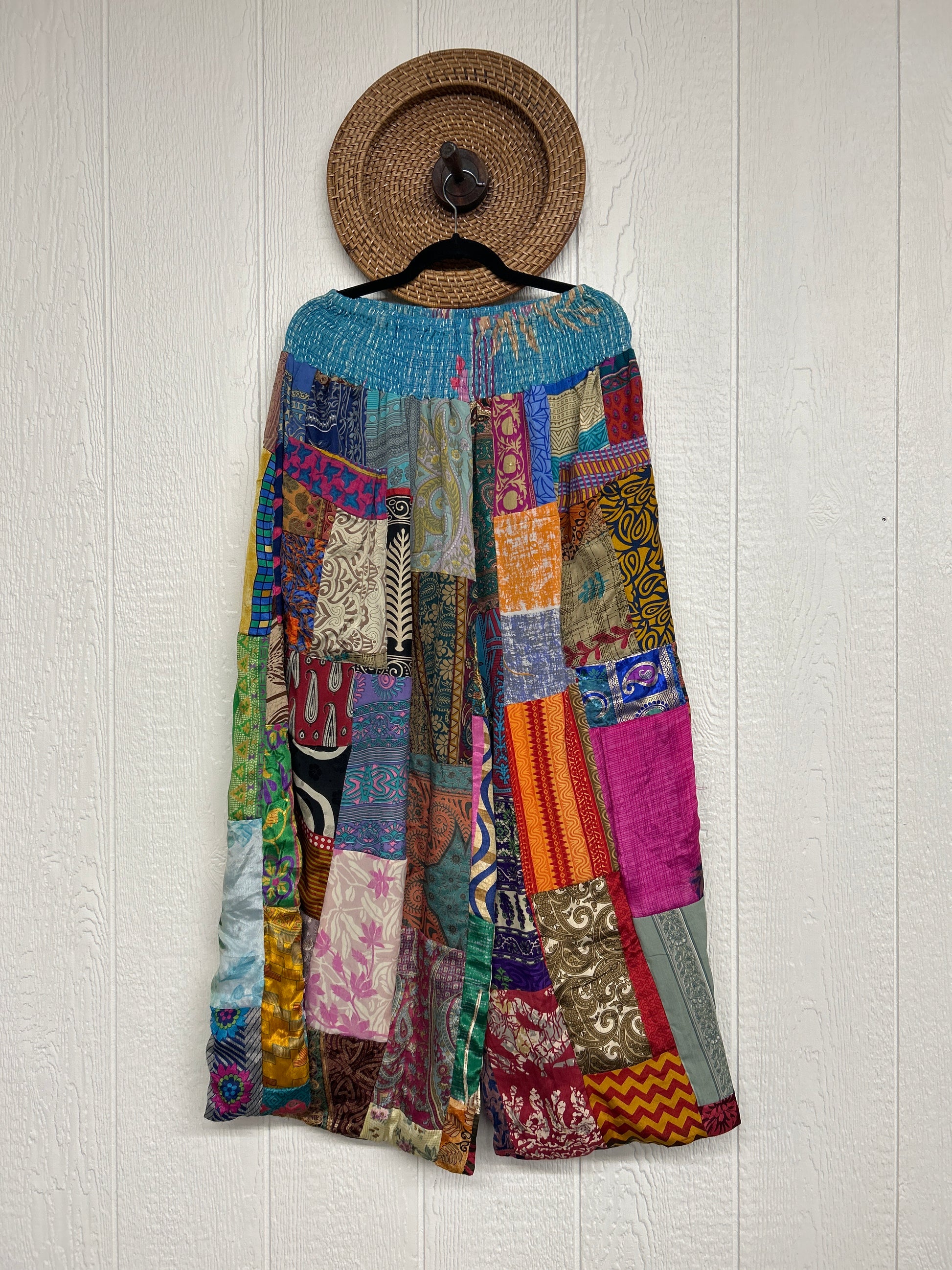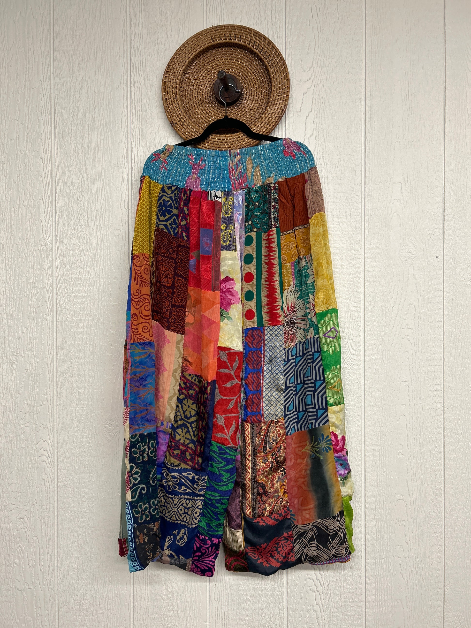 Features super wide legs that make your pants dance when you walk. Front slouchy pockets are deep enough to fill with your treasures. Vintage Rasgulla and Crepe Sari make up the beautiful patchwork featured on the outside with vintage cotton sari lining on the inside. Fully reversible and free size in all the ways!