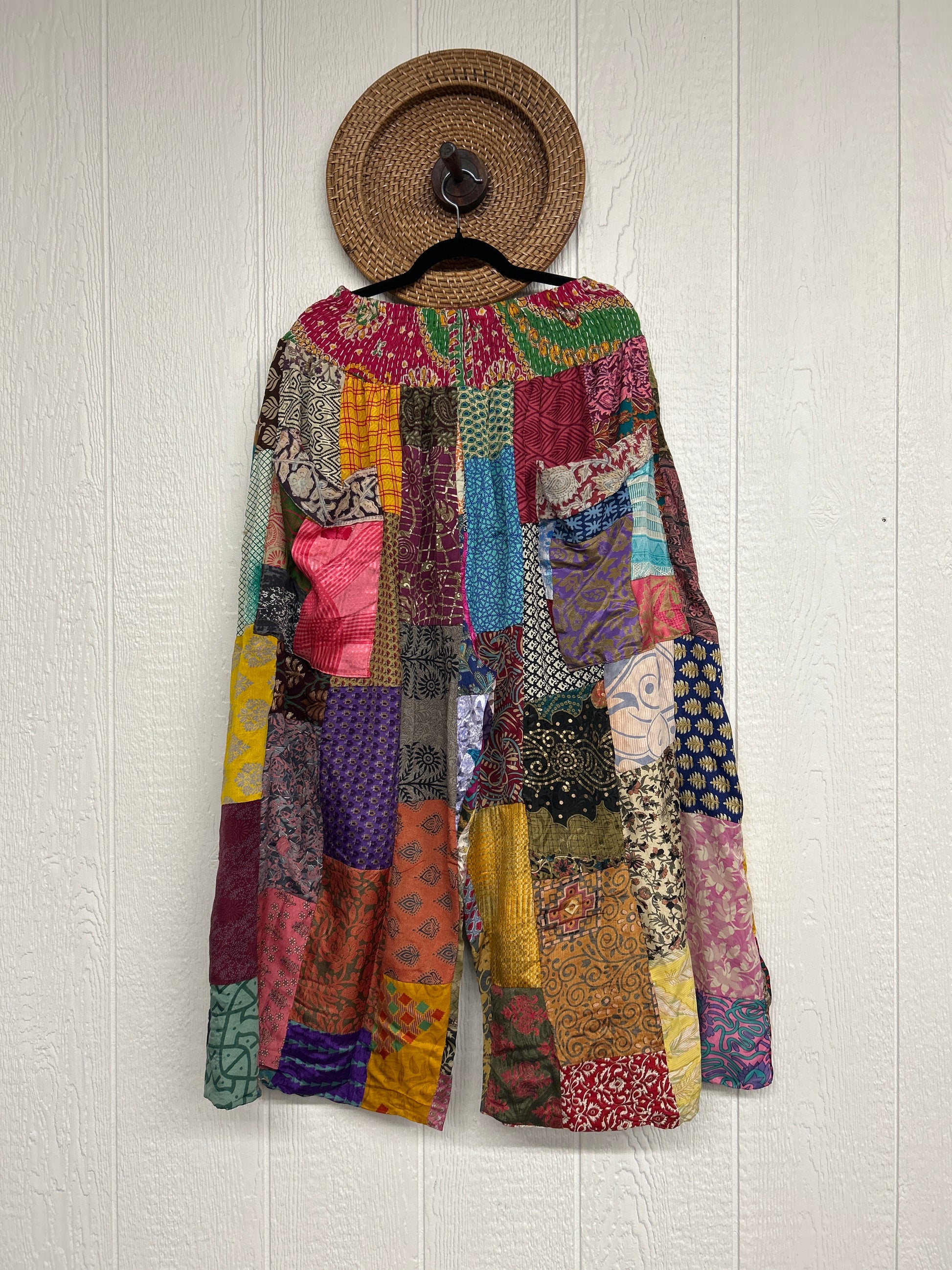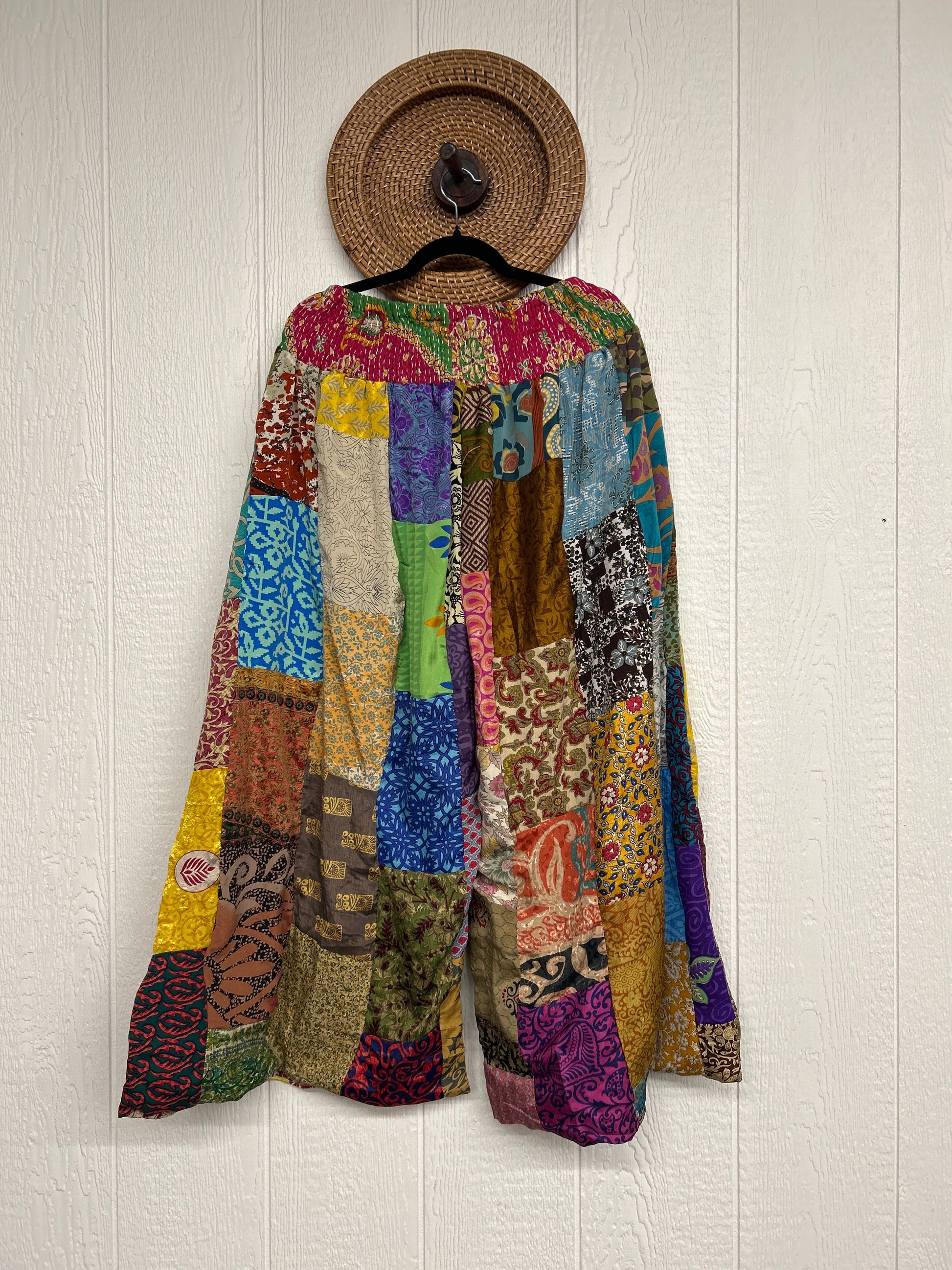 Features super wide legs that make your pants dance when you walk. Front slouchy pockets are deep enough to fill with your treasures. Vintage Rasgulla and Crepe Sari make up the beautiful patchwork featured on the outside with vintage cotton sari lining on the inside. Fully reversible and free size in all the ways!