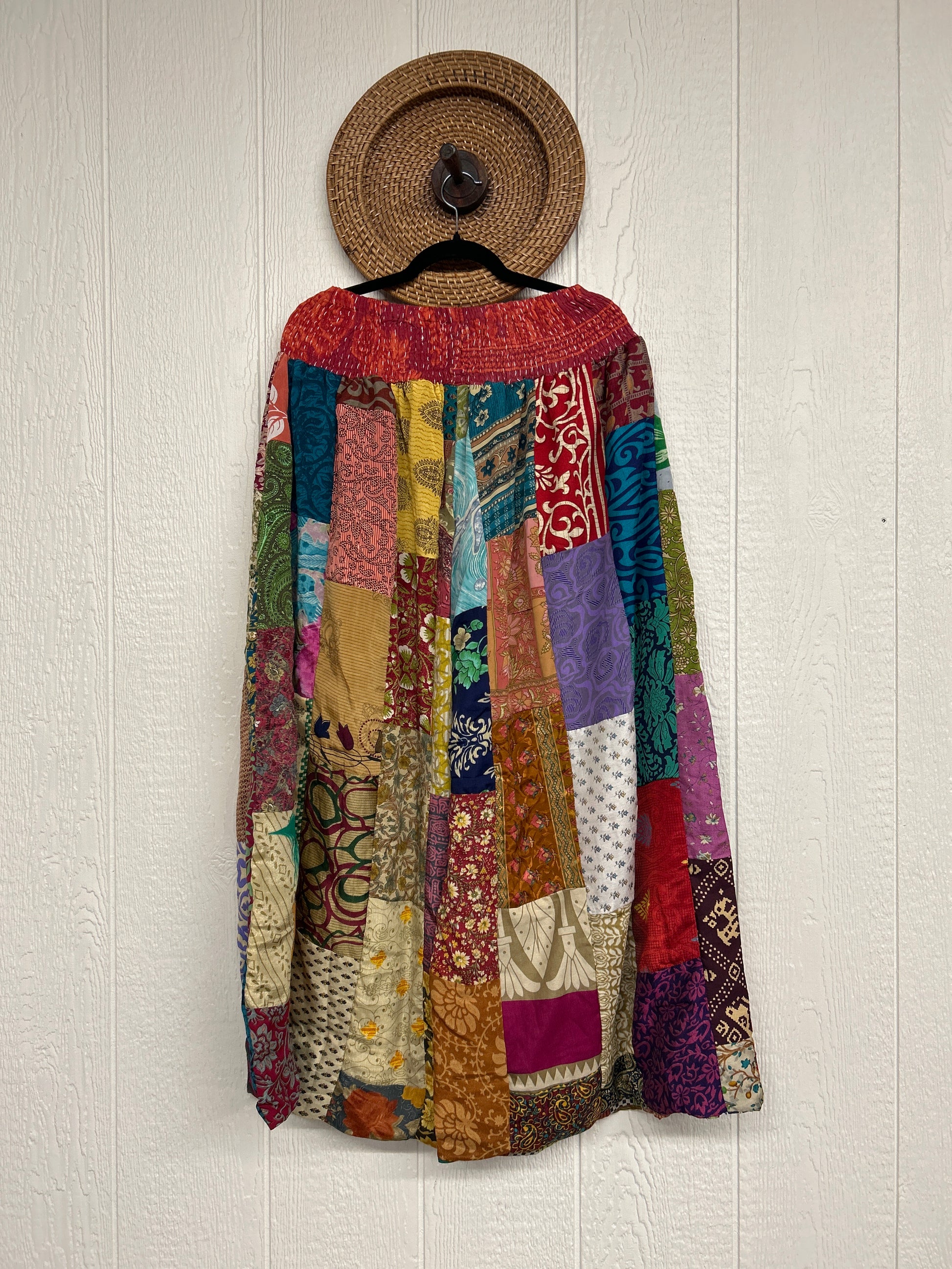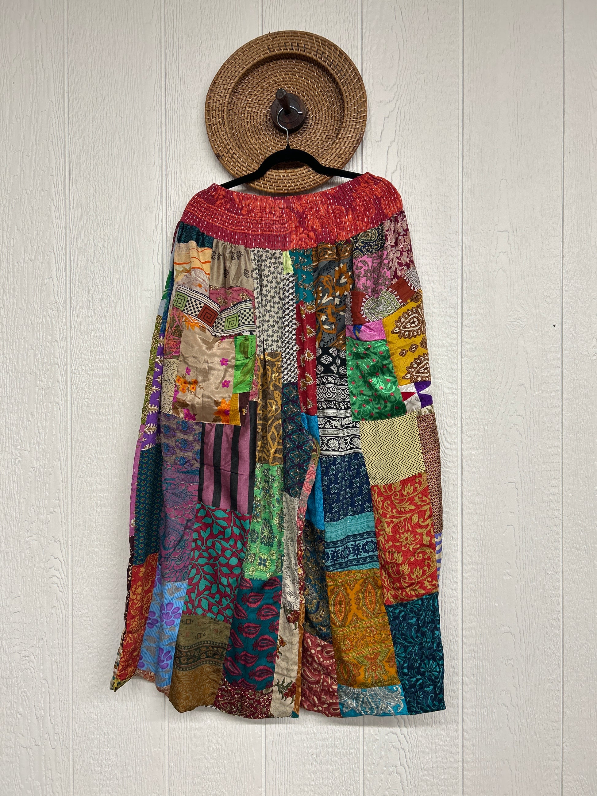 Features super wide legs that make your pants dance when you walk. Front slouchy pockets are deep enough to fill with your treasures. Vintage Rasgulla and Crepe Sari make up the beautiful patchwork featured on the outside with vintage cotton sari lining on the inside. Fully reversible and free size in all the ways!