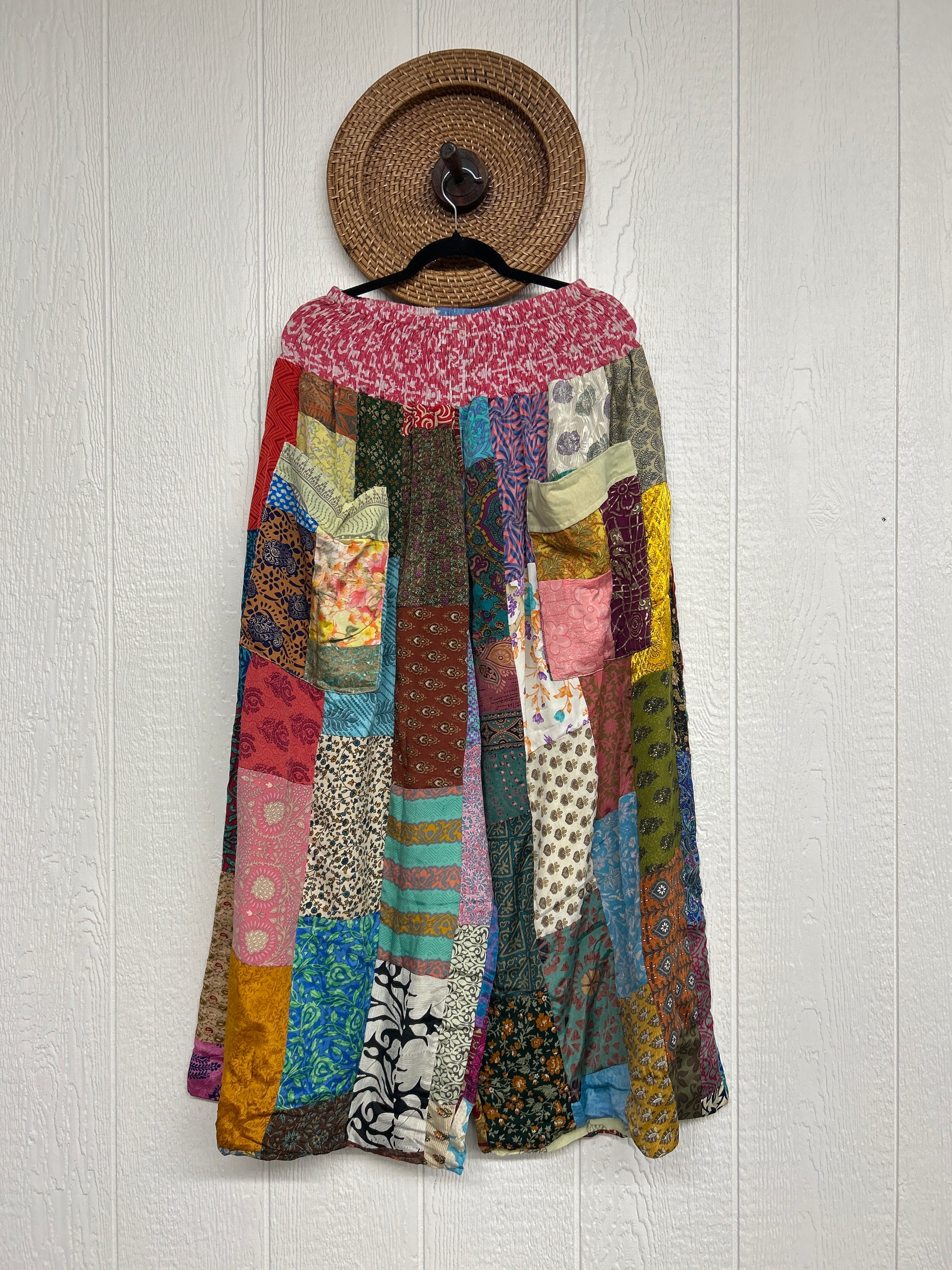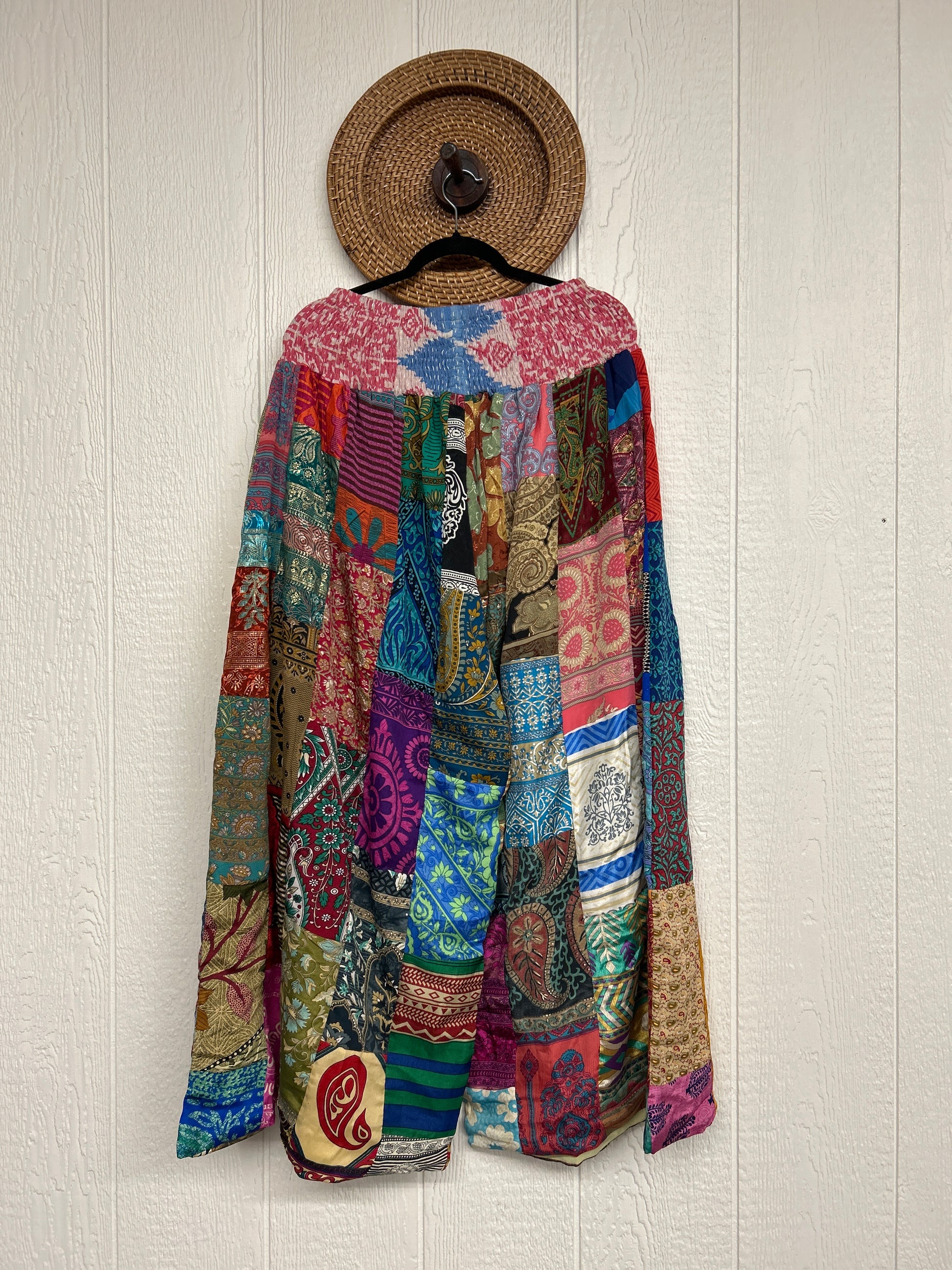 Features super wide legs that make your pants dance when you walk. Front slouchy pockets are deep enough to fill with your treasures. Vintage Rasgulla and Crepe Sari make up the beautiful patchwork featured on the outside with vintage cotton sari lining on the inside. Fully reversible and free size in all the ways!