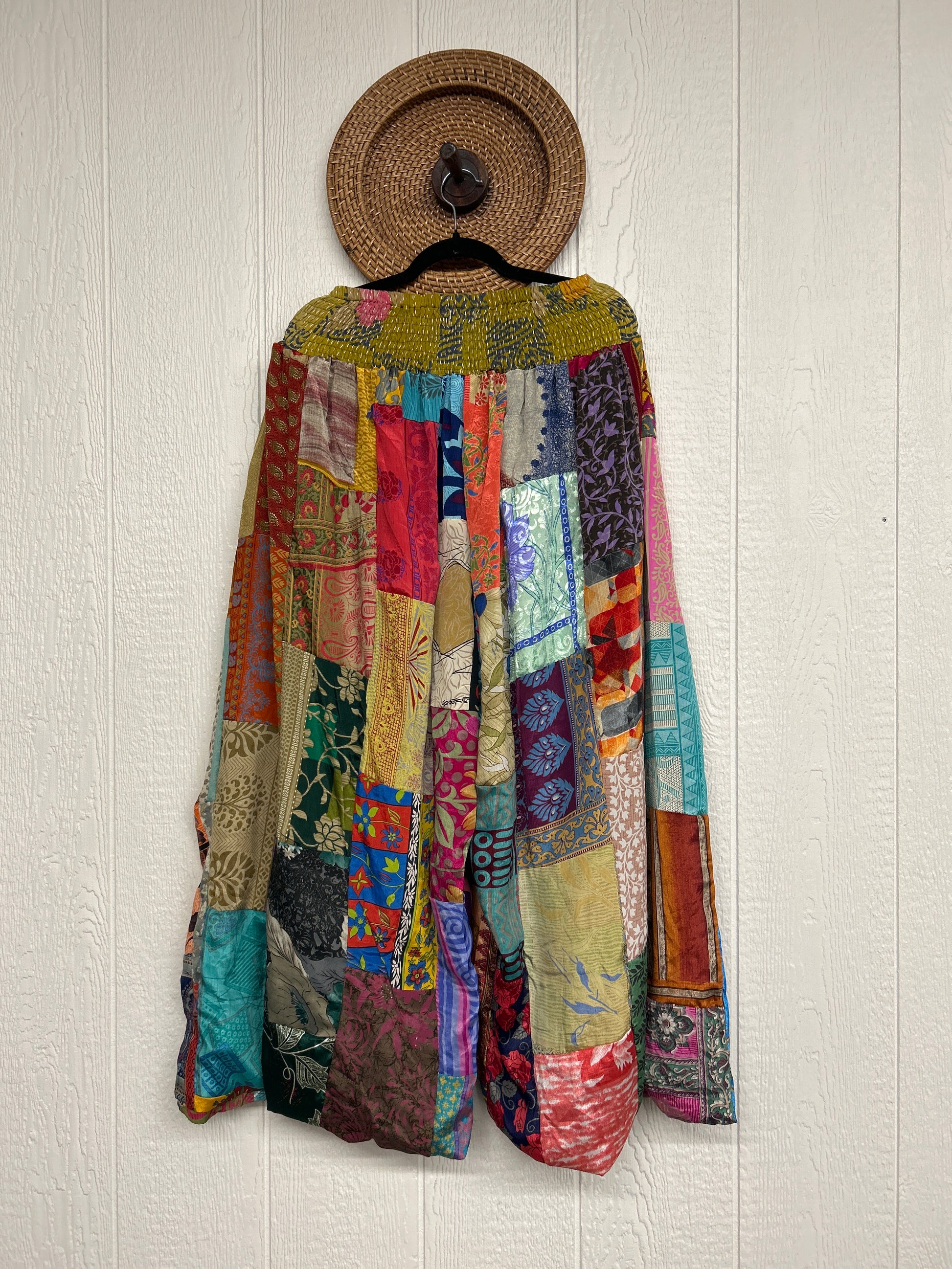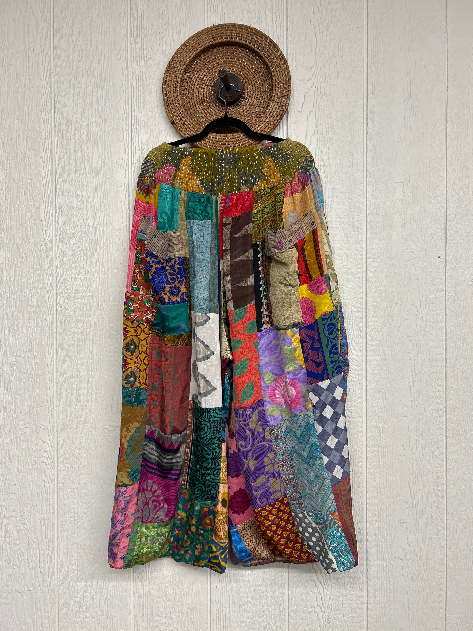 Features super wide legs that make your pants dance when you walk. Front slouchy pockets are deep enough to fill with your treasures. Vintage Rasgulla and Crepe Sari make up the beautiful patchwork featured on the outside with vintage cotton sari lining on the inside. Fully reversible and free size in all the ways!