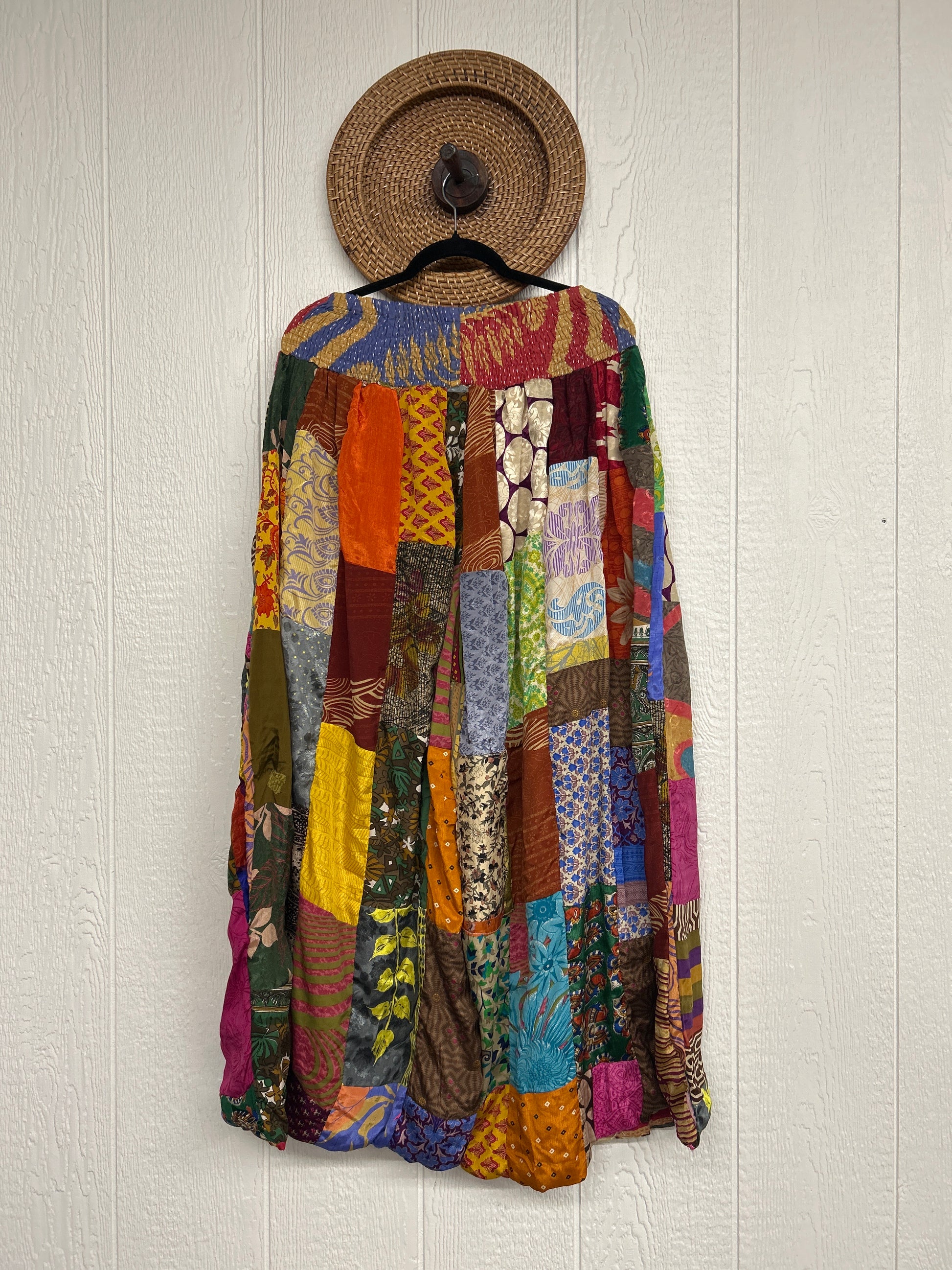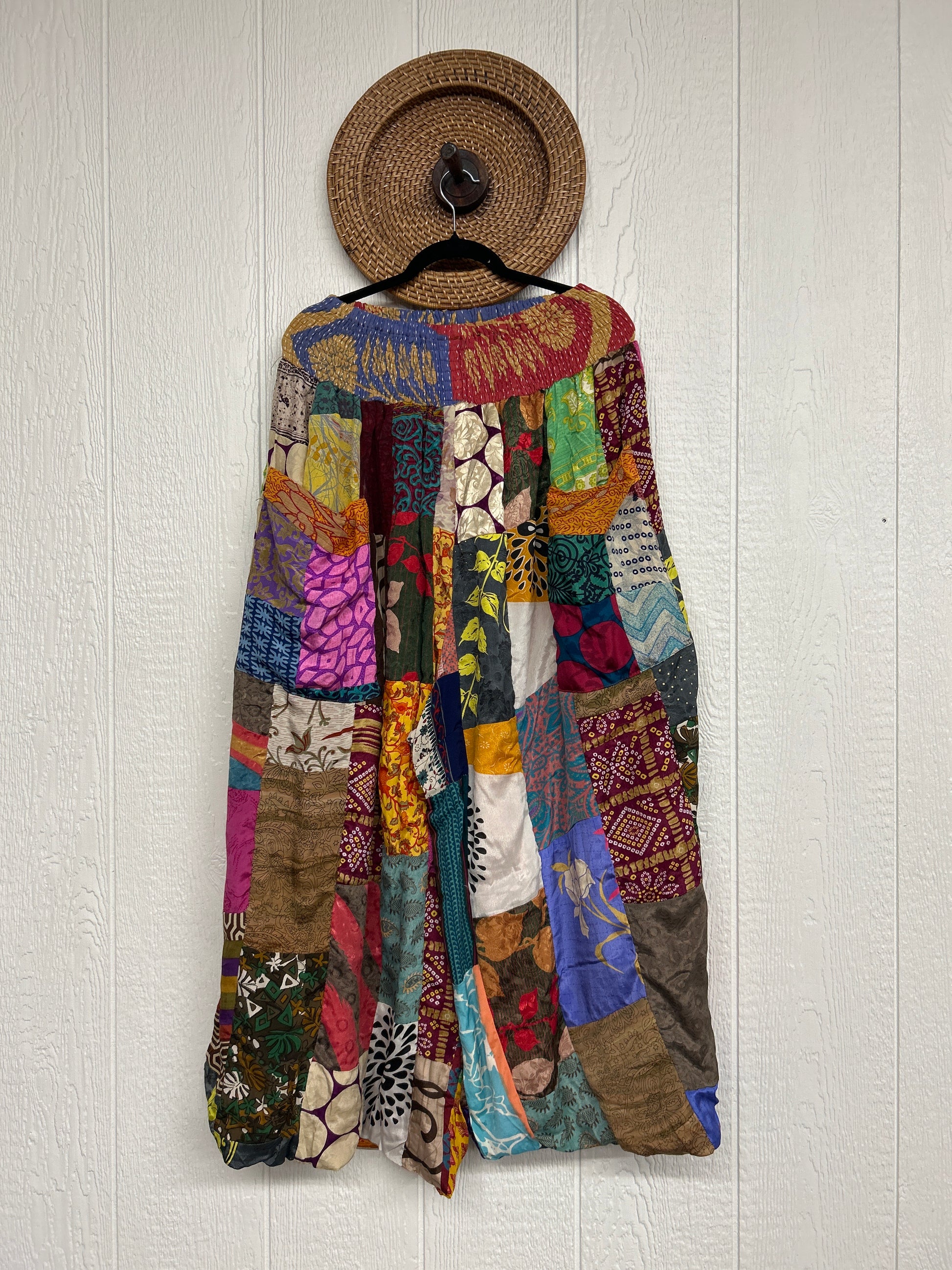 Features super wide legs that make your pants dance when you walk. Front slouchy pockets are deep enough to fill with your treasures. Vintage Rasgulla and Crepe Sari make up the beautiful patchwork featured on the outside with vintage cotton sari lining on the inside. Fully reversible and free size in all the ways!