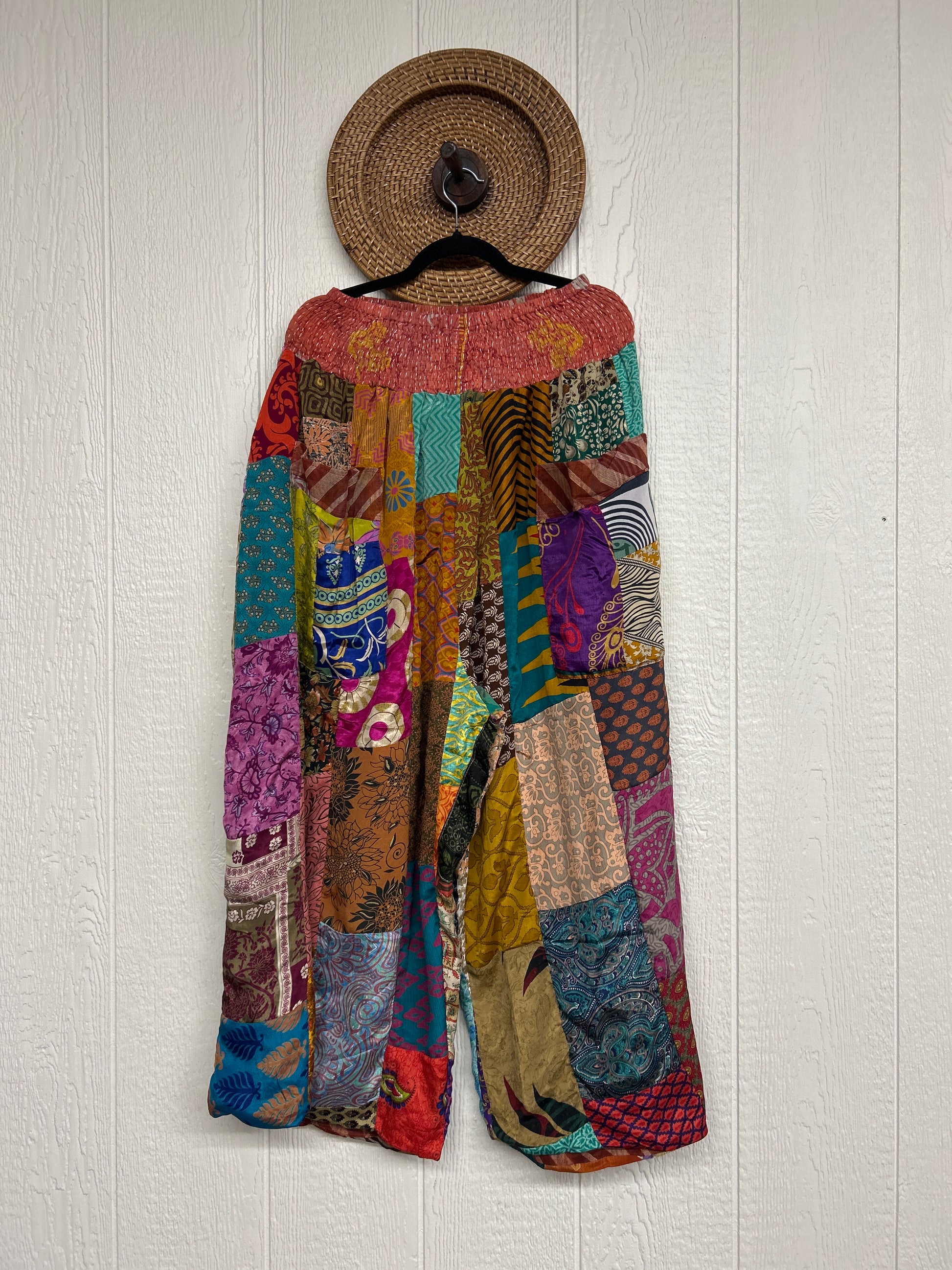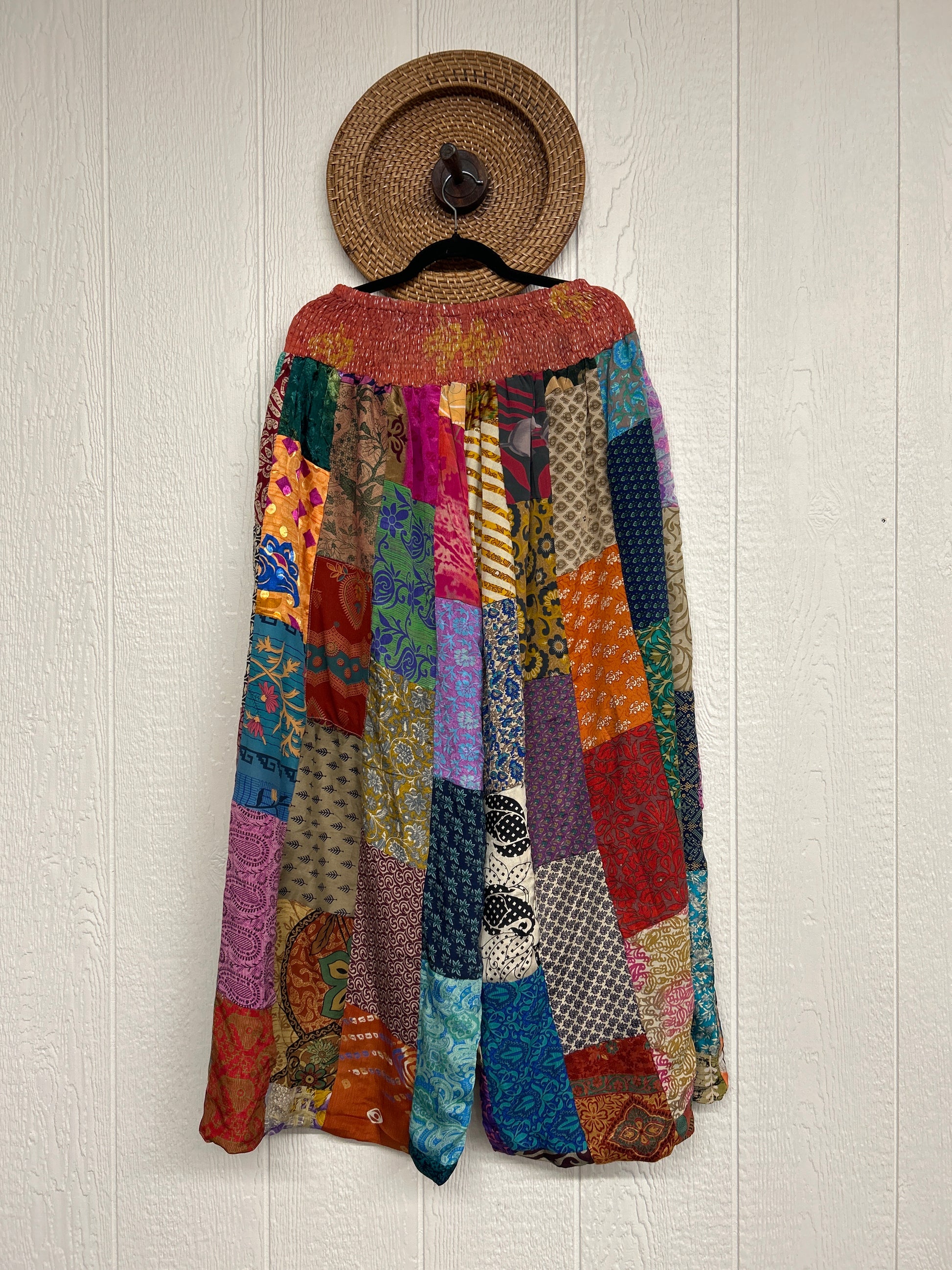 Features super wide legs that make your pants dance when you walk. Front slouchy pockets are deep enough to fill with your treasures. Vintage Rasgulla and Crepe Sari make up the beautiful patchwork featured on the outside with vintage cotton sari lining on the inside. Fully reversible and free size in all the ways!