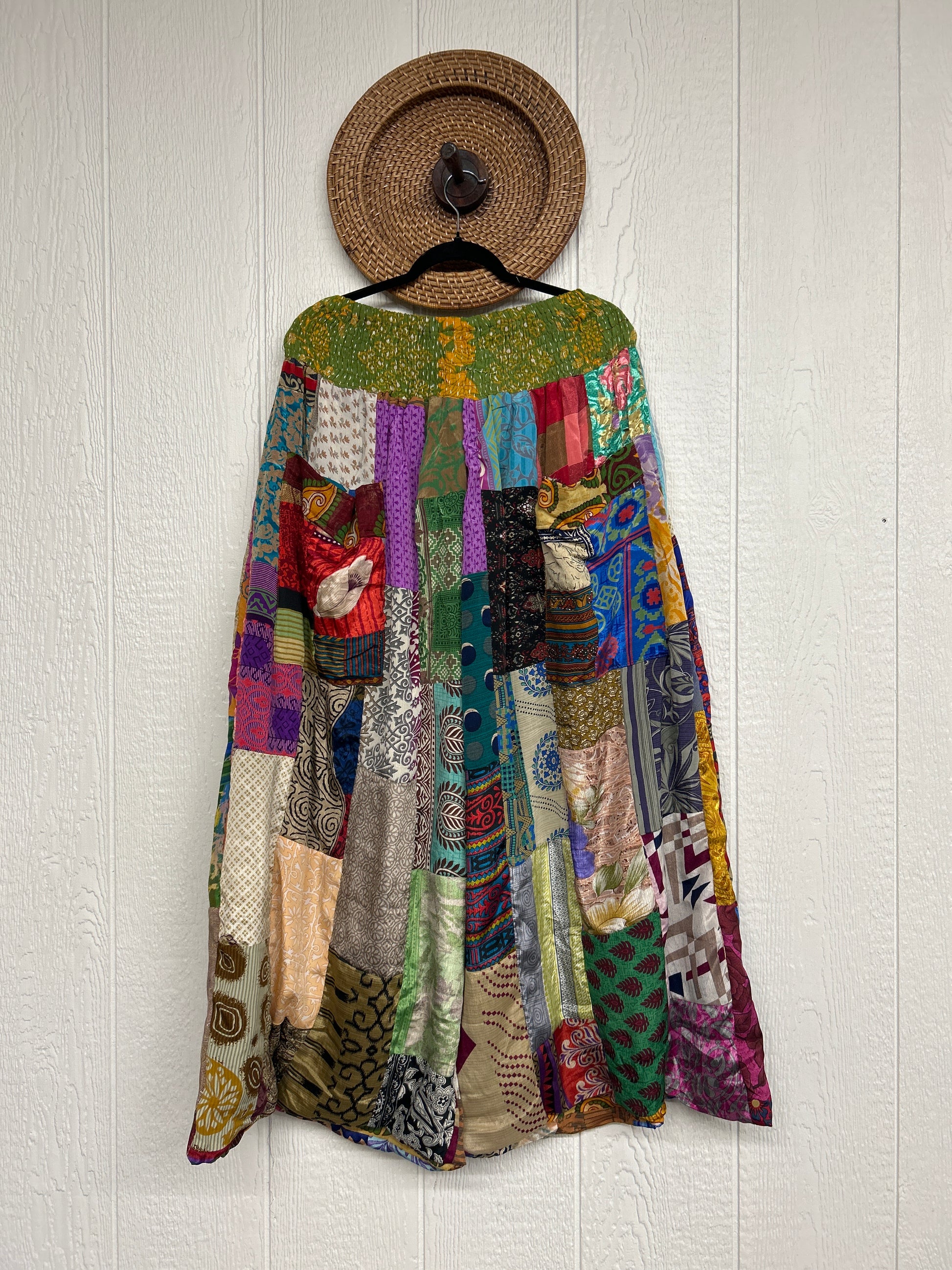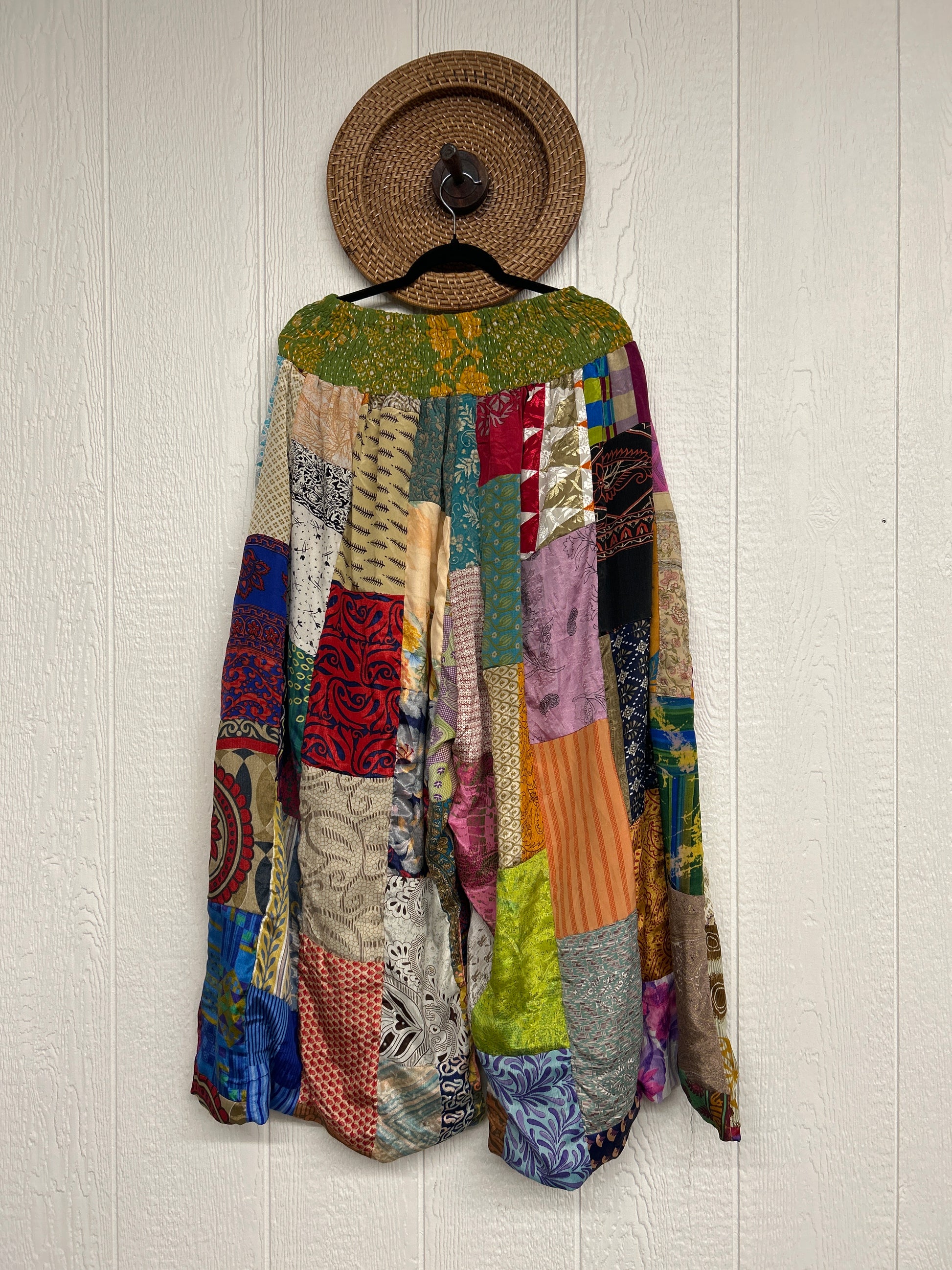Features super wide legs that make your pants dance when you walk. Front slouchy pockets are deep enough to fill with your treasures. Vintage Rasgulla and Crepe Sari make up the beautiful patchwork featured on the outside with vintage cotton sari lining on the inside. Fully reversible and free size in all the ways!