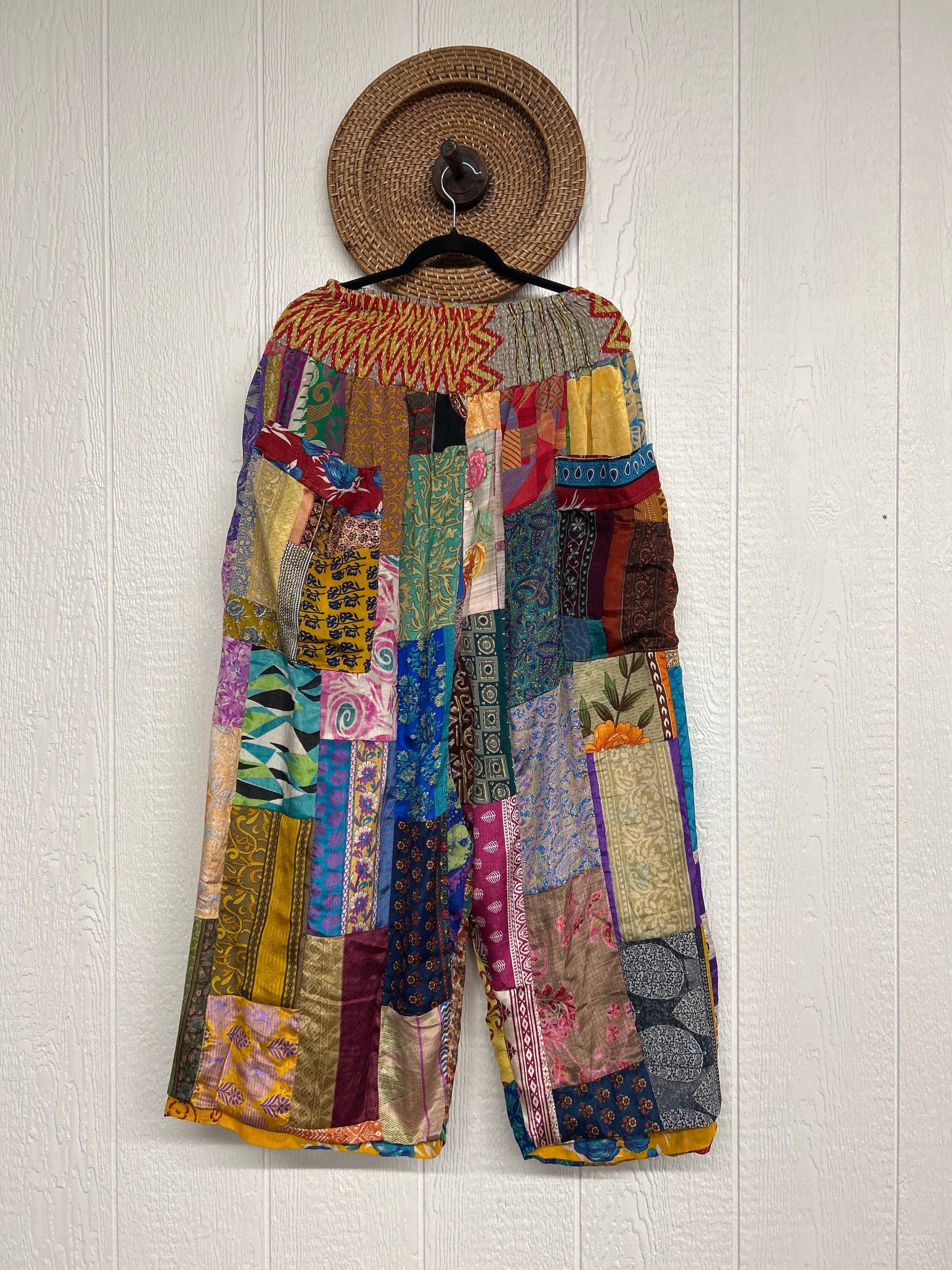 Features super wide legs that make your pants dance when you walk. Front slouchy pockets are deep enough to fill with your treasures. Vintage Rasgulla and Crepe Sari make up the beautiful patchwork featured on the outside with vintage cotton sari lining on the inside. Fully reversible and free size in all the ways!
