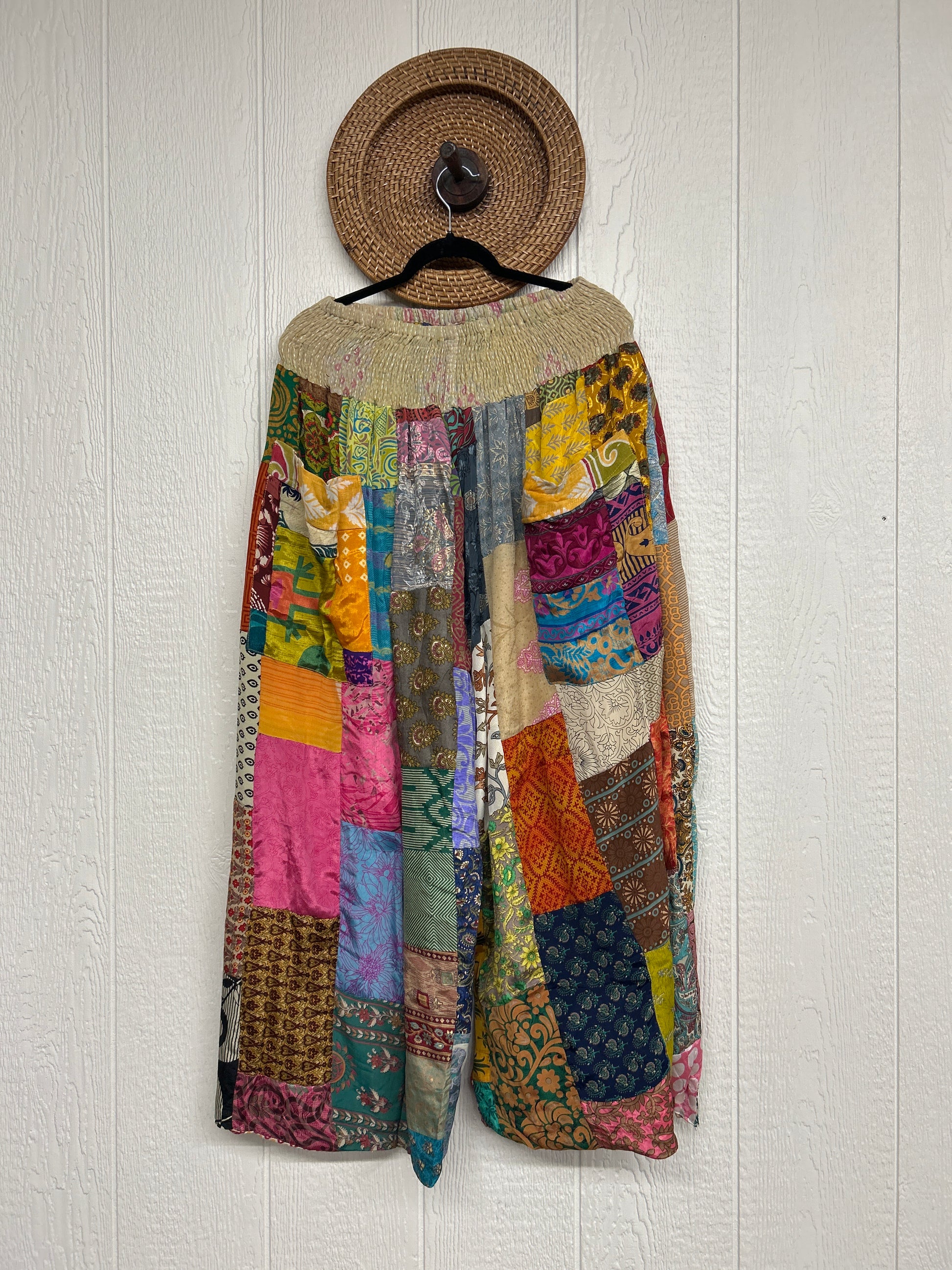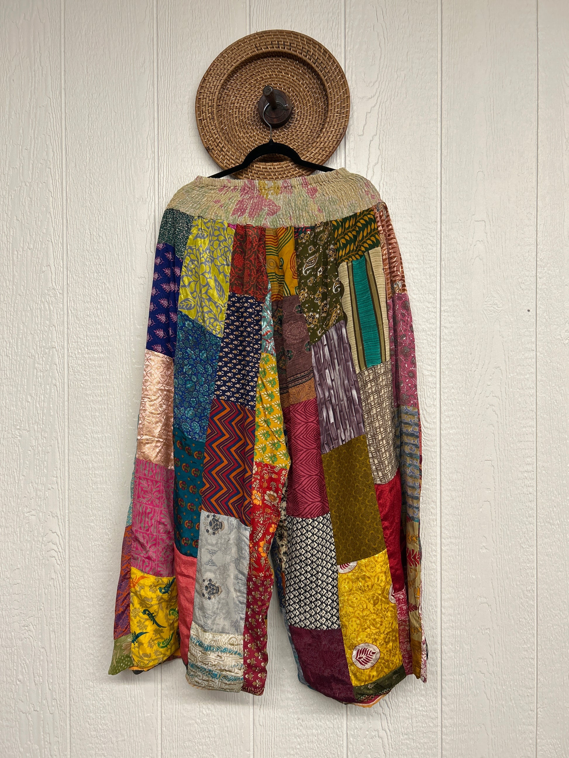 Features super wide legs that make your pants dance when you walk. Front slouchy pockets are deep enough to fill with your treasures. Vintage Rasgulla and Crepe Sari make up the beautiful patchwork featured on the outside with vintage cotton sari lining on the inside. Fully reversible and free size in all the ways!
