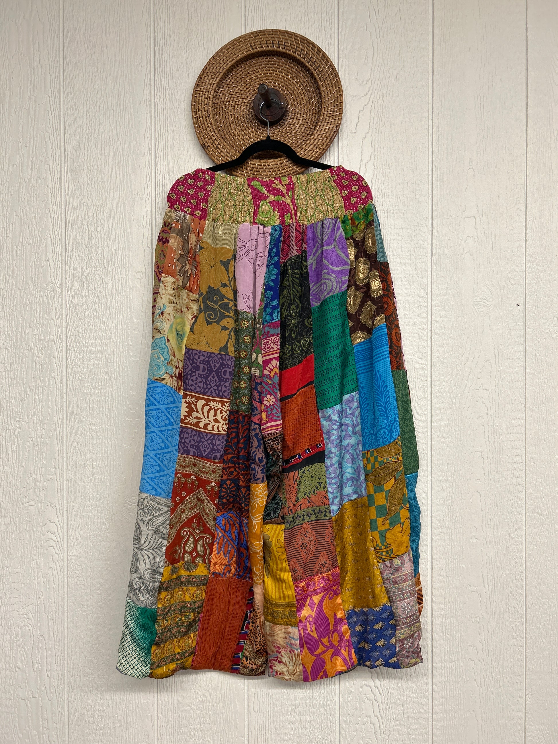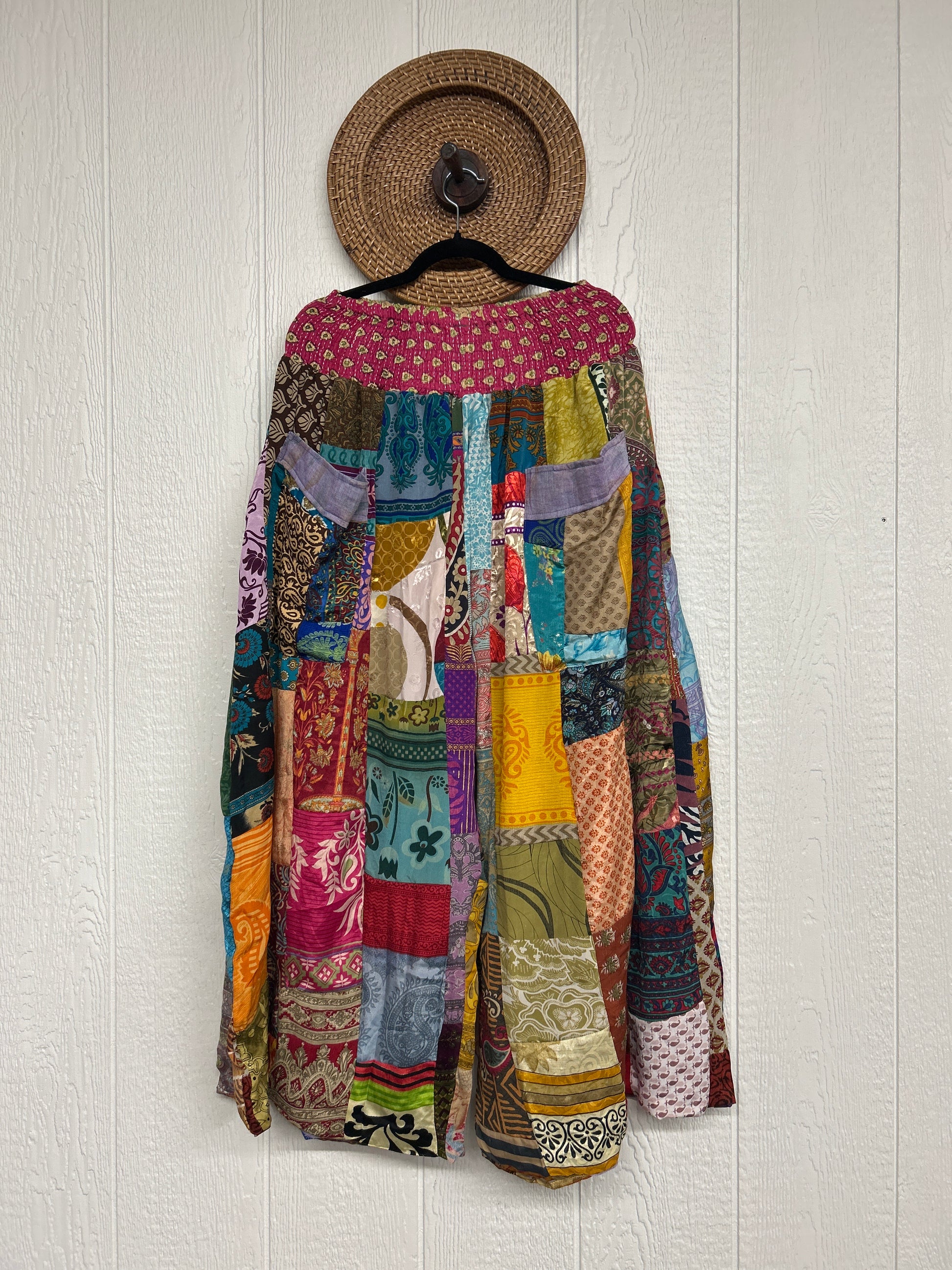 Features super wide legs that make your pants dance when you walk. Front slouchy pockets are deep enough to fill with your treasures. Vintage Rasgulla and Crepe Sari make up the beautiful patchwork featured on the outside with vintage cotton sari lining on the inside. Fully reversible and free size in all the ways!