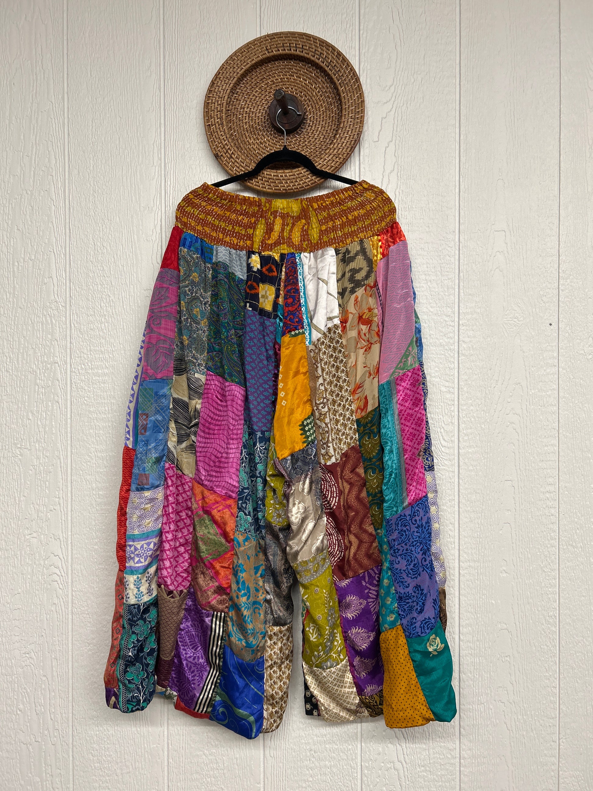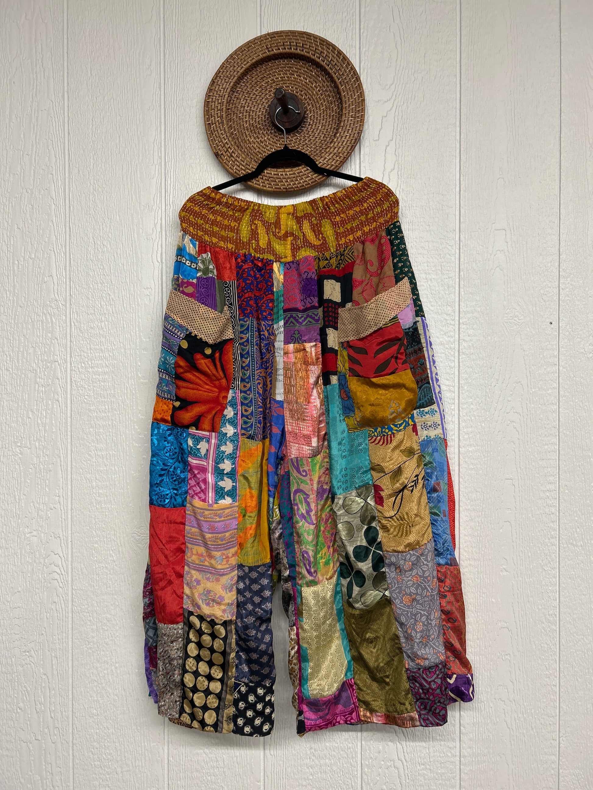 Features super wide legs that make your pants dance when you walk. Front slouchy pockets are deep enough to fill with your treasures. Vintage Rasgulla and Crepe Sari make up the beautiful patchwork featured on the outside with vintage cotton sari lining on the inside. Fully reversible and free size in all the ways!