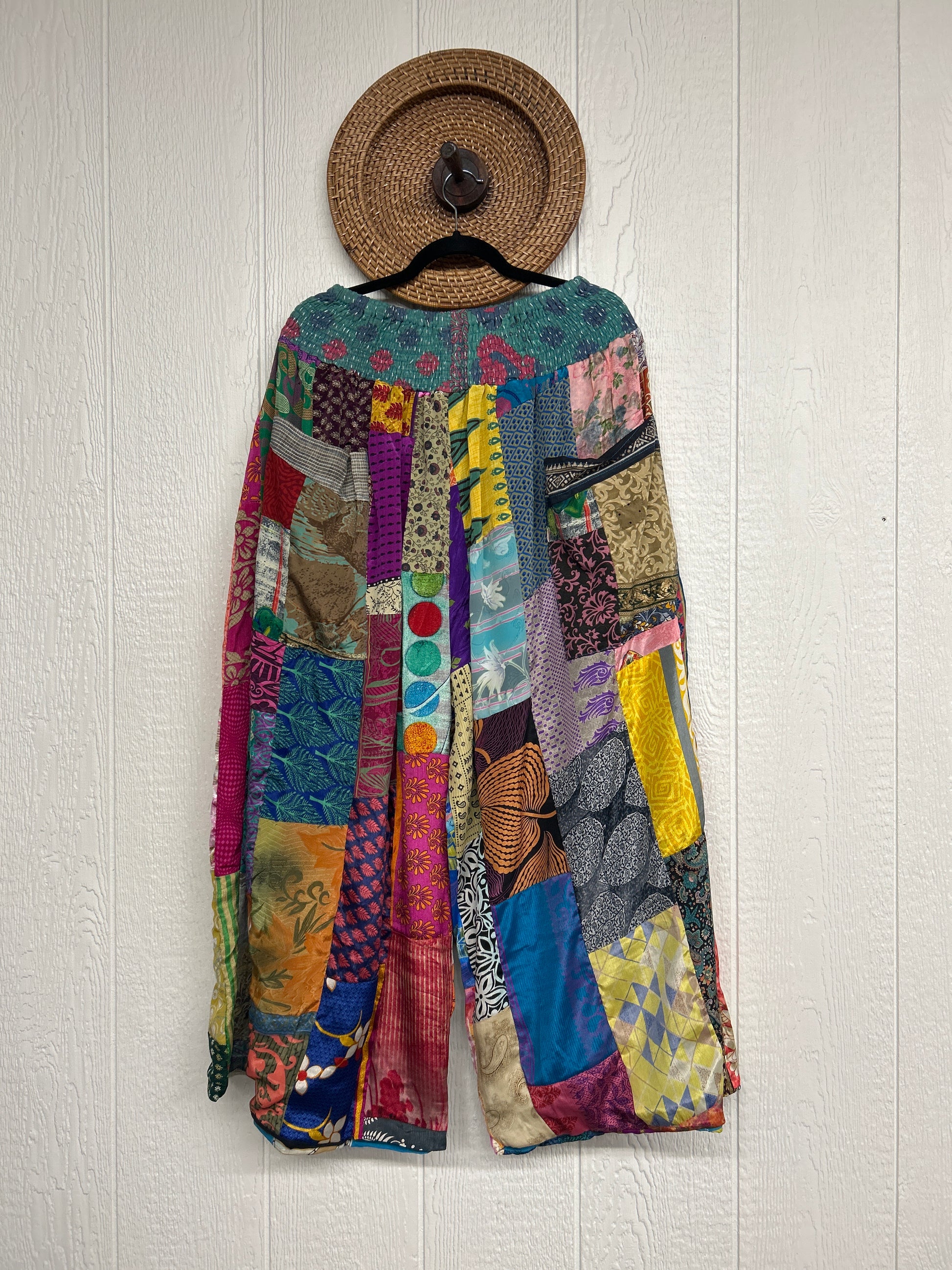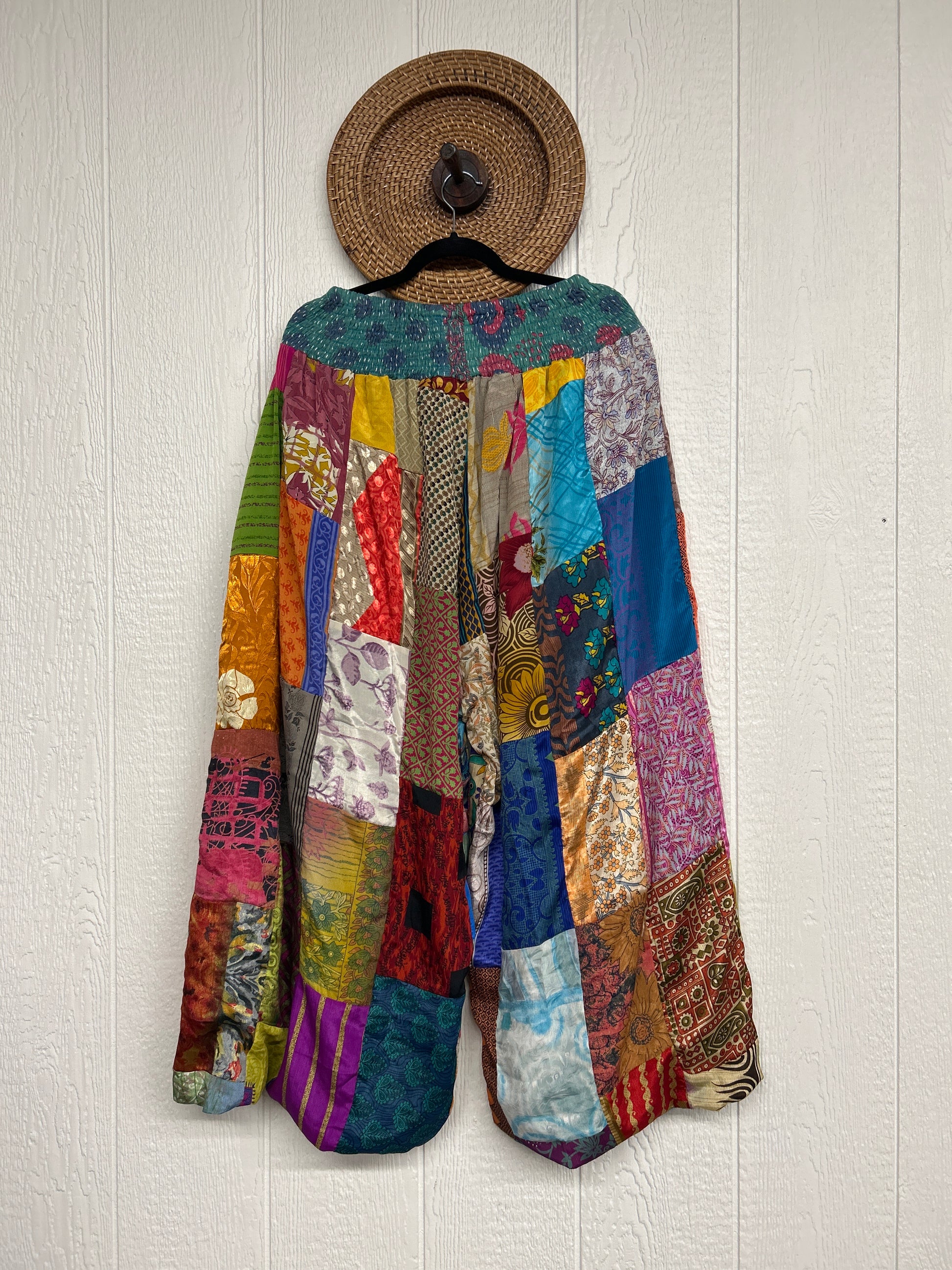 Features super wide legs that make your pants dance when you walk. Front slouchy pockets are deep enough to fill with your treasures. Vintage Rasgulla and Crepe Sari make up the beautiful patchwork featured on the outside with vintage cotton sari lining on the inside. Fully reversible and free size in all the ways!