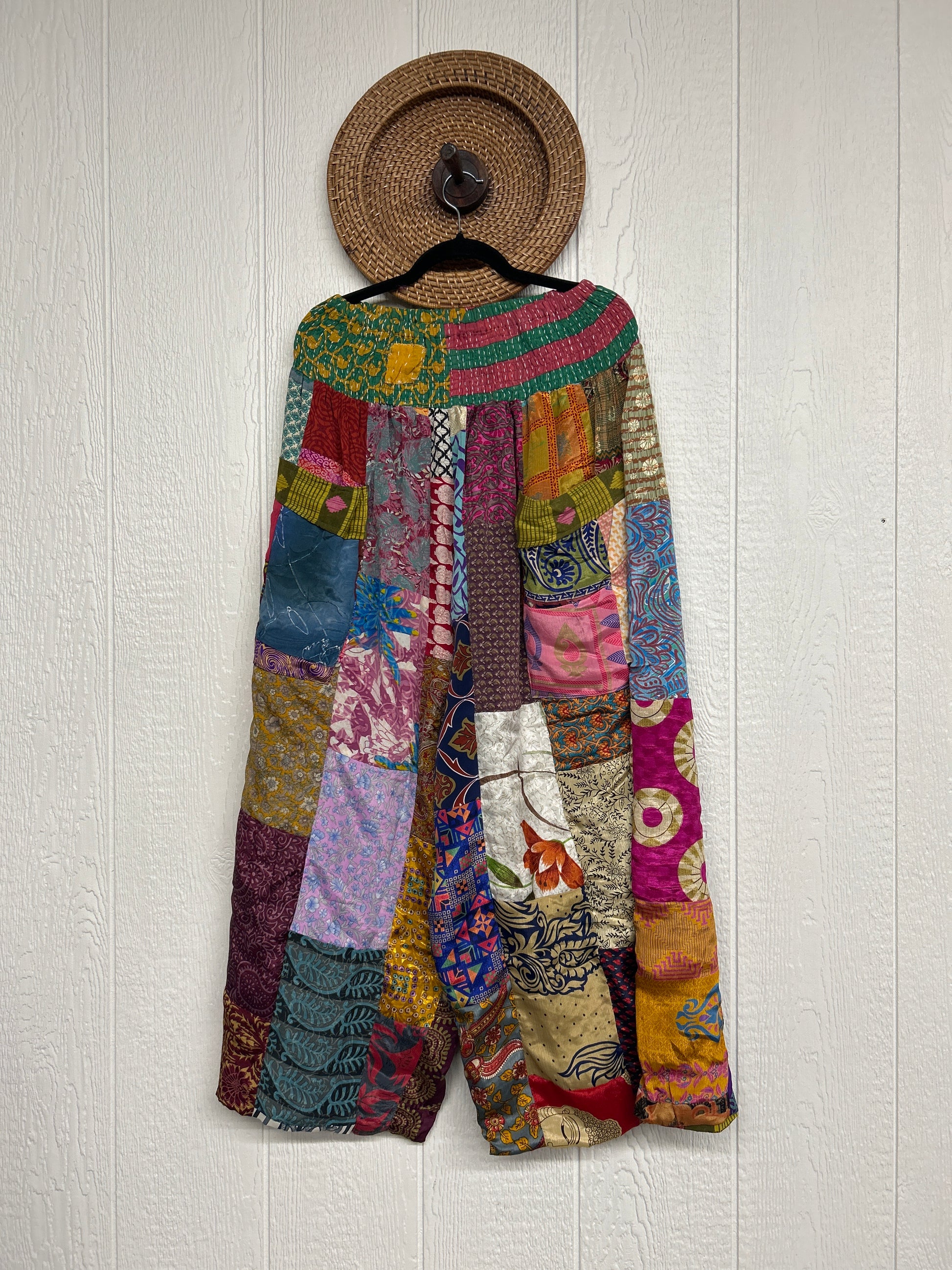 Features super wide legs that make your pants dance when you walk. Front slouchy pockets are deep enough to fill with your treasures. Vintage Rasgulla and Crepe Sari make up the beautiful patchwork featured on the outside with vintage cotton sari lining on the inside. Fully reversible and free size in all the ways!