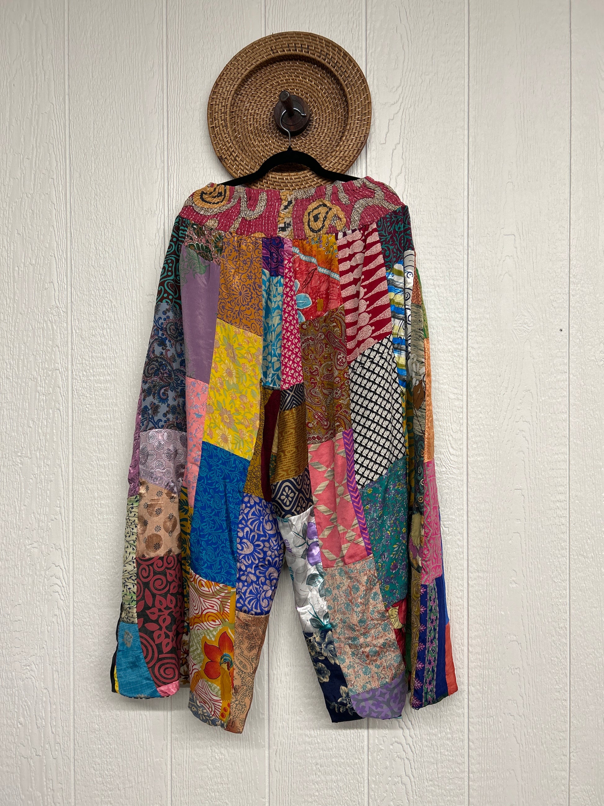 Features super wide legs that make your pants dance when you walk. Front slouchy pockets are deep enough to fill with your treasures. Vintage Rasgulla and Crepe Sari make up the beautiful patchwork featured on the outside with vintage cotton sari lining on the inside. Fully reversible and free size in all the ways!