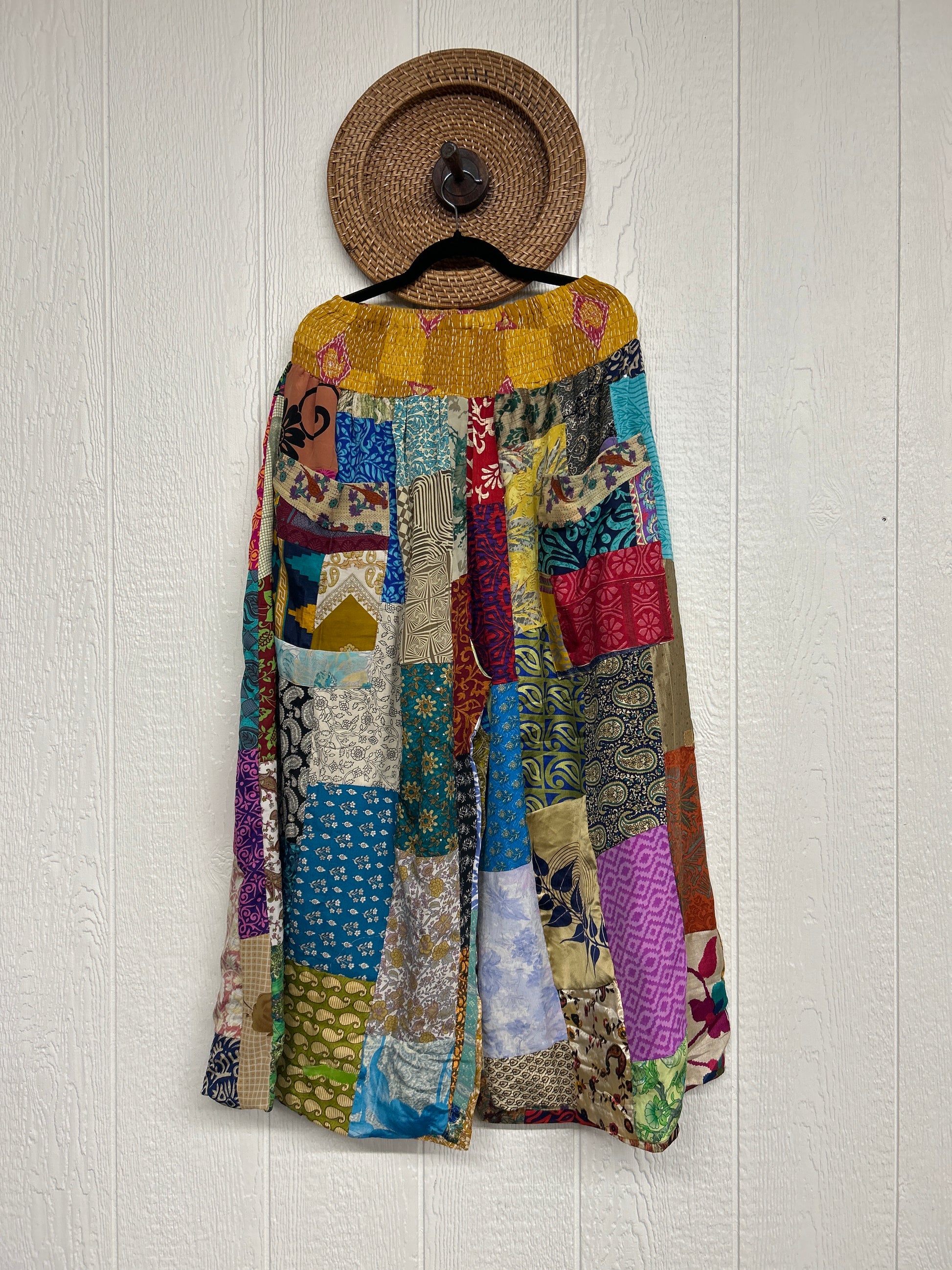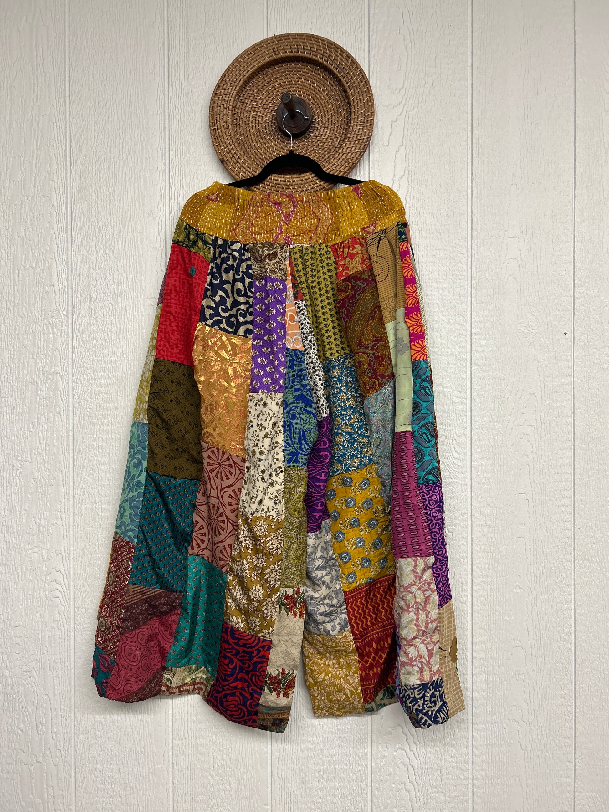 Features super wide legs that make your pants dance when you walk. Front slouchy pockets are deep enough to fill with your treasures. Vintage Rasgulla and Crepe Sari make up the beautiful patchwork featured on the outside with vintage cotton sari lining on the inside. Fully reversible and free size in all the ways!