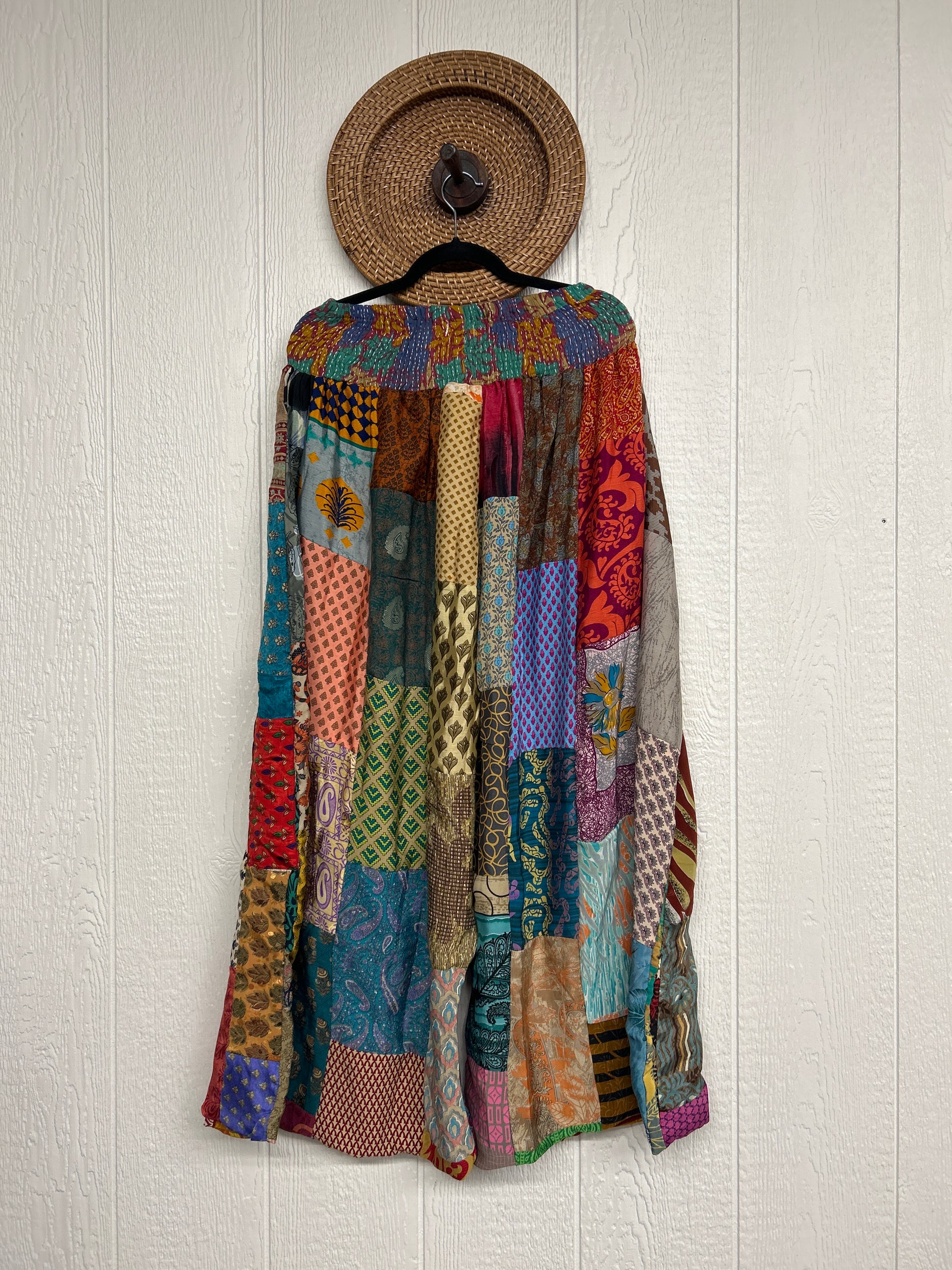 Features super wide legs that make your pants dance when you walk. Front slouchy pockets are deep enough to fill with your treasures. Vintage Rasgulla and Crepe Sari make up the beautiful patchwork featured on the outside with vintage cotton sari lining on the inside. Fully reversible and free size in all the ways!