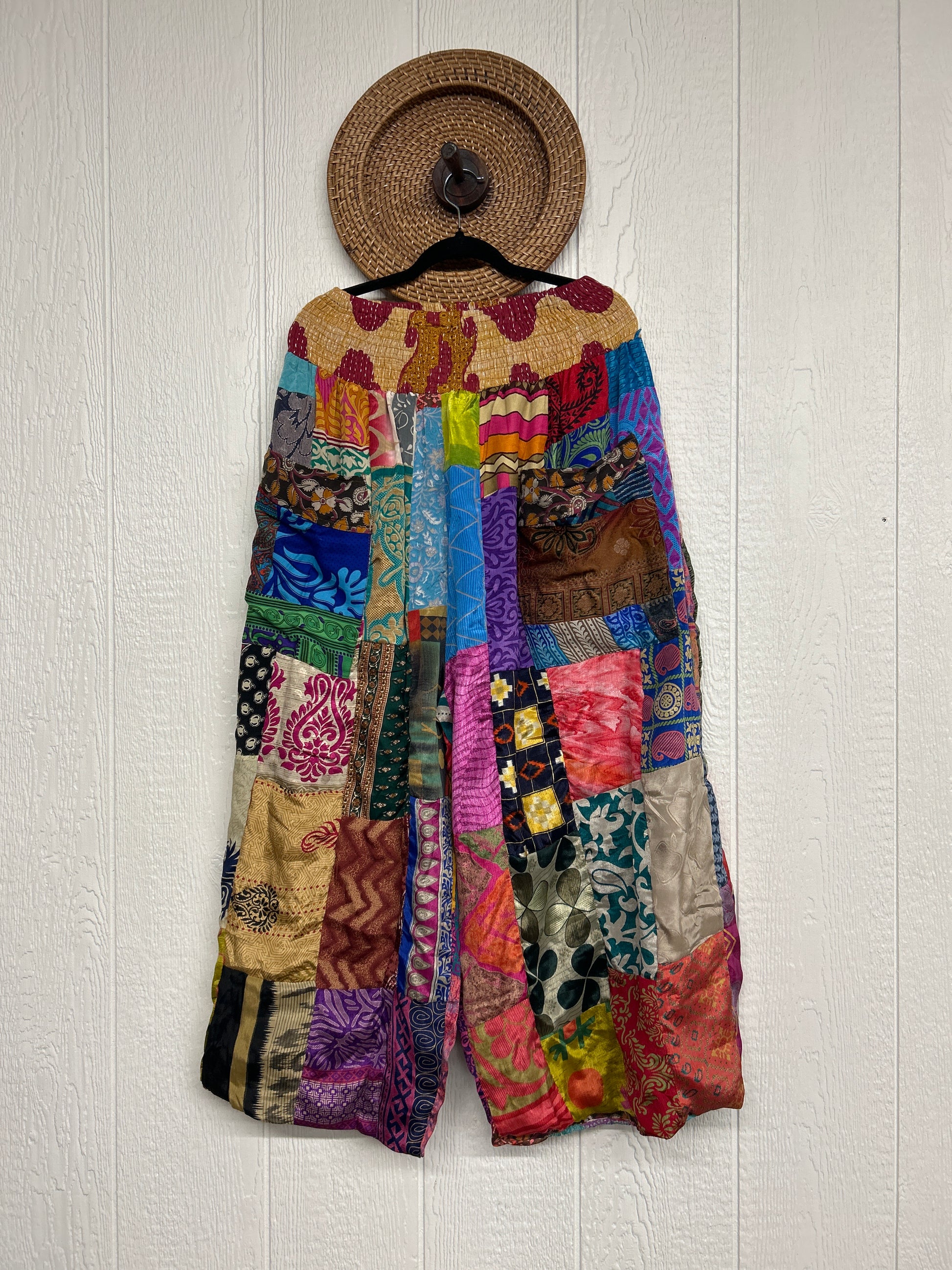 Features super wide legs that make your pants dance when you walk. Front slouchy pockets are deep enough to fill with your treasures. Vintage Rasgulla and Crepe Sari make up the beautiful patchwork featured on the outside with vintage cotton sari lining on the inside. Fully reversible and free size in all the ways!
