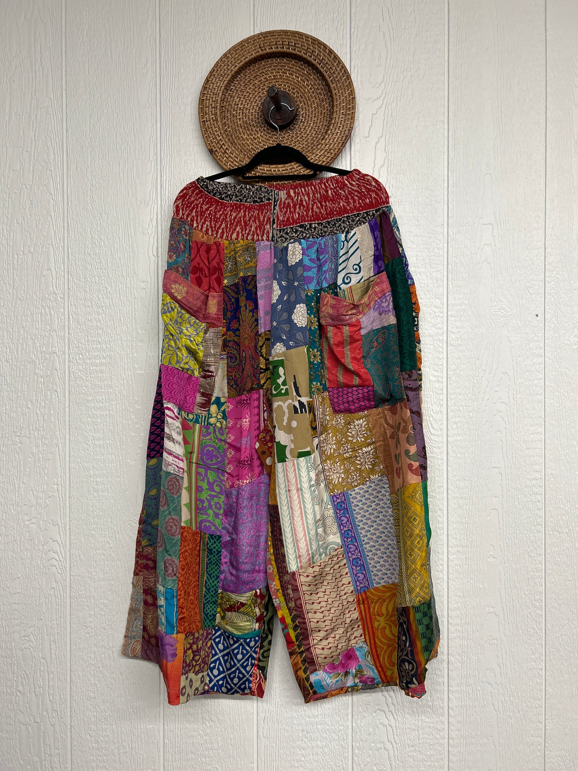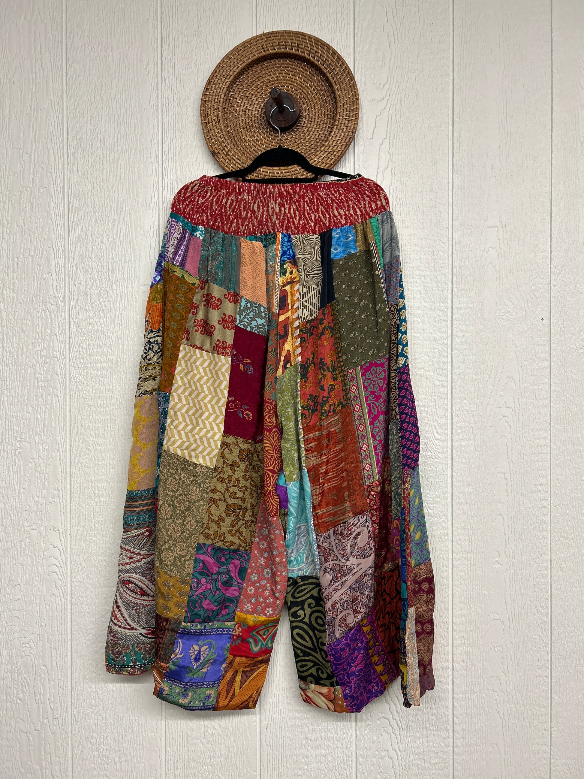 Features super wide legs that make your pants dance when you walk. Front slouchy pockets are deep enough to fill with your treasures. Vintage Rasgulla and Crepe Sari make up the beautiful patchwork featured on the outside with vintage cotton sari lining on the inside. Fully reversible and free size in all the ways!