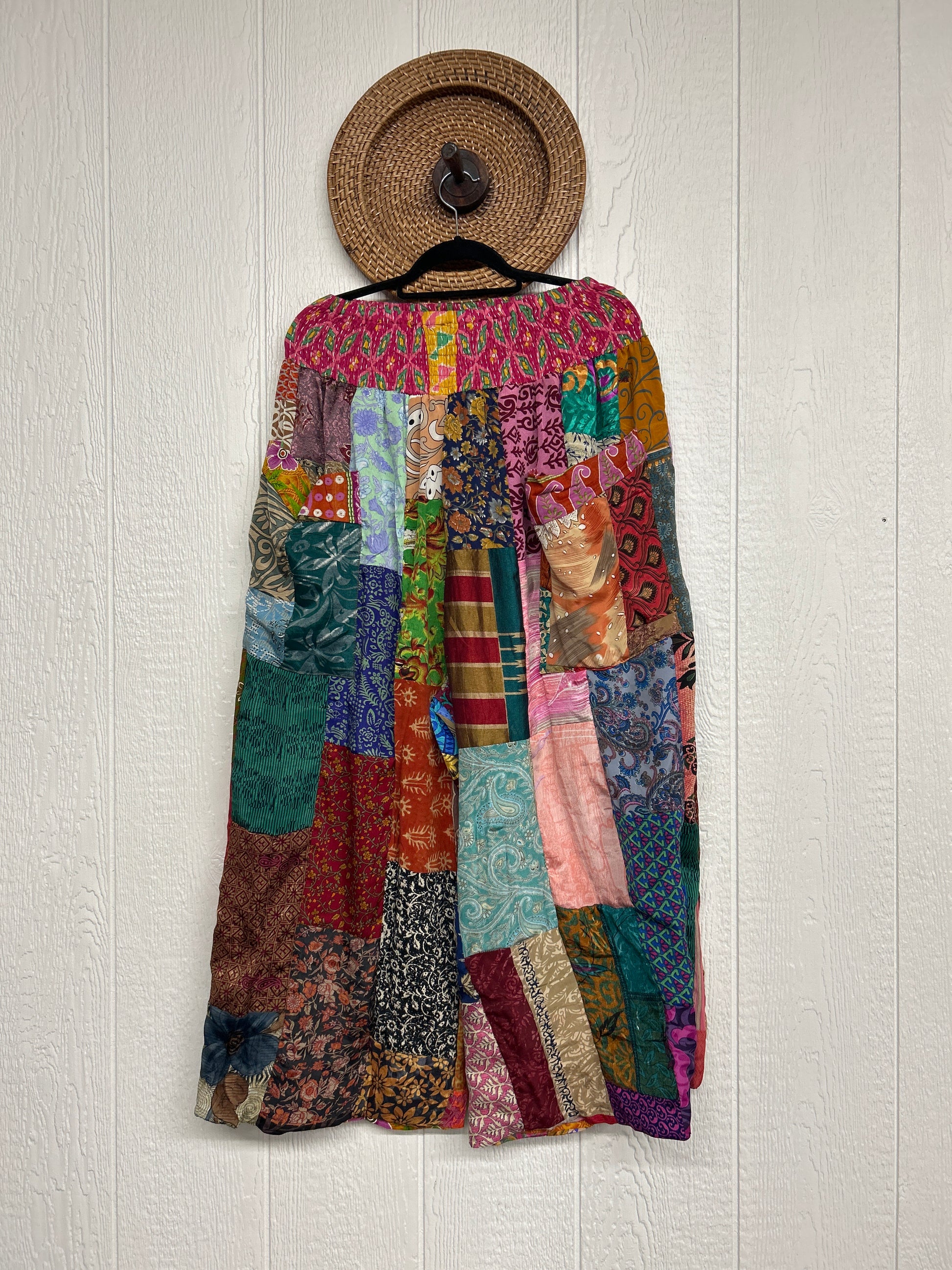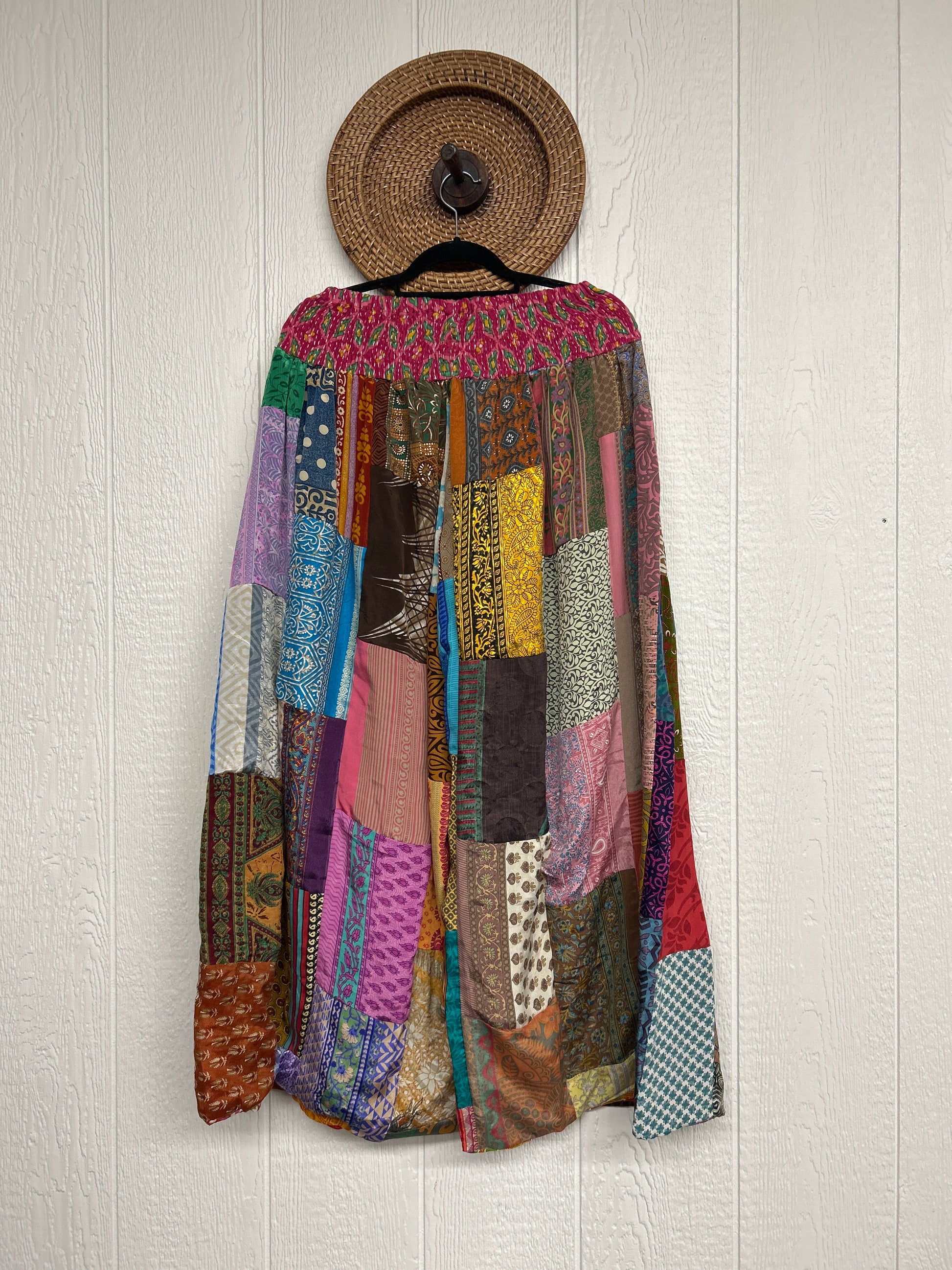 Features super wide legs that make your pants dance when you walk. Front slouchy pockets are deep enough to fill with your treasures. Vintage Rasgulla and Crepe Sari make up the beautiful patchwork featured on the outside with vintage cotton sari lining on the inside. Fully reversible and free size in all the ways!