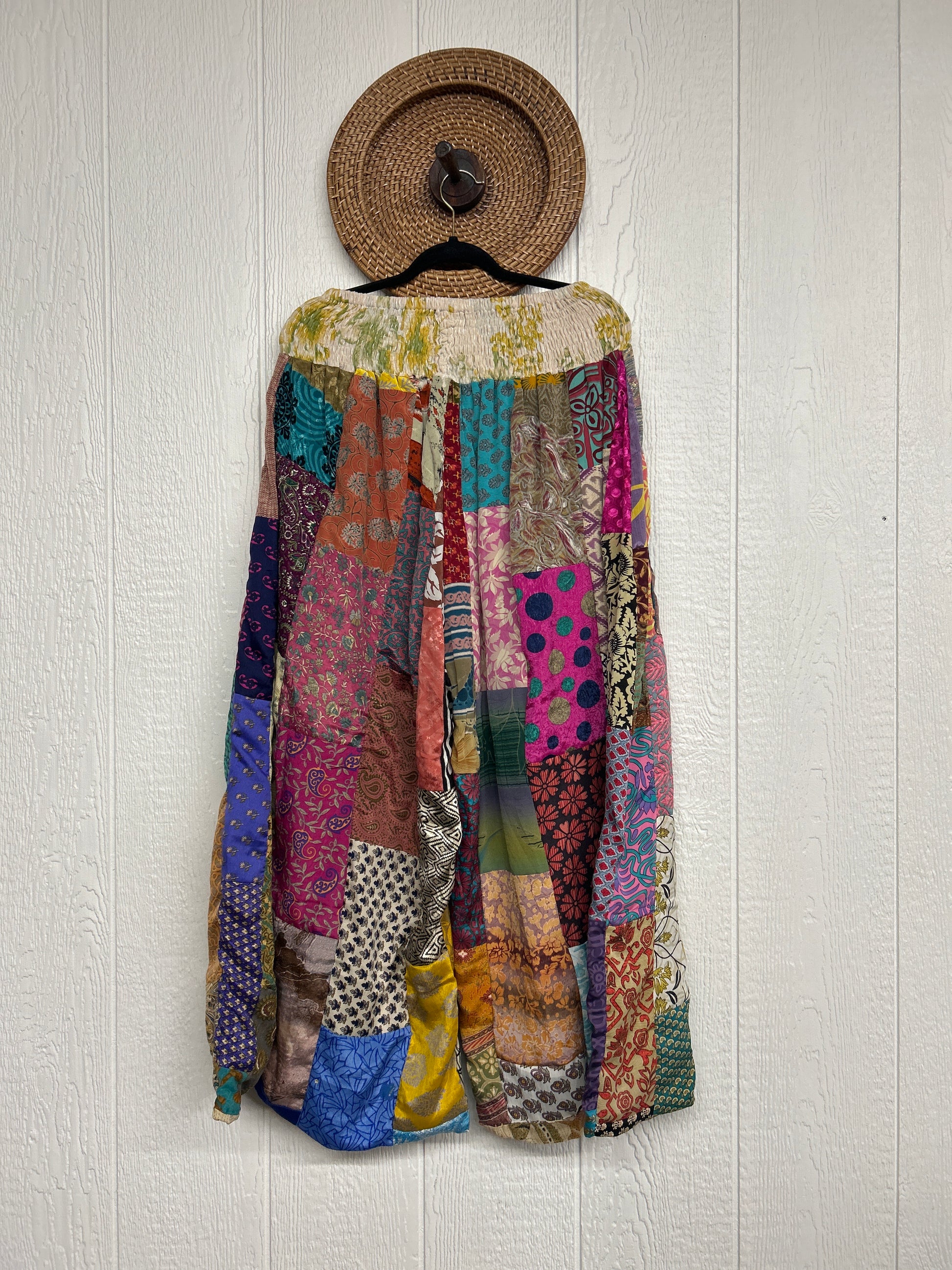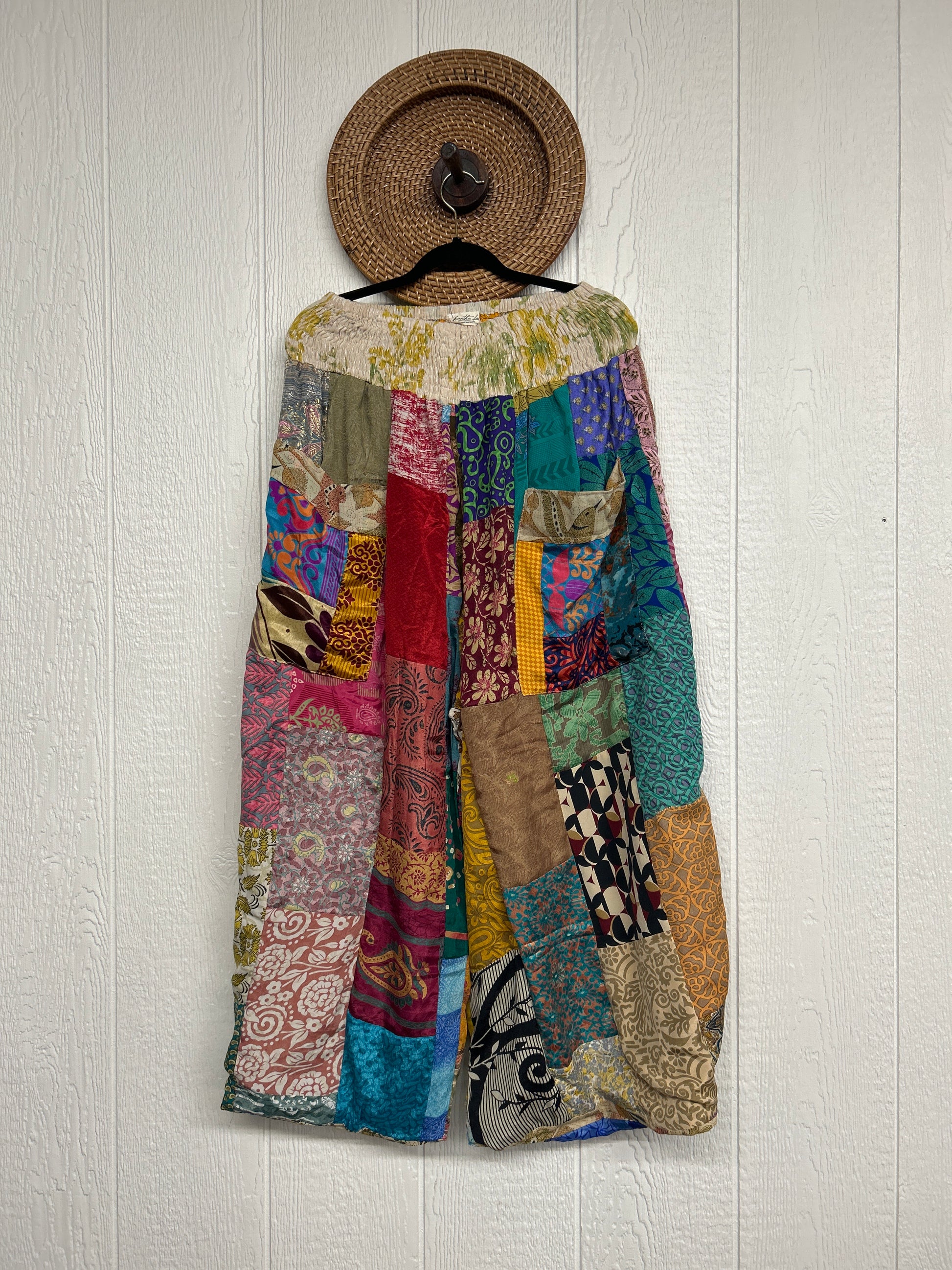 Features super wide legs that make your pants dance when you walk. Front slouchy pockets are deep enough to fill with your treasures. Vintage Rasgulla and Crepe Sari make up the beautiful patchwork featured on the outside with vintage cotton sari lining on the inside. Fully reversible and free size in all the ways!