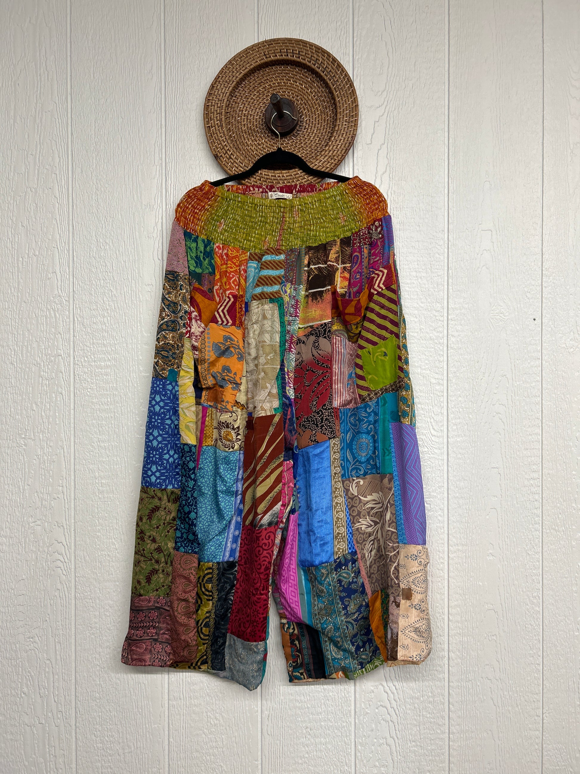 Features super wide legs that make your pants dance when you walk. Front slouchy pockets are deep enough to fill with your treasures. Vintage Rasgulla and Crepe Sari make up the beautiful patchwork featured on the outside with vintage cotton sari lining on the inside. Fully reversible and free size in all the ways!