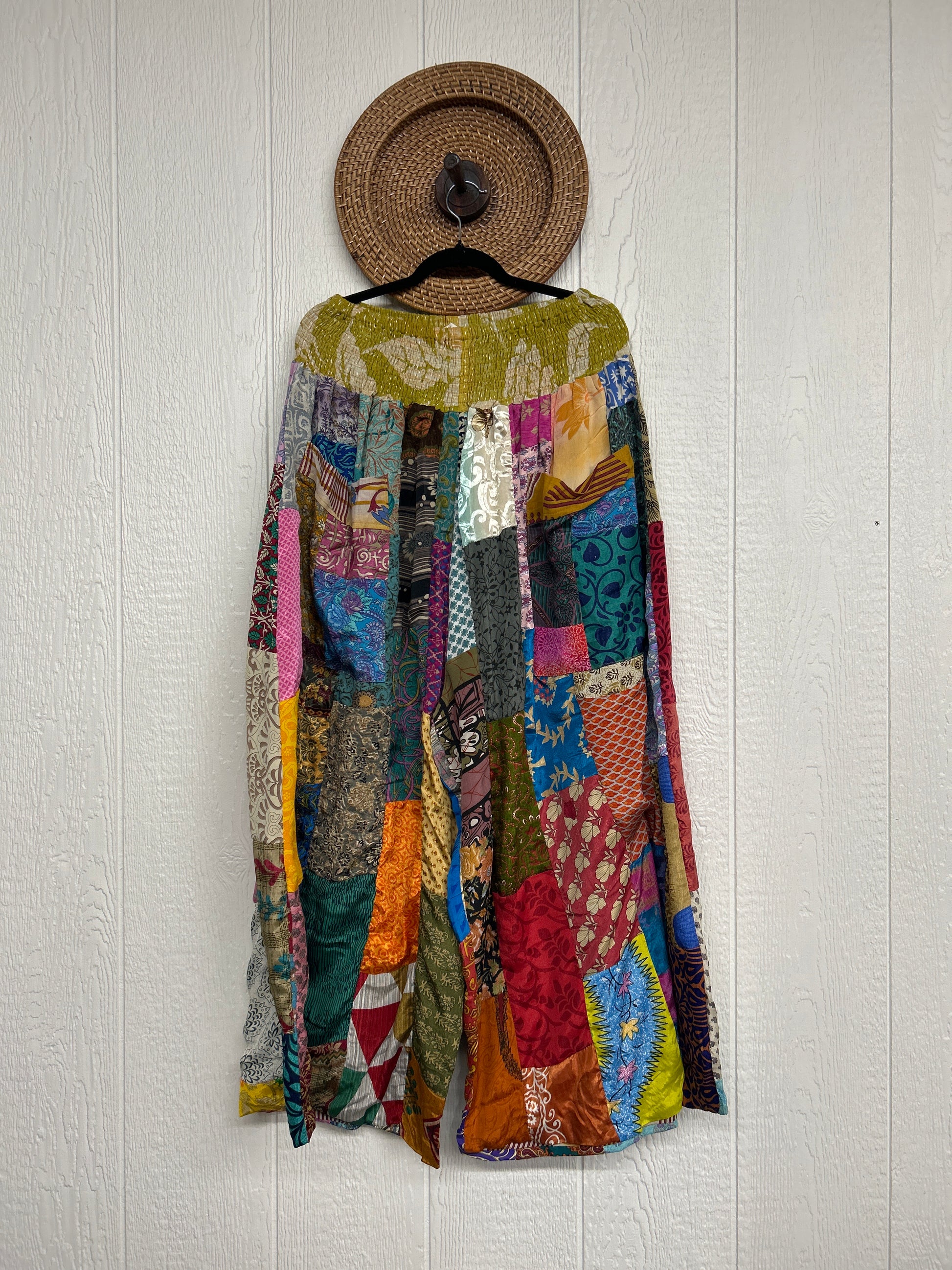 Features super wide legs that make your pants dance when you walk. Front slouchy pockets are deep enough to fill with your treasures. Vintage Rasgulla and Crepe Sari make up the beautiful patchwork featured on the outside with vintage cotton sari lining on the inside. Fully reversible and free size in all the ways!