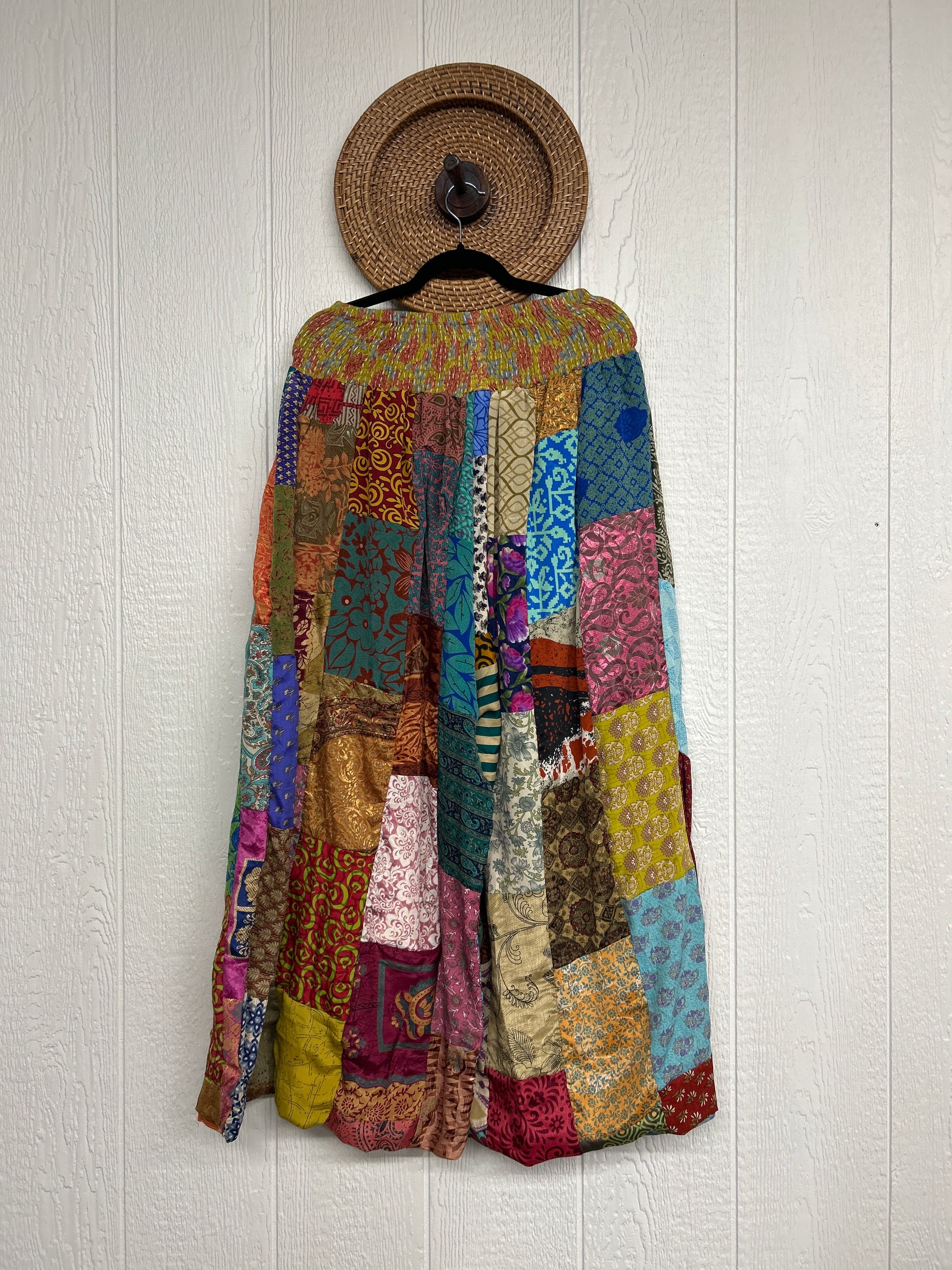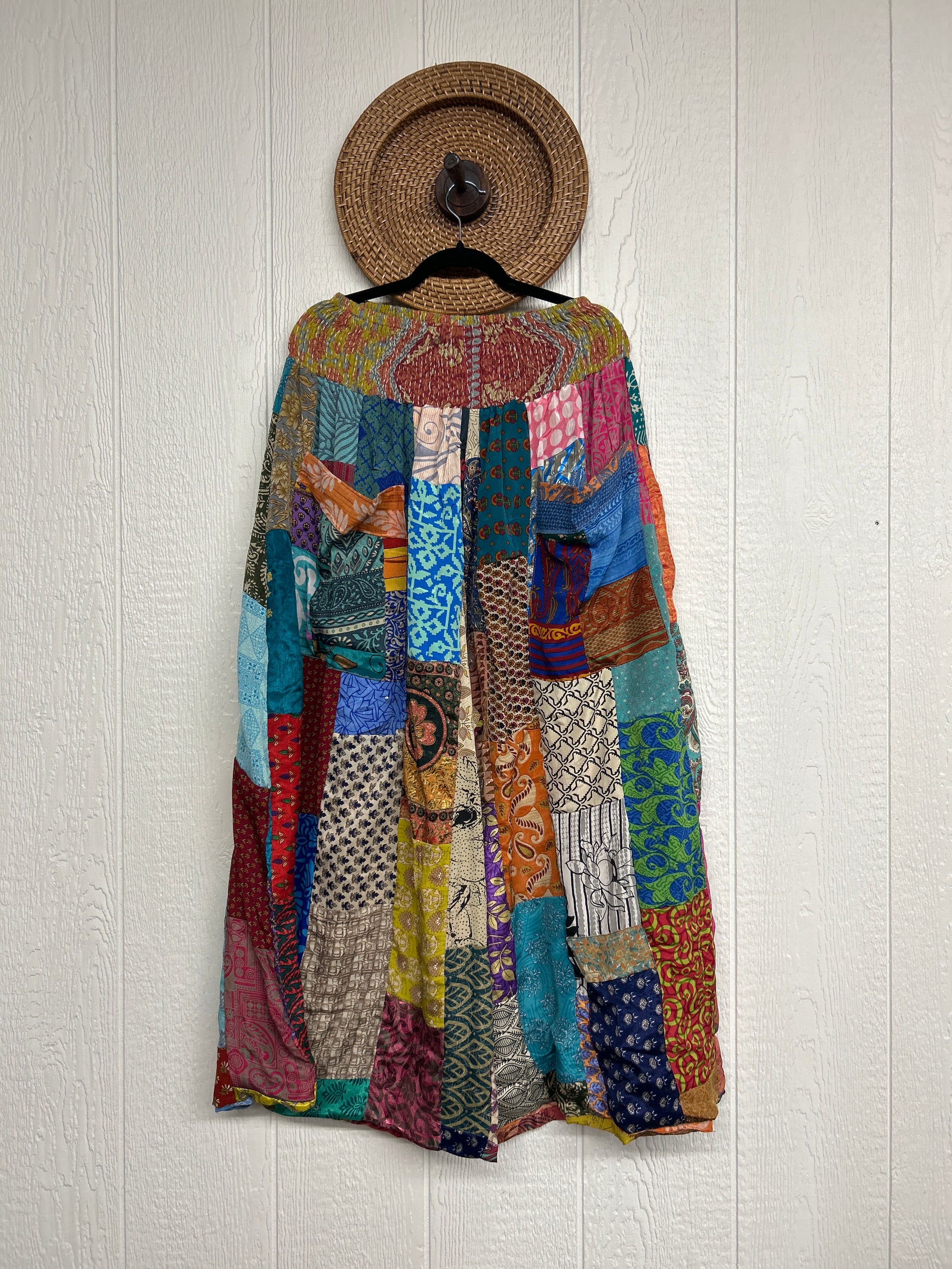 Features super wide legs that make your pants dance when you walk. Front slouchy pockets are deep enough to fill with your treasures. Vintage Rasgulla and Crepe Sari make up the beautiful patchwork featured on the outside with vintage cotton sari lining on the inside. Fully reversible and free size in all the ways!