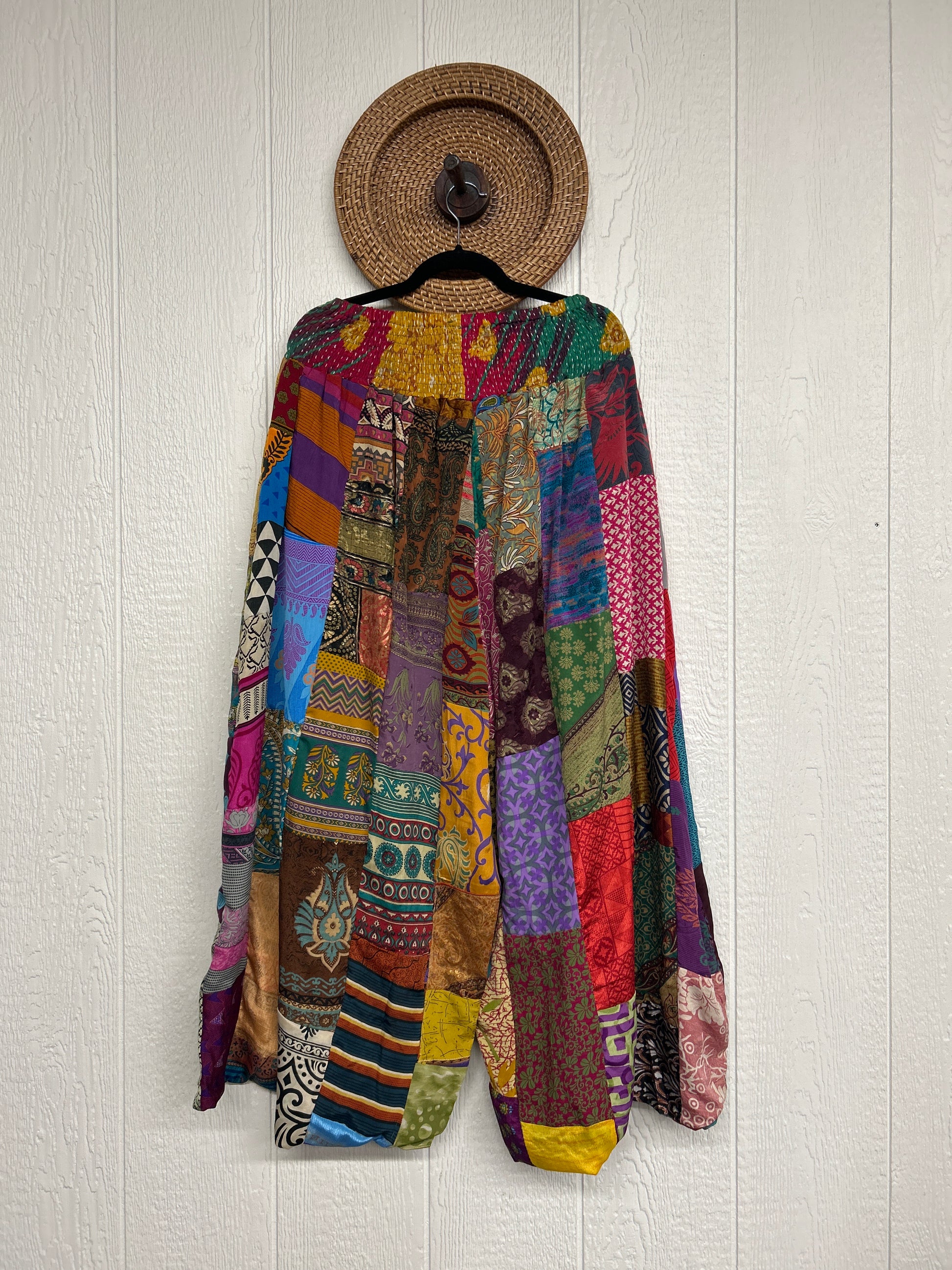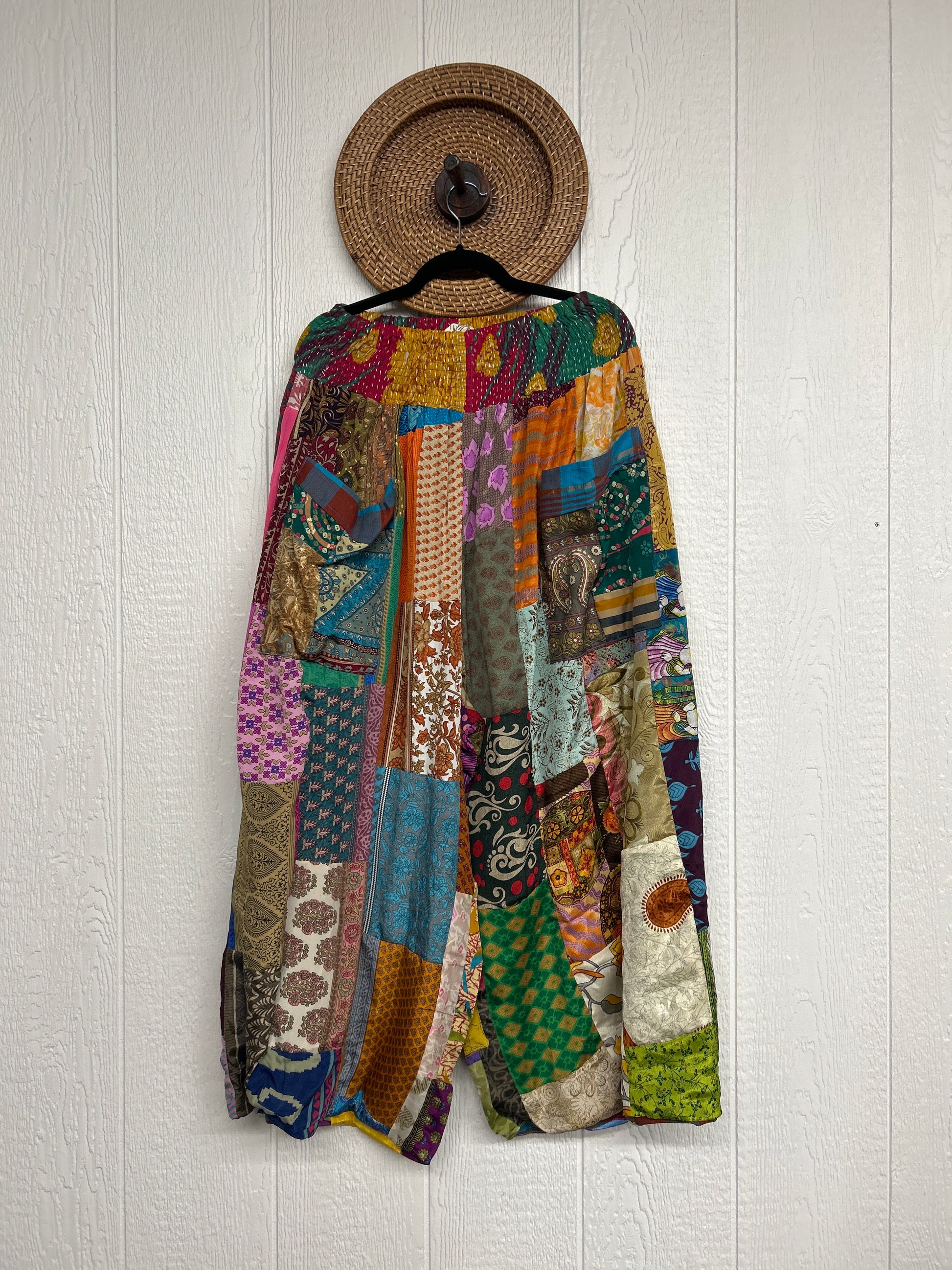 Features super wide legs that make your pants dance when you walk. Front slouchy pockets are deep enough to fill with your treasures. Vintage Rasgulla and Crepe Sari make up the beautiful patchwork featured on the outside with vintage cotton sari lining on the inside. Fully reversible and free size in all the ways!