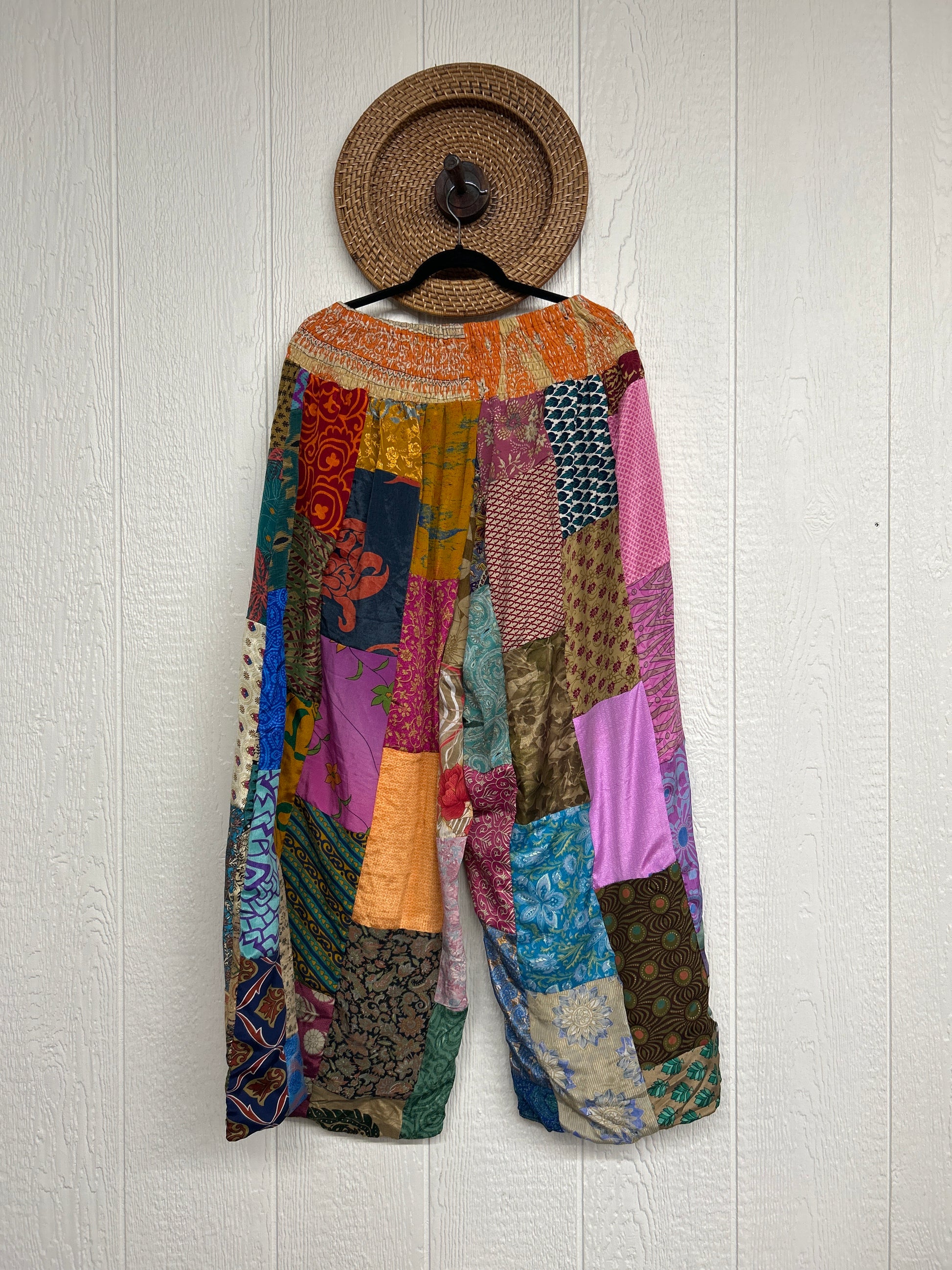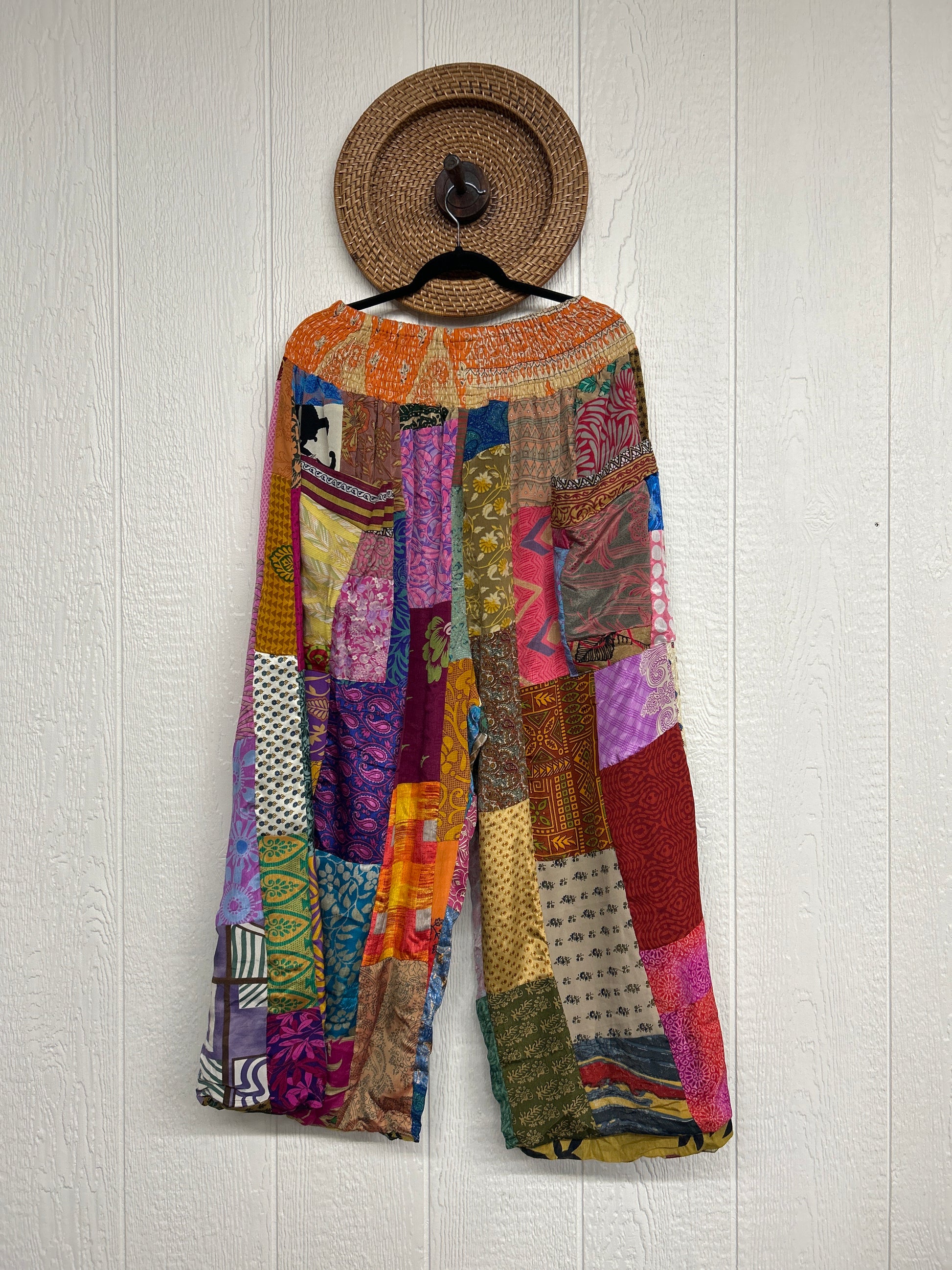 Features super wide legs that make your pants dance when you walk. Front slouchy pockets are deep enough to fill with your treasures. Vintage Rasgulla and Crepe Sari make up the beautiful patchwork featured on the outside with vintage cotton sari lining on the inside. Fully reversible and free size in all the ways!
