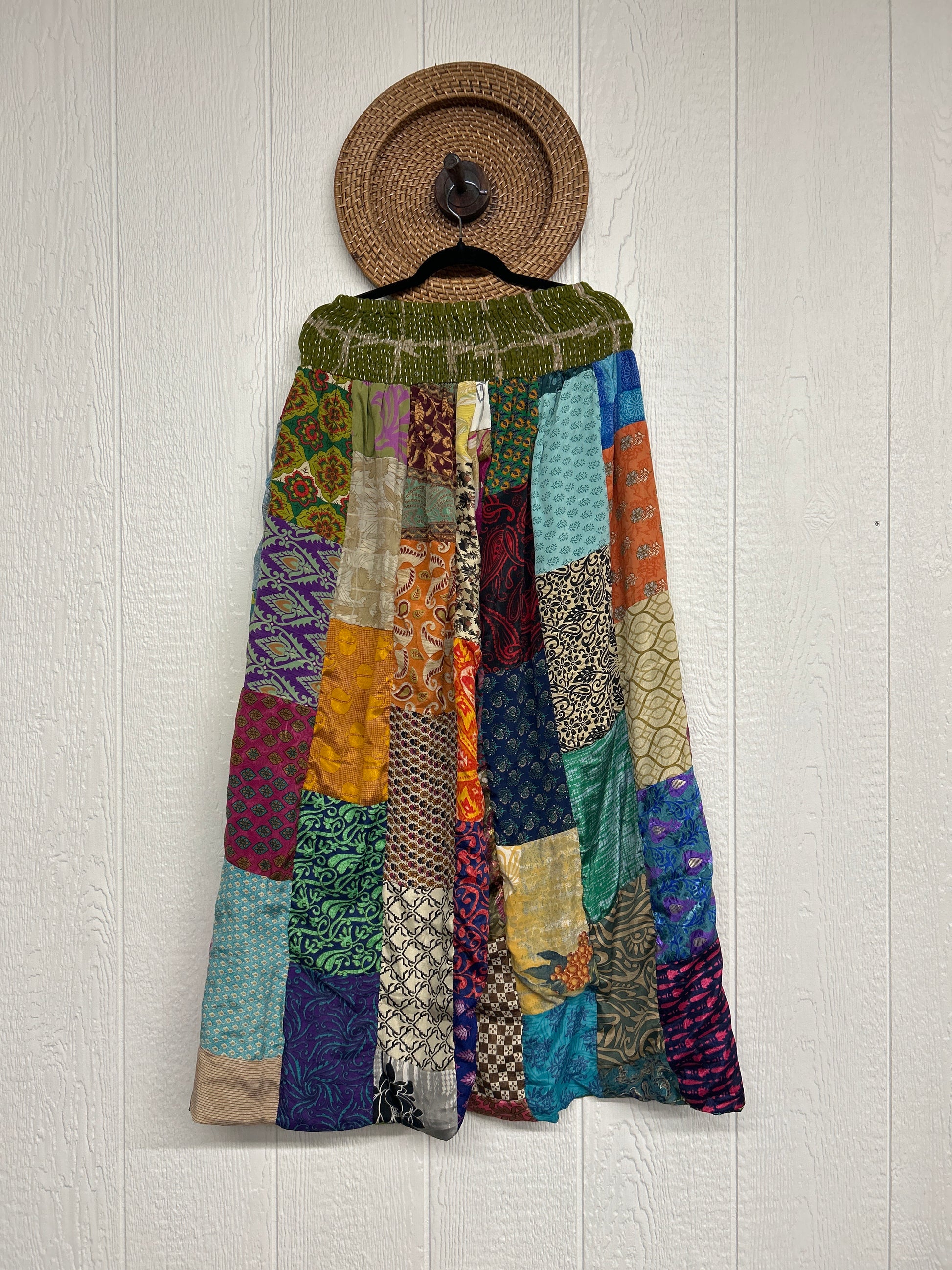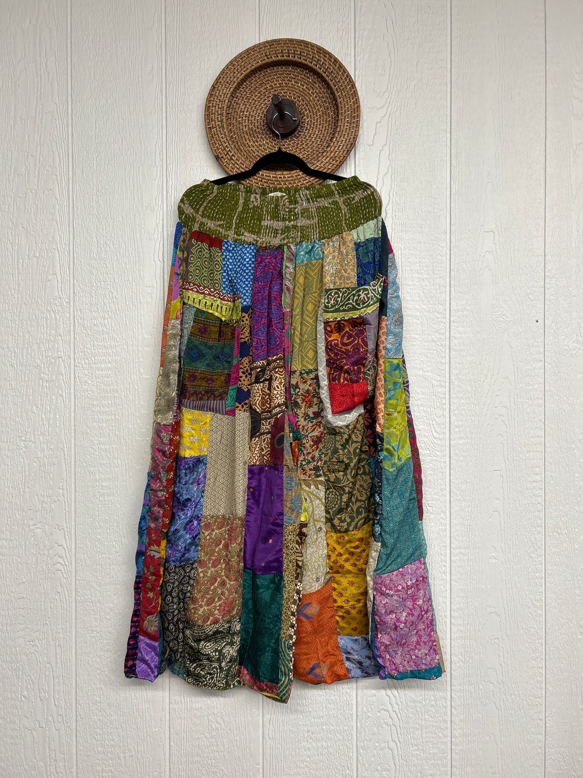 Features super wide legs that make your pants dance when you walk. Front slouchy pockets are deep enough to fill with your treasures. Vintage Rasgulla and Crepe Sari make up the beautiful patchwork featured on the outside with vintage cotton sari lining on the inside. Fully reversible and free size in all the ways!