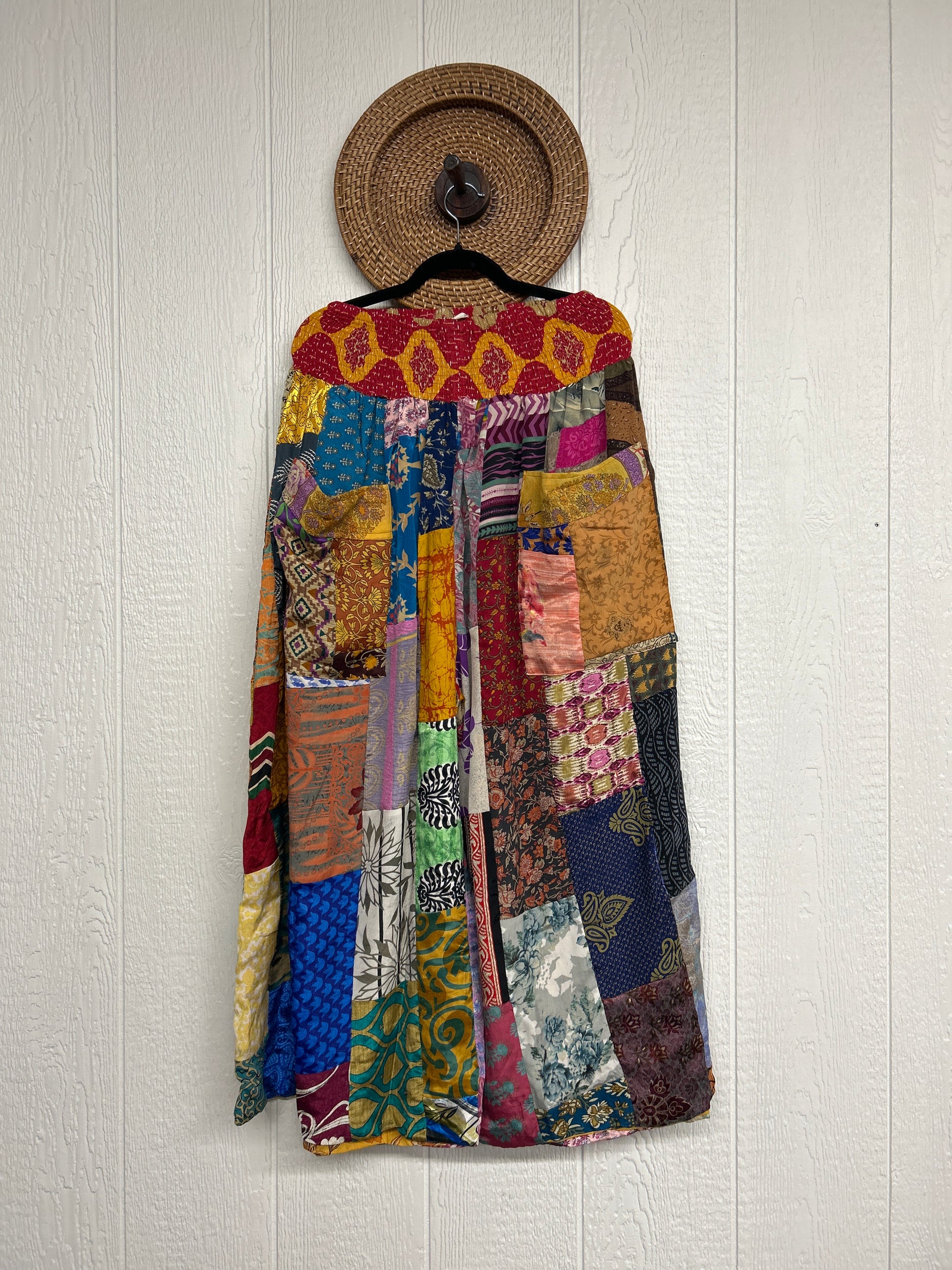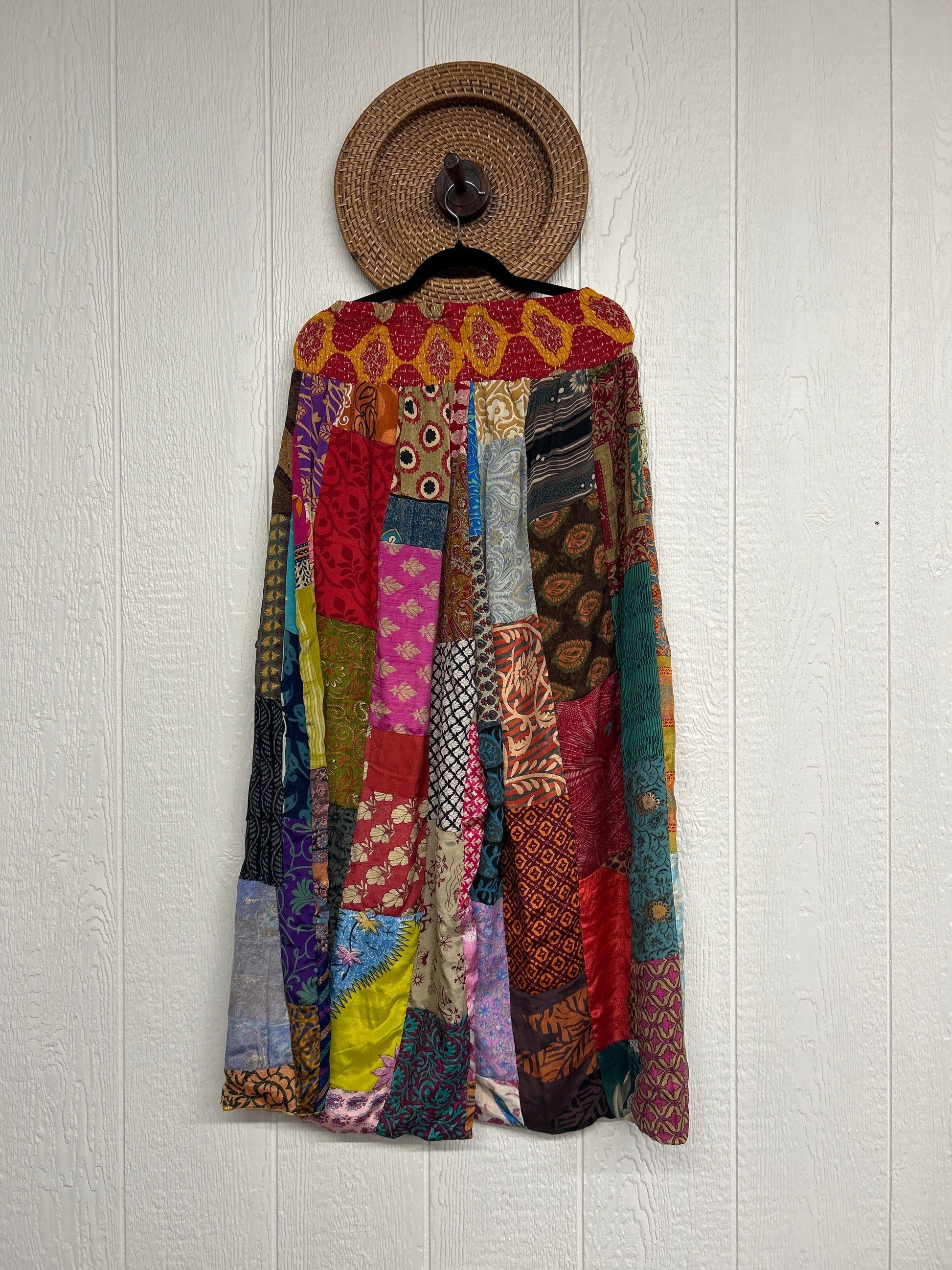 Features super wide legs that make your pants dance when you walk. Front slouchy pockets are deep enough to fill with your treasures. Vintage Rasgulla and Crepe Sari make up the beautiful patchwork featured on the outside with vintage cotton sari lining on the inside. Fully reversible and free size in all the ways!