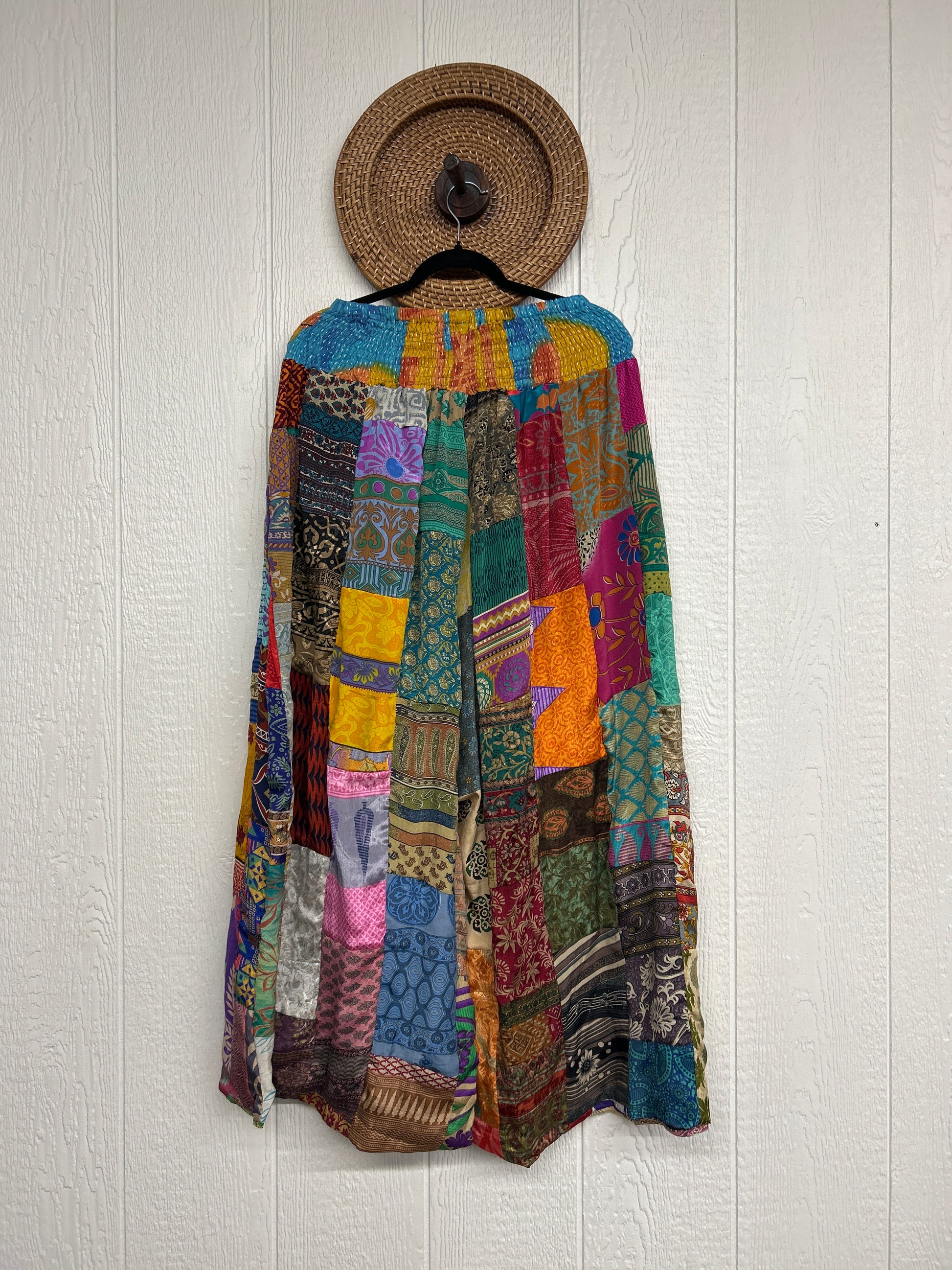 Features super wide legs that make your pants dance when you walk. Front slouchy pockets are deep enough to fill with your treasures. Vintage Rasgulla and Crepe Sari make up the beautiful patchwork featured on the outside with vintage cotton sari lining on the inside. Fully reversible and free size in all the ways!