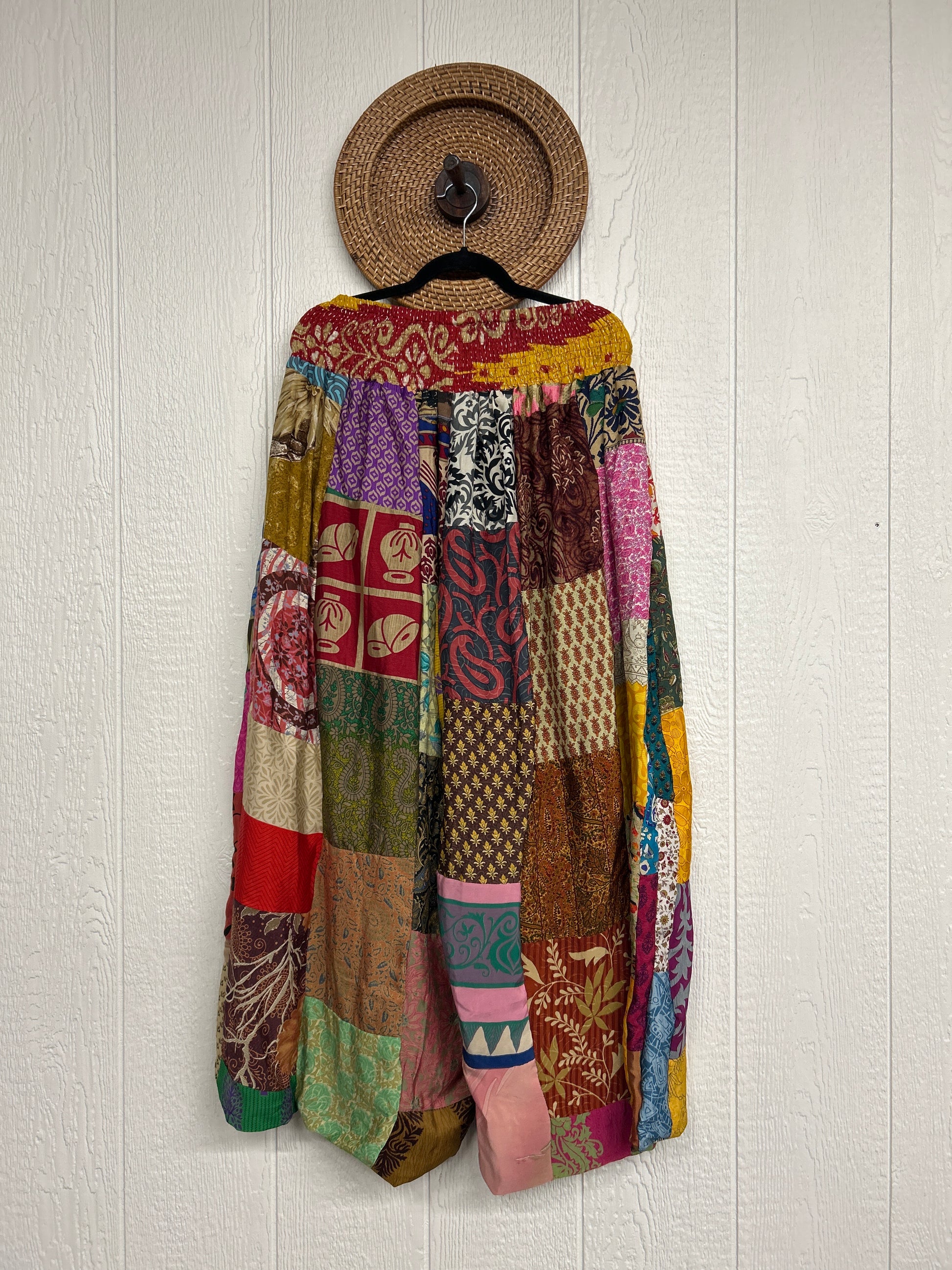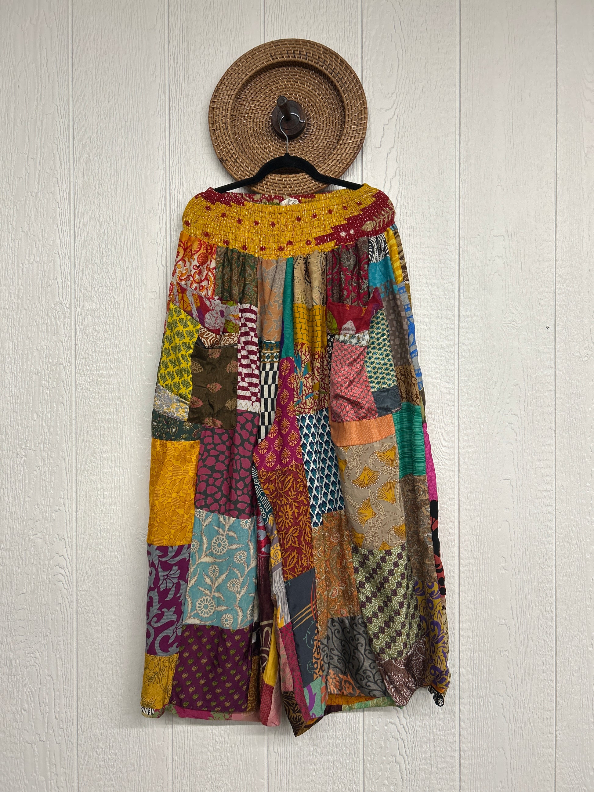 Features super wide legs that make your pants dance when you walk. Front slouchy pockets are deep enough to fill with your treasures. Vintage Rasgulla and Crepe Sari make up the beautiful patchwork featured on the outside with vintage cotton sari lining on the inside. Fully reversible and free size in all the ways!