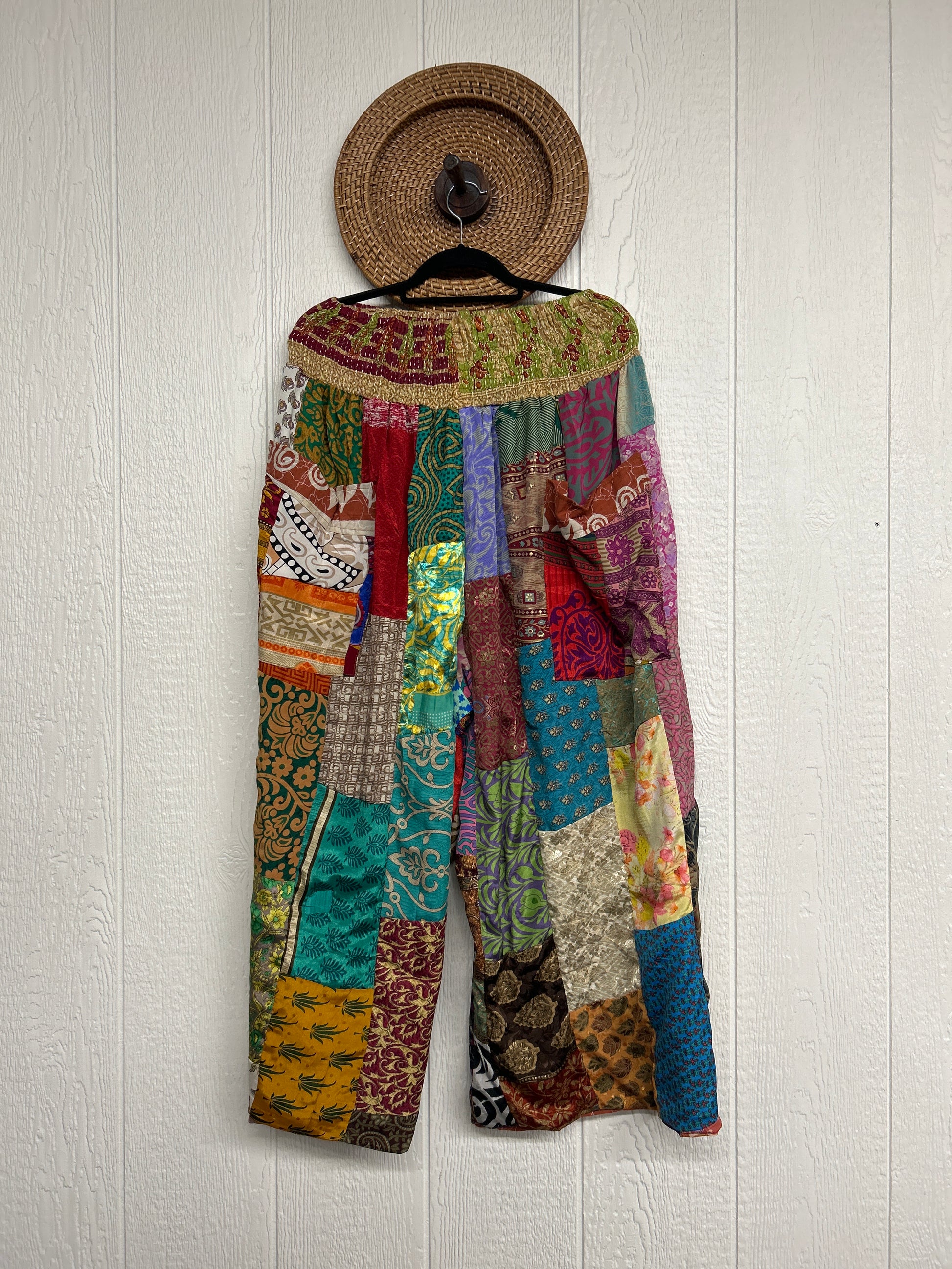 Features super wide legs that make your pants dance when you walk. Front slouchy pockets are deep enough to fill with your treasures. Vintage Rasgulla and Crepe Sari make up the beautiful patchwork featured on the outside with vintage cotton sari lining on the inside. Fully reversible and free size in all the ways!